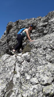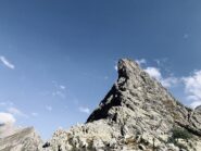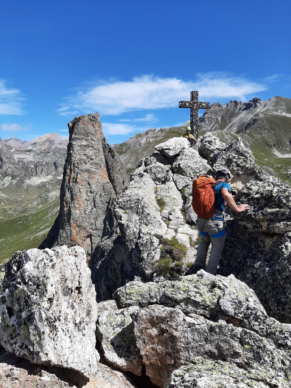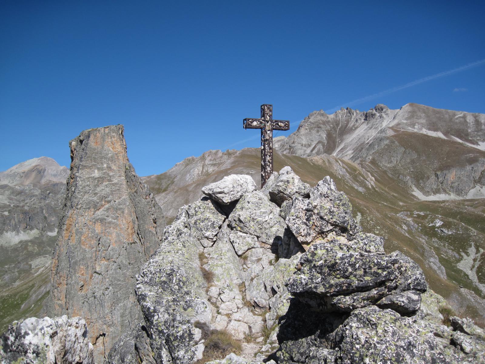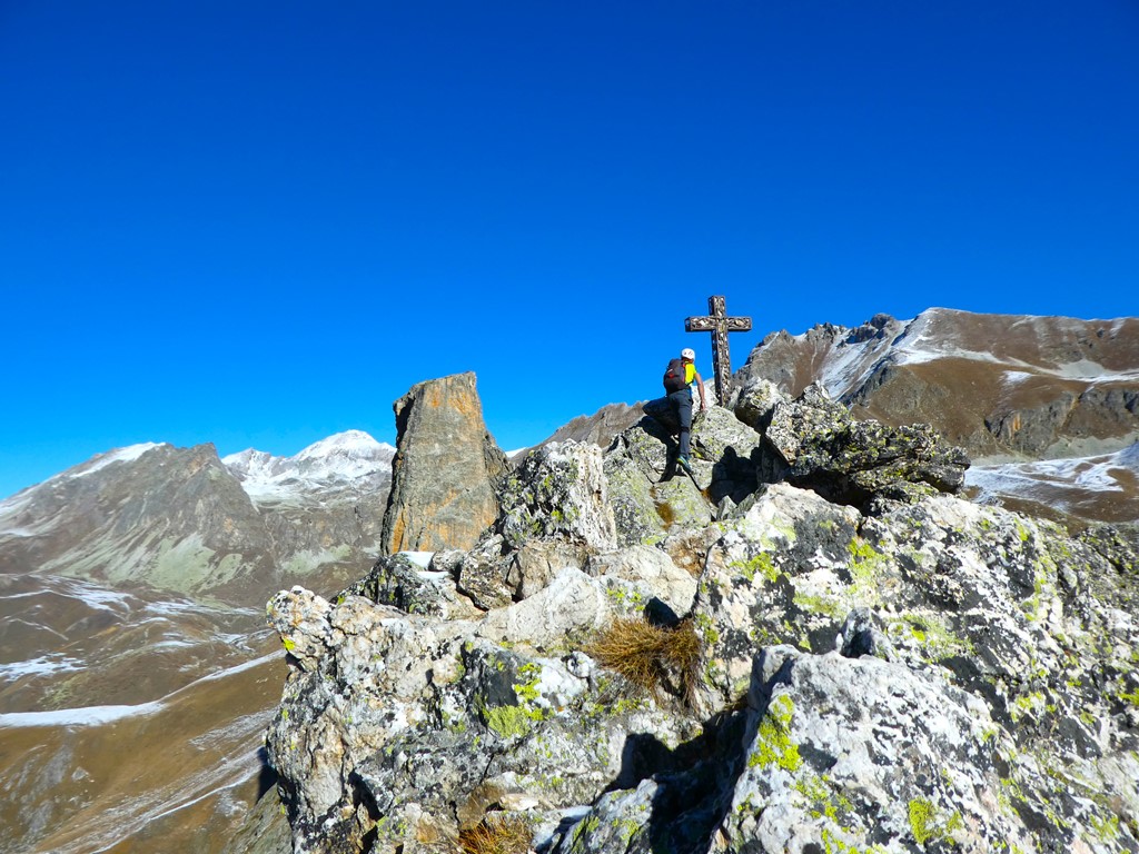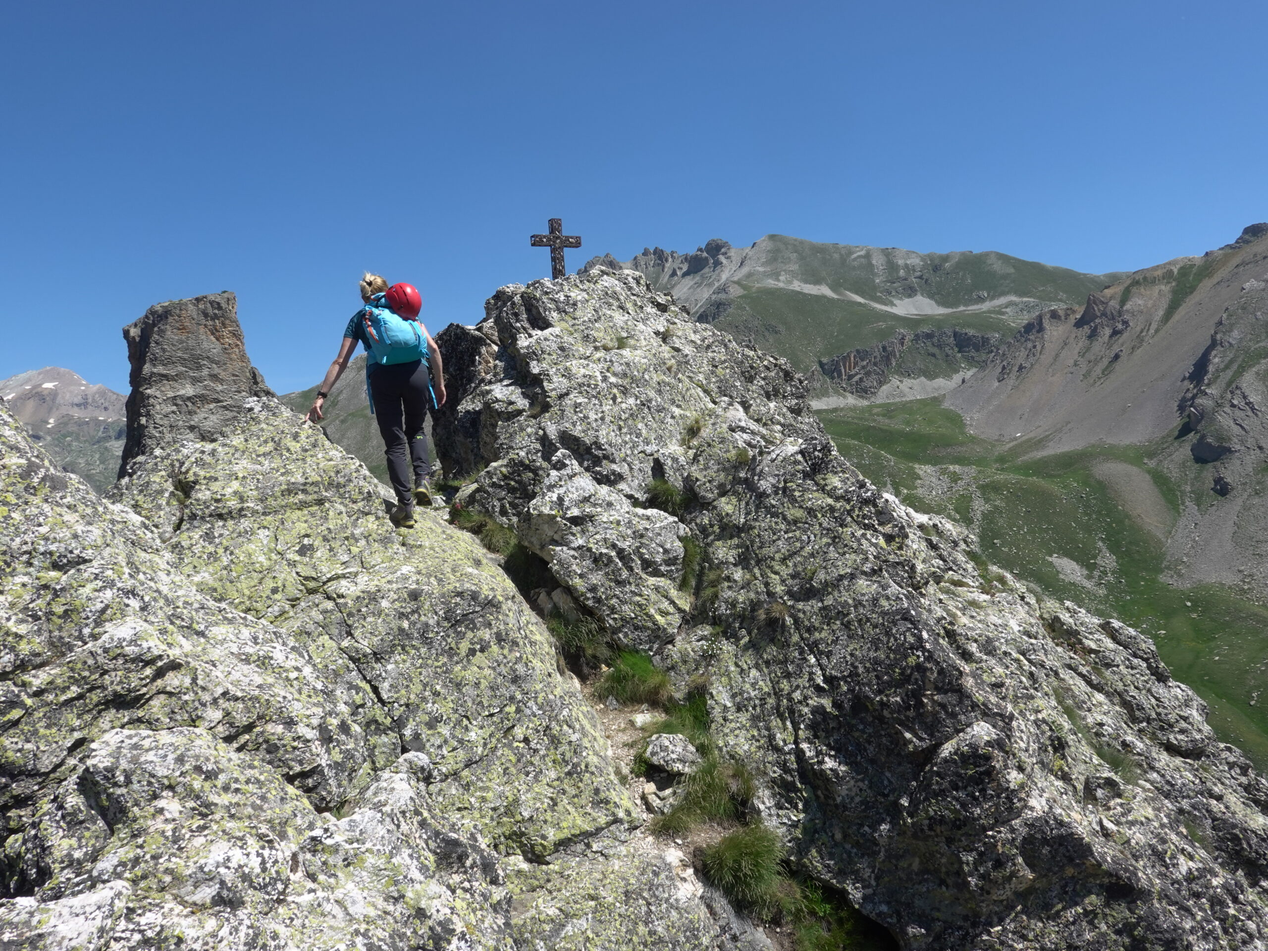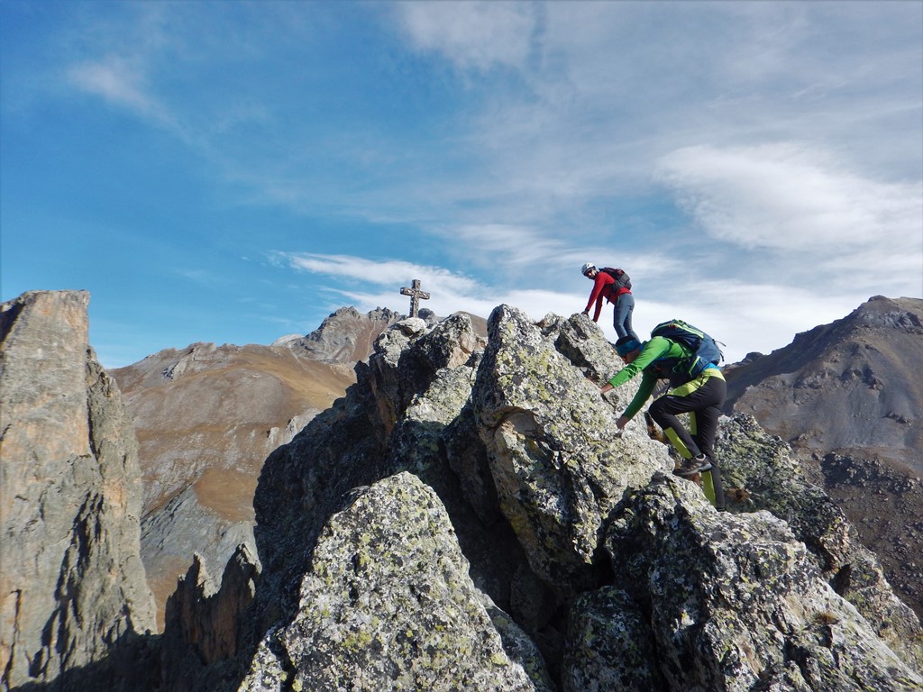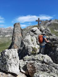 Salendo per più facili rocce si esce sull’affilata crestina finale. Pochi passi per l’esposto filo conducono infine alla grande croce della cima.