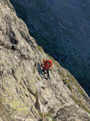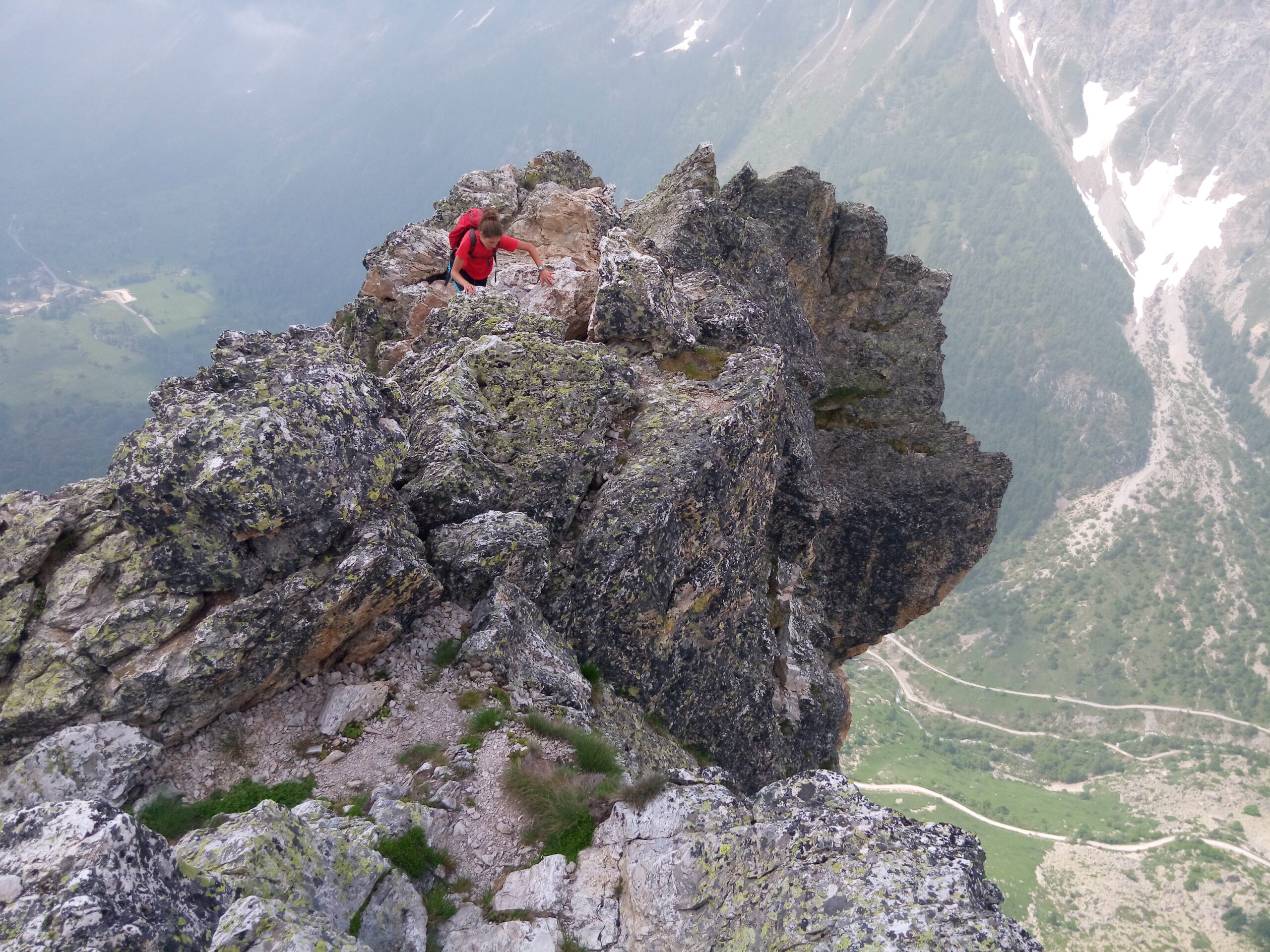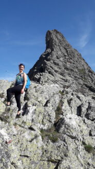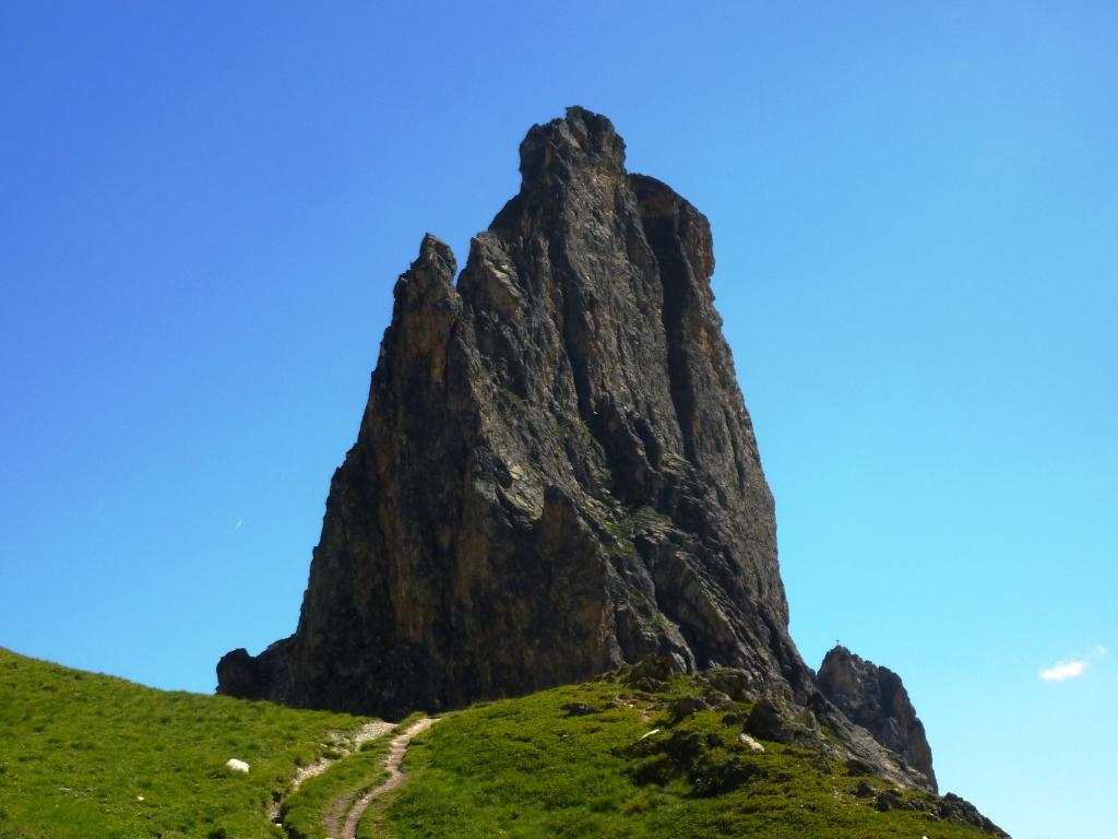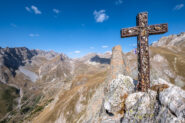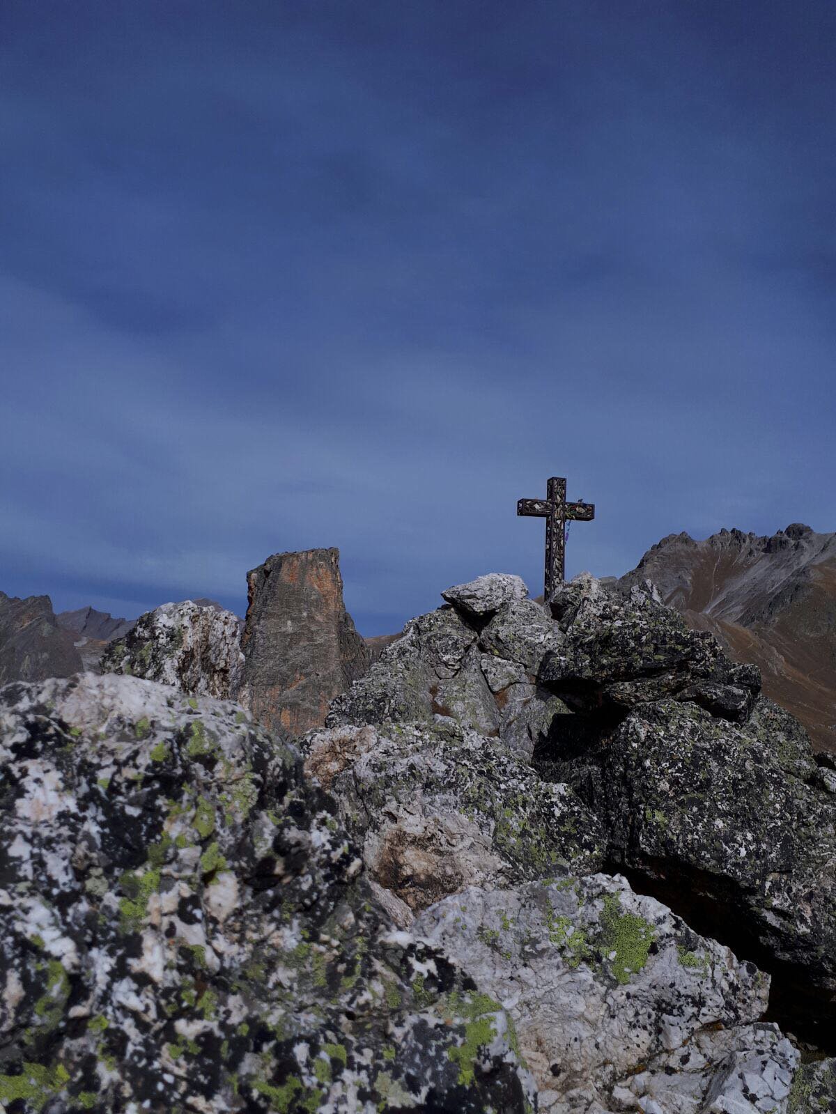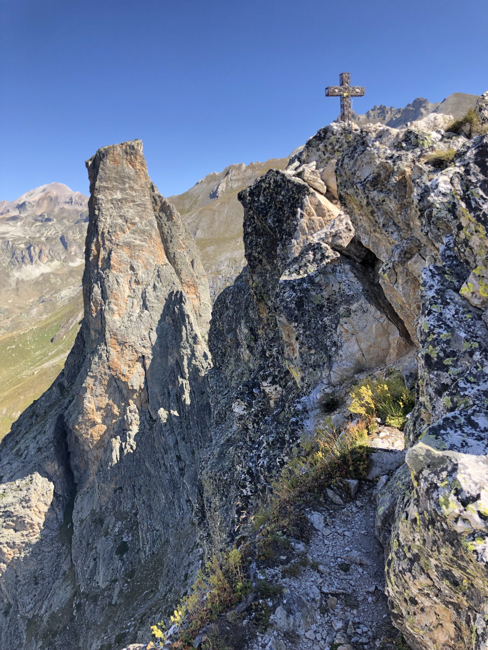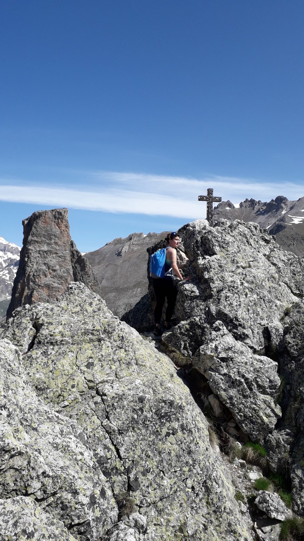 Salendo per più facili rocce si esce sull’affilata crestina finale. Pochi passi per l’esposto filo conducono infine alla grande croce della cima.