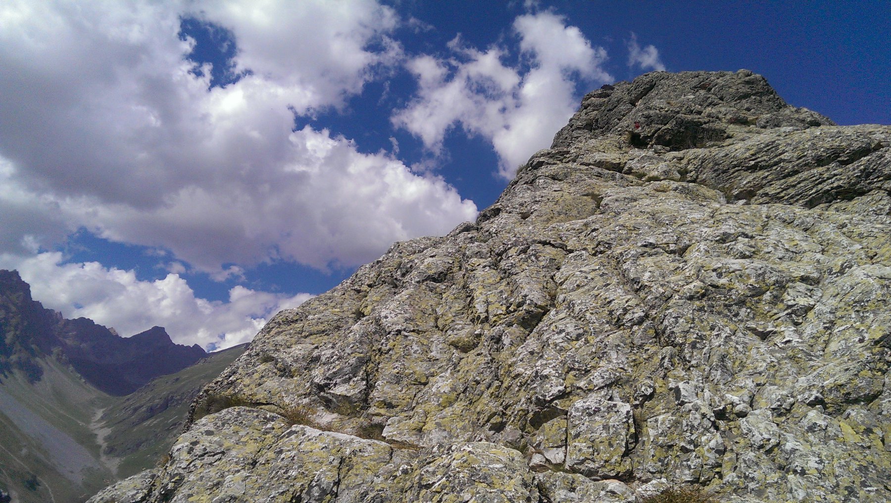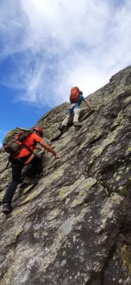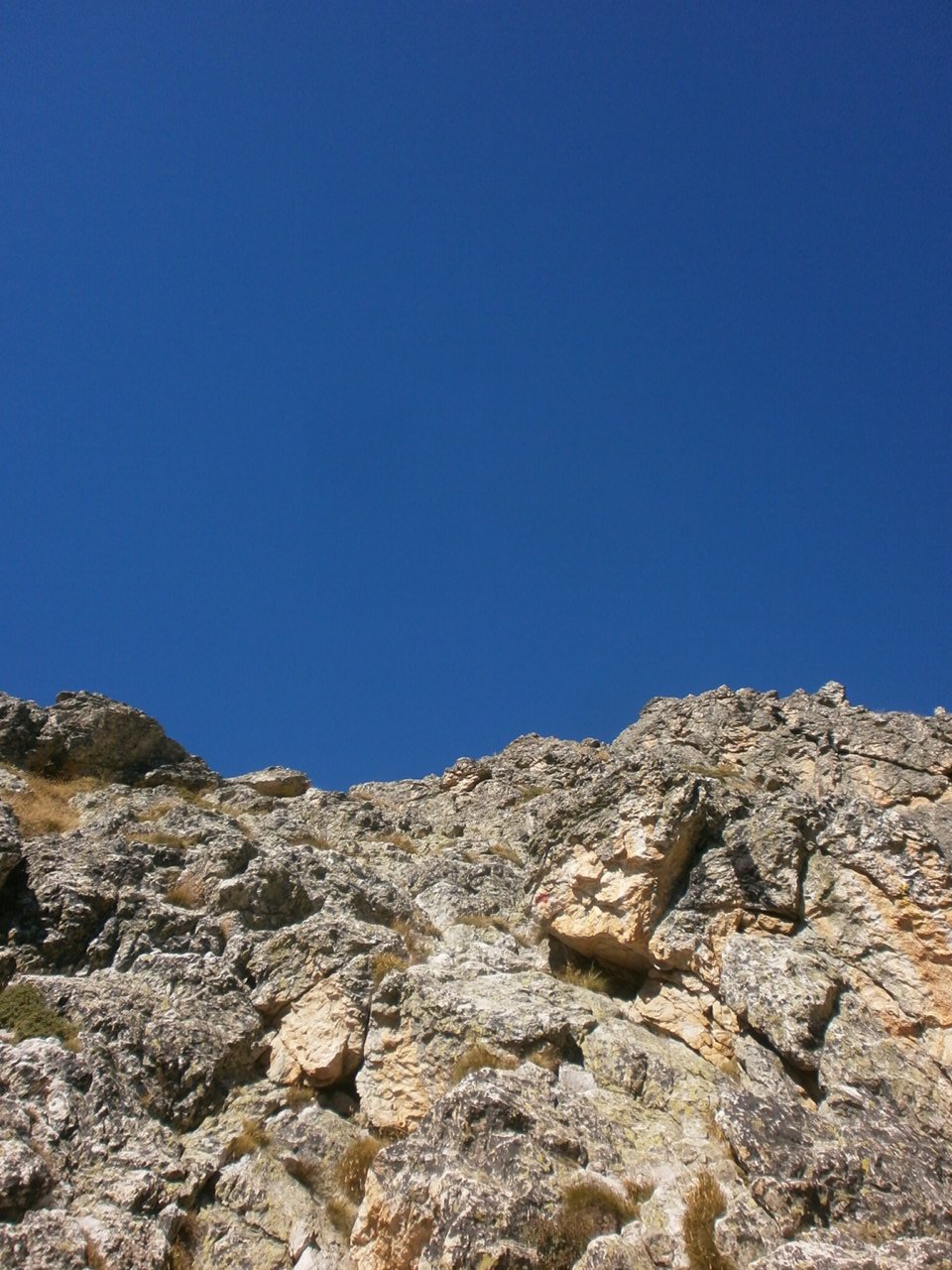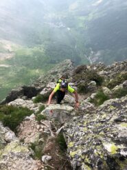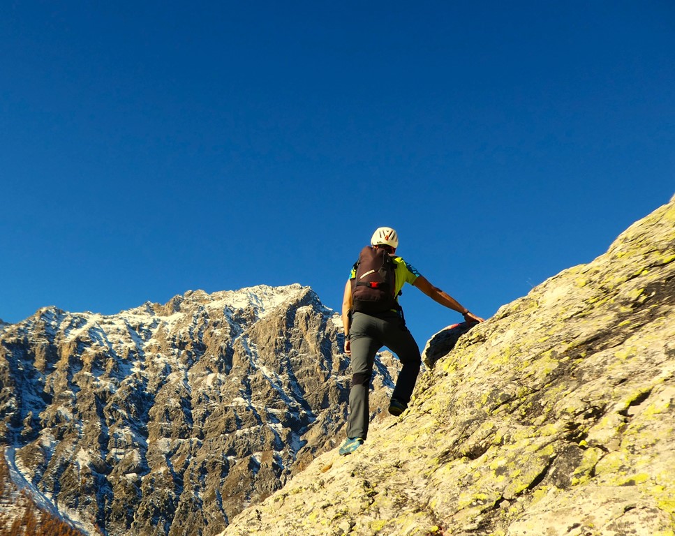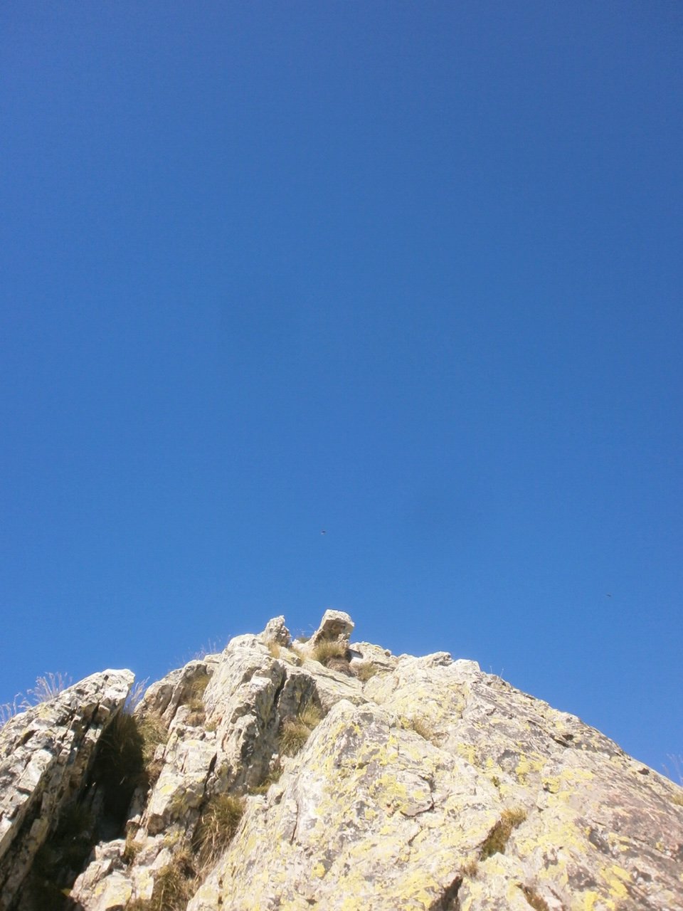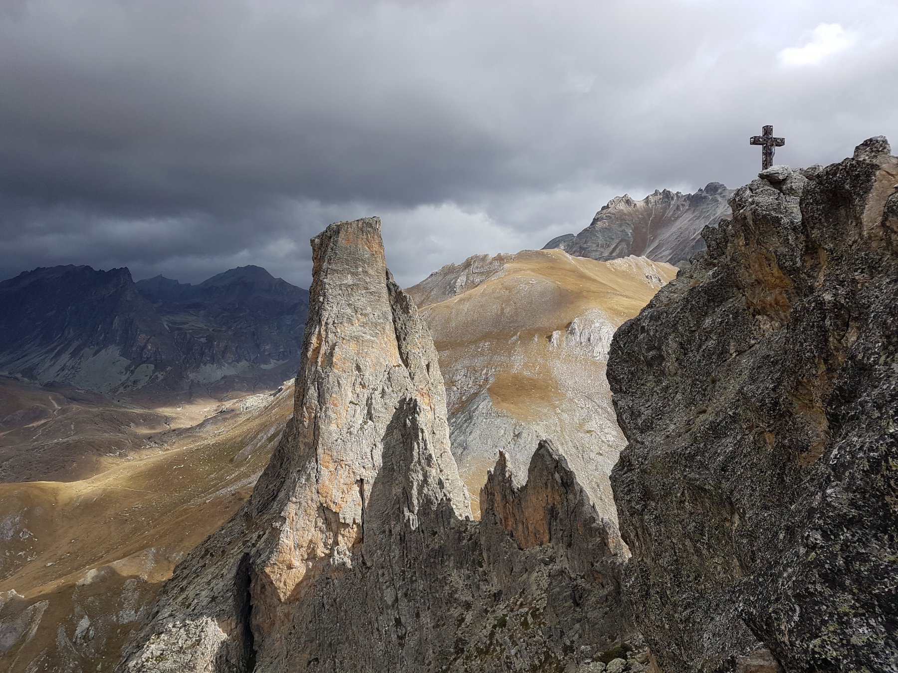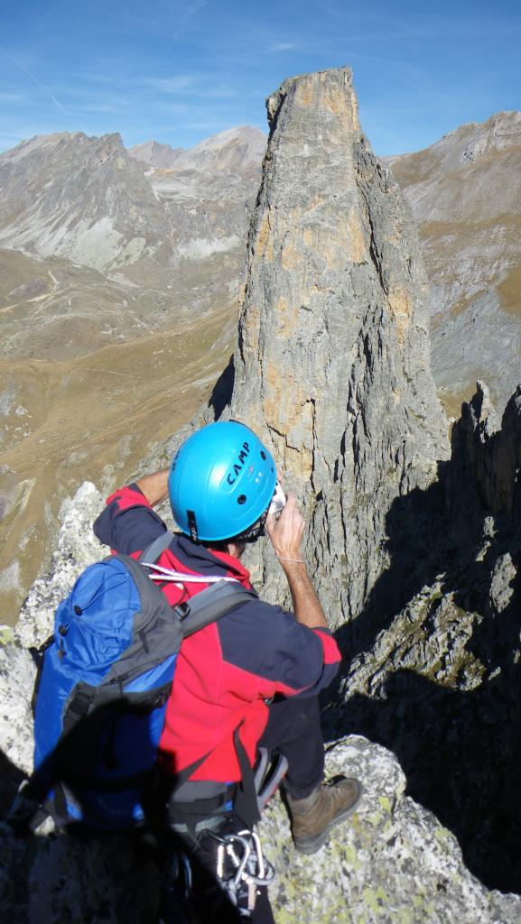 Salendo per più facili rocce si esce sull’affilata crestina finale. Pochi passi per l’esposto filo conducono infine alla grande croce della cima.