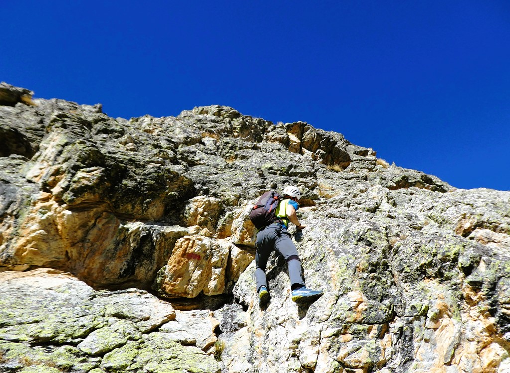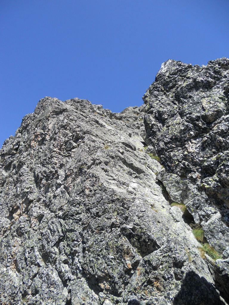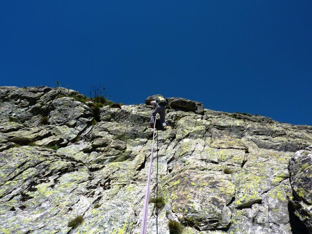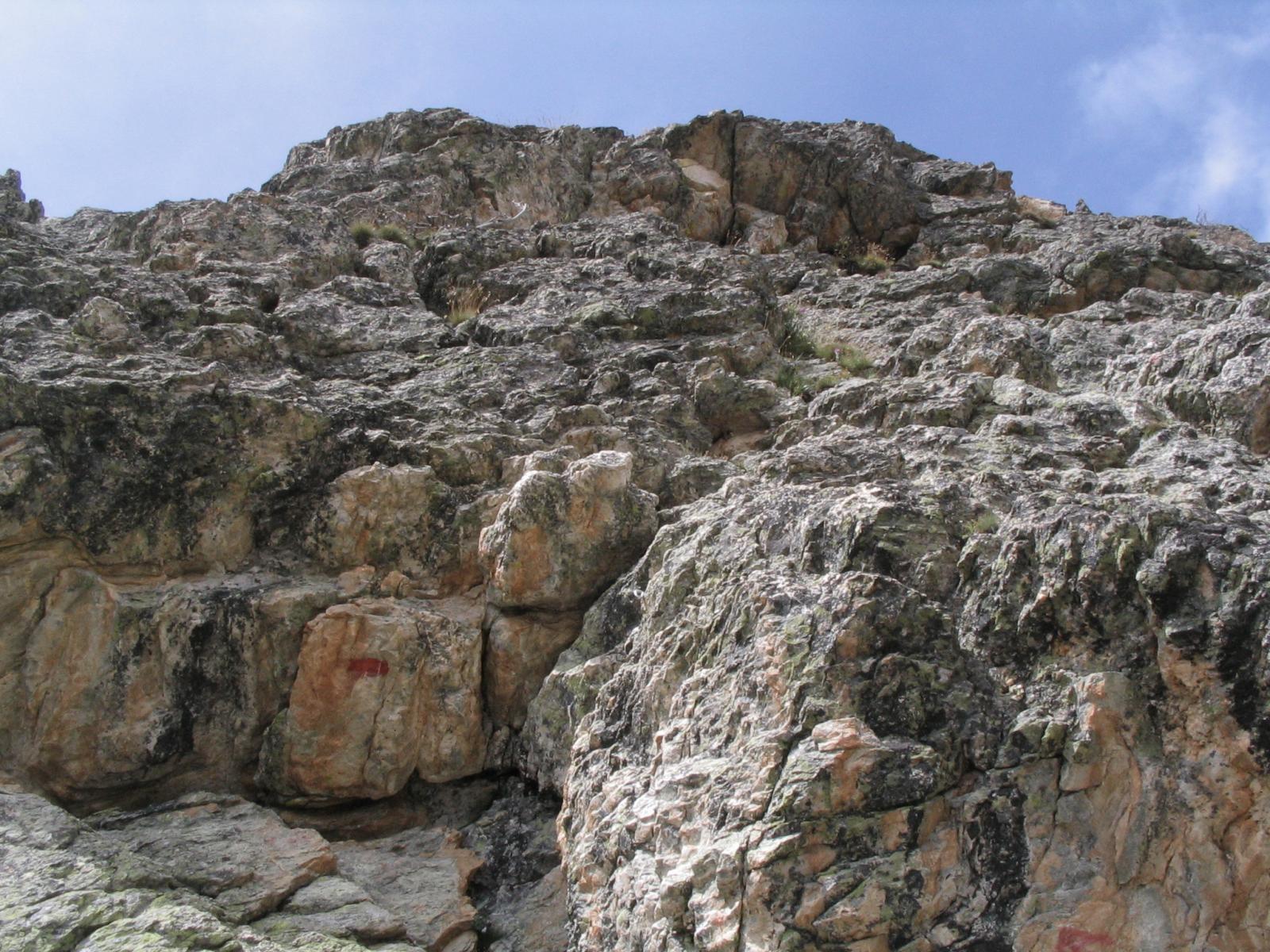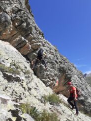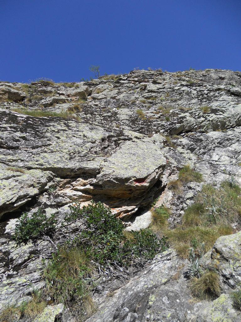 Seguendo evidenti segni rossi, si rimonta con alcuni zig zag lo zoccolo roccioso iniziale. Si continua a salire per un sistema di placche ripide e discretamente esposte (alcuni passi di II) raggiungendo così un piccolo praticello, dal quale si risale una fascia rocciosa fino ad un’ampia cengia. Si segue la cengia verso sinistra, poi si sale al di sopra di un piccolo tetto per un muretto(II+), oltre il quale si prosegue per caminetti e placche ripide.