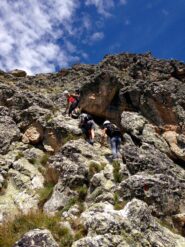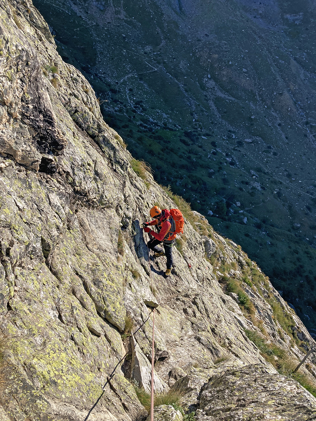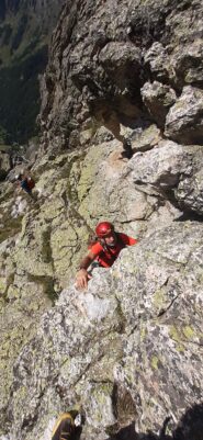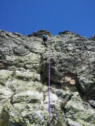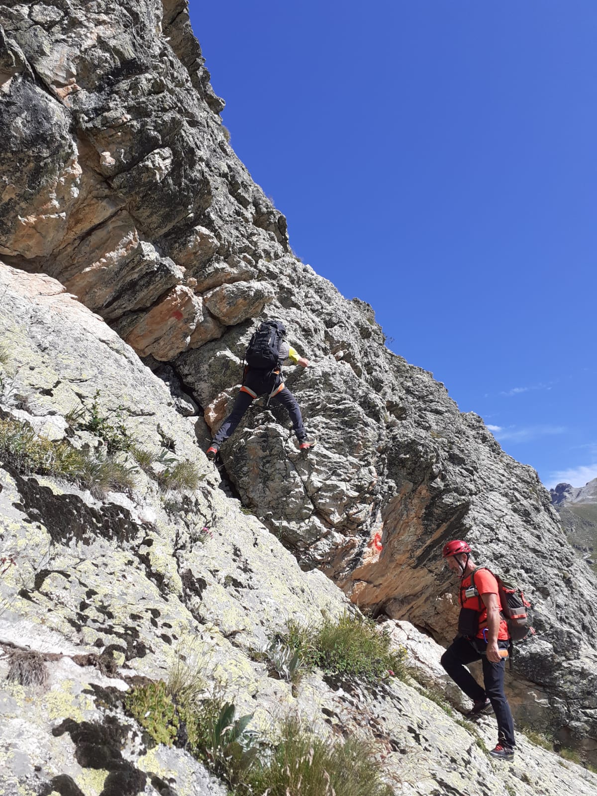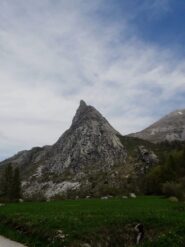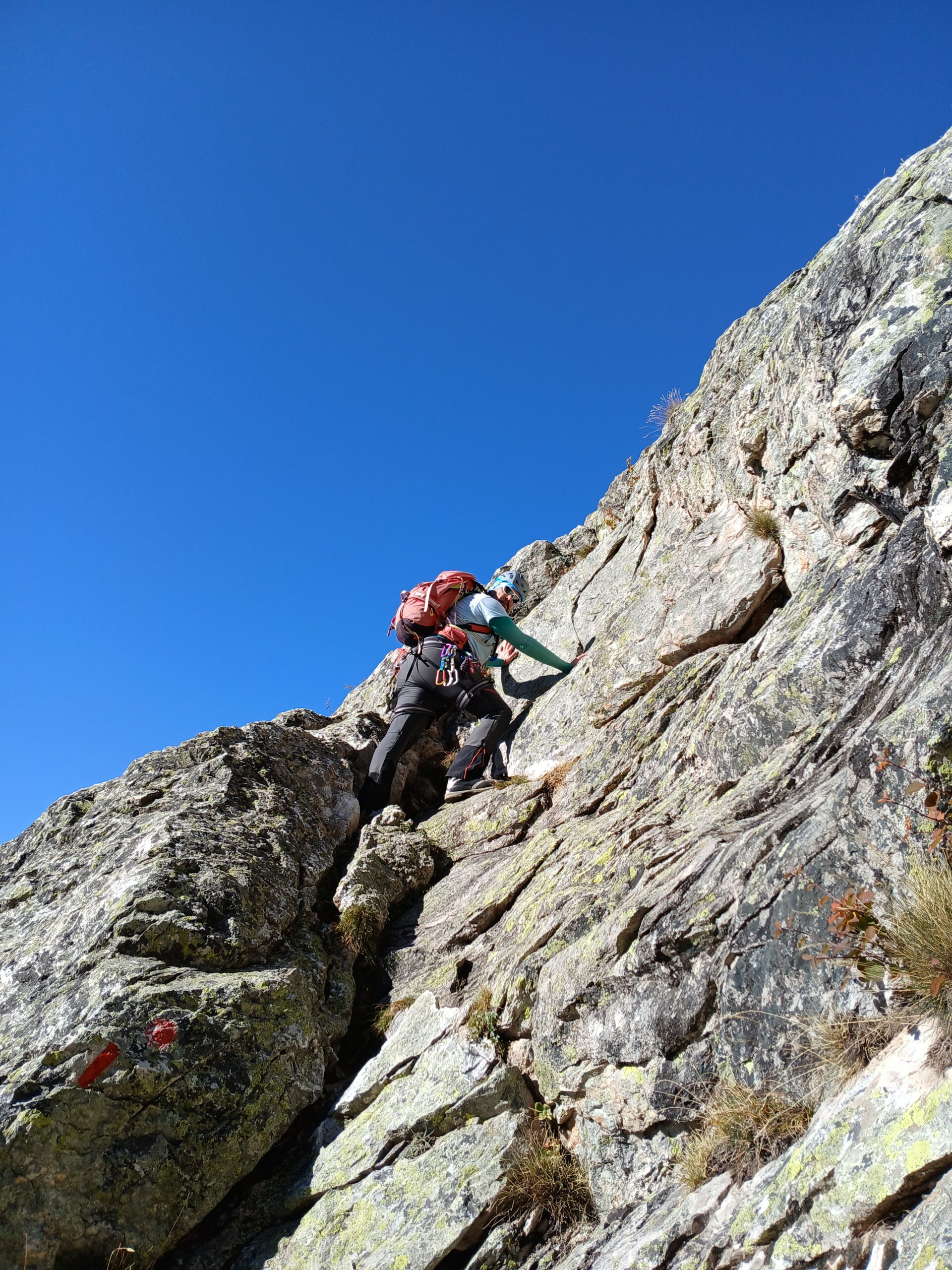 Seguendo evidenti segni rossi, si rimonta con alcuni zig zag lo zoccolo roccioso iniziale. Si continua a salire per un sistema di placche ripide e discretamente esposte (alcuni passi di II) raggiungendo così un piccolo praticello, dal quale si risale una fascia rocciosa fino ad un’ampia cengia. Si segue la cengia verso sinistra, poi si sale al di sopra di un piccolo tetto per un muretto(II+), oltre il quale si prosegue per caminetti e placche ripide.