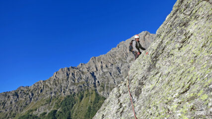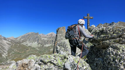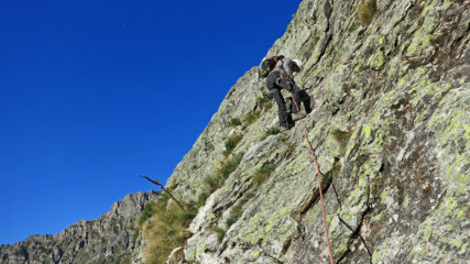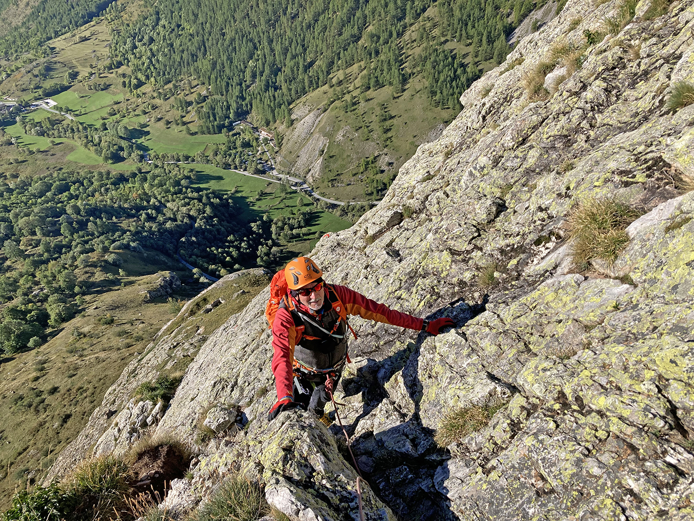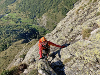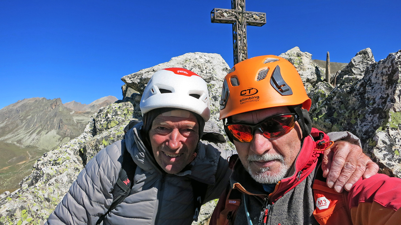 La mattina vento e freddo patagonico poi, arrivati all’attacco, come per magia si è tutto abbastanza attenuato, trovato solo un pò di vento in punta e lungo il percorso di cresta. Gita non proprio semplice per il vecchietto quale son io, sarebbe interessante sapere che fine hanno fatto tutti quei begli anelloni resinati che 14 anni fa mi permisero un’agevole e sicura salita. Adesso ci sono diversi fittoni resinati che ti costringono a fare numerosi zig zag e secondo me era meglio prima. La classificazione F+ è per me sempre leggermente riduttiva visto che ci sono un paio di passaggi ostici, comunque va bene così, l’importante è esserci riuscito ancora una volta.
