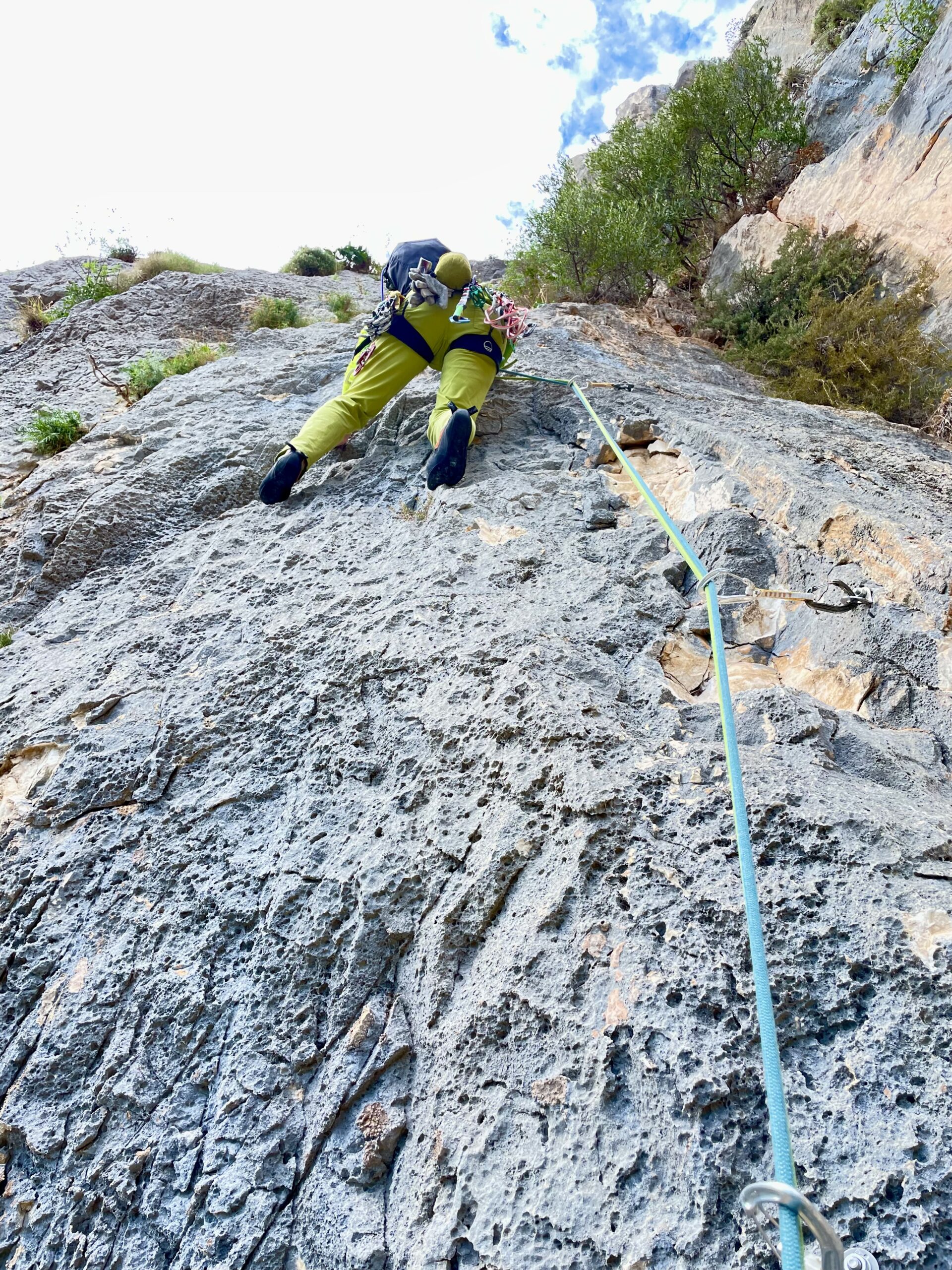 - L5 salire sopra la sosta fino a superare un tratto più verticale grazie a prese generose su belle erosioni che ricordano la falesia canyon di samugheo. Quindi attraversare a sinistra sotto un tetto e ribaltarsi sul terrazzo al di sopra di esso, traversare a destra e trovare la sosta, sulla verticale della sosta da cui si è partiti. Tiro molto zigzagante, allungare protezioni. 15 rinvii, 6a, 45m.