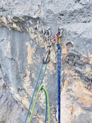 Via impegnativa in almeno 2/3 tiri, in particolare il penultimo, chiodatura esigente. L’ avvicinamento, dalla falesia, è almeno di mezz’ora con una traccia di sentiero a dir poco “disagevole” (a scendere e’ peggio !!!).