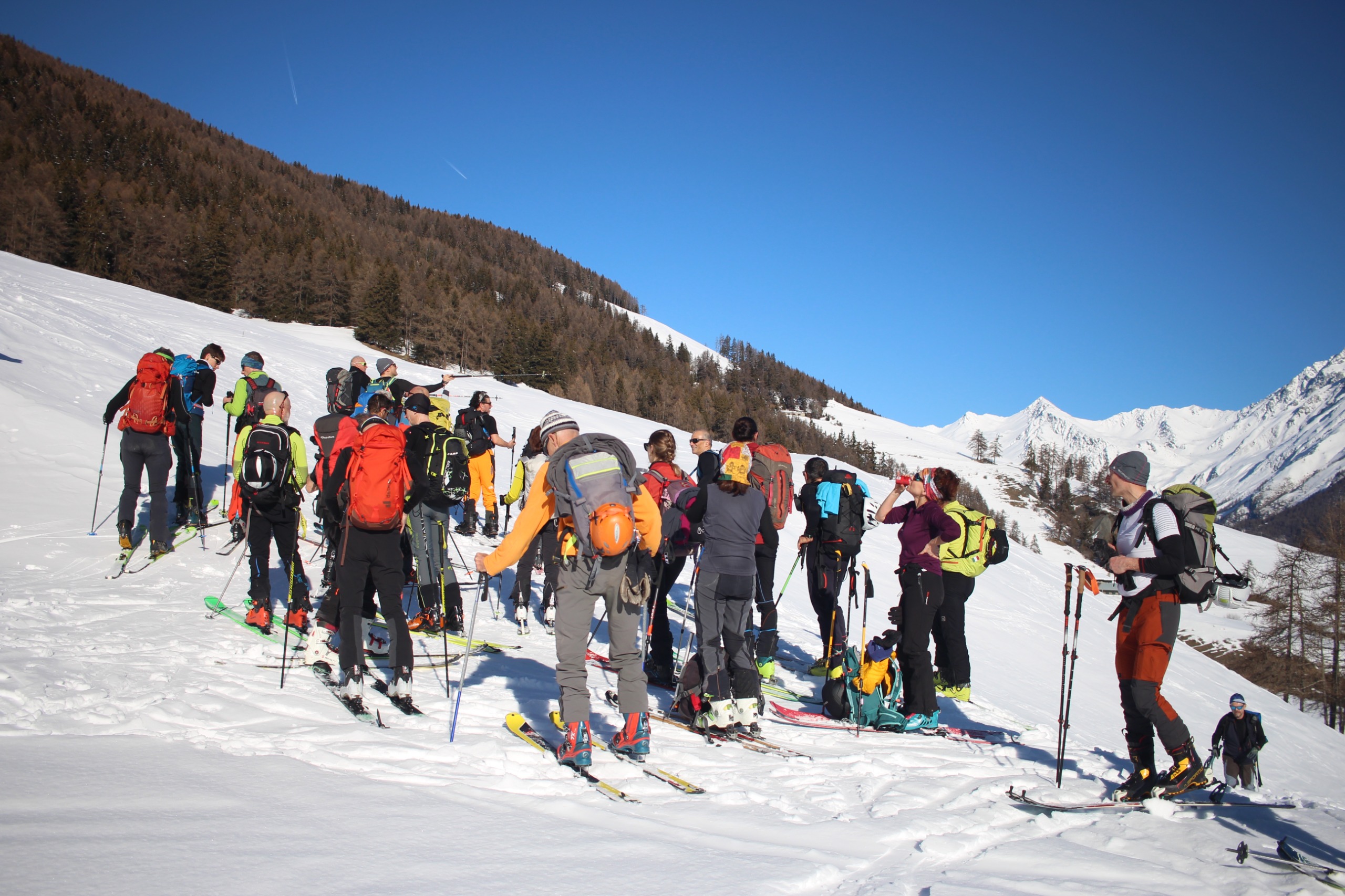 Quinta sociale GSA, anche se la vetta ci ha respinto, il vento di ieri ha reso i pendii carichi e negli ultimi 100 metri potevano esserci placche instabili. La neve? Varia: nel bosco e sui pendii riparati molto bella, nei pendii esposti al vento e al sole crostosa.
