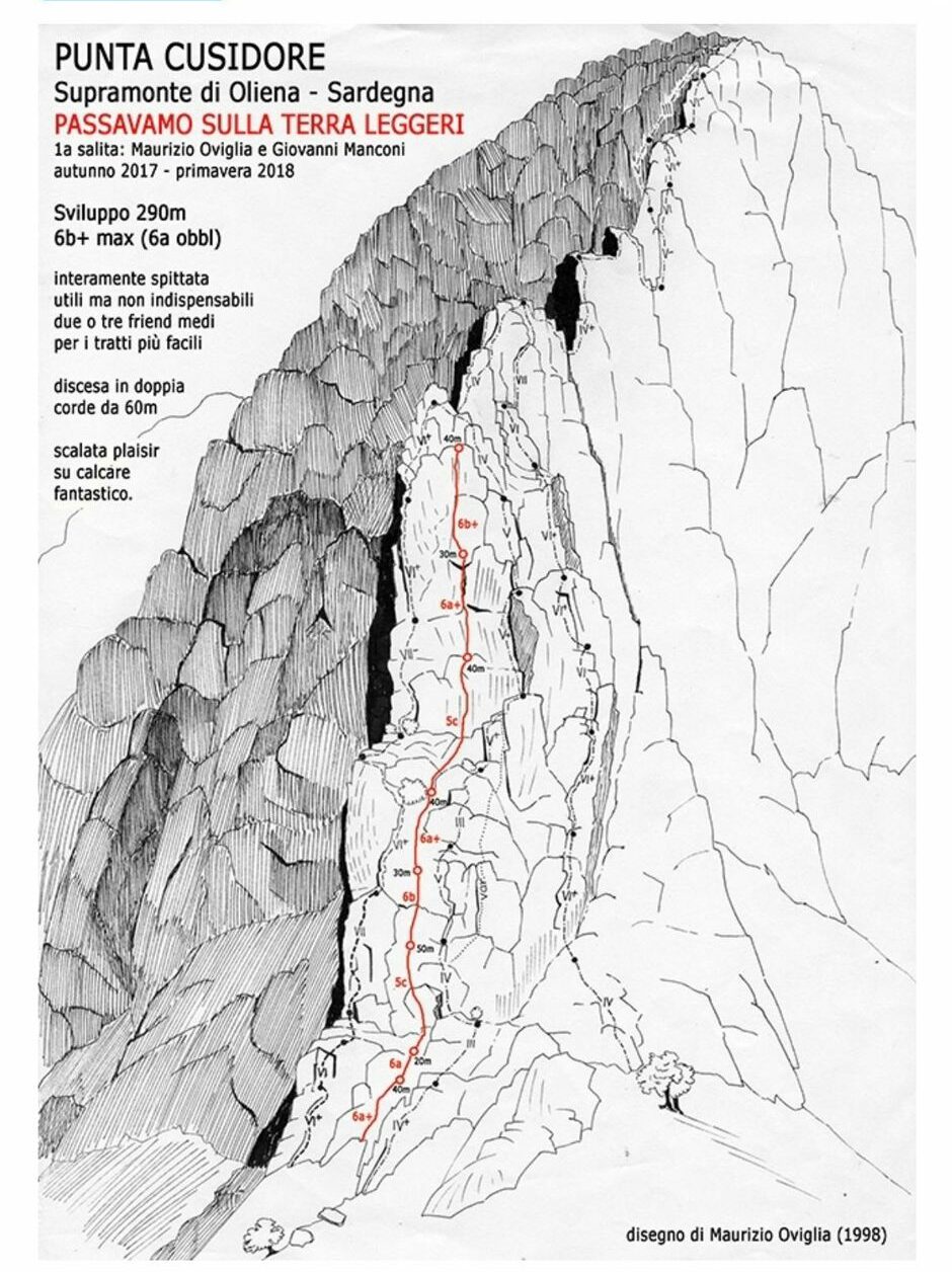 Materiale: 2 mezze corde 60 m, cordini vari per unire le soste e clessidre, una serie di friend dallo 03 al 3BD, nut, slunghi, martello se si vogliono ribattere i pochi chiodi sulla via.