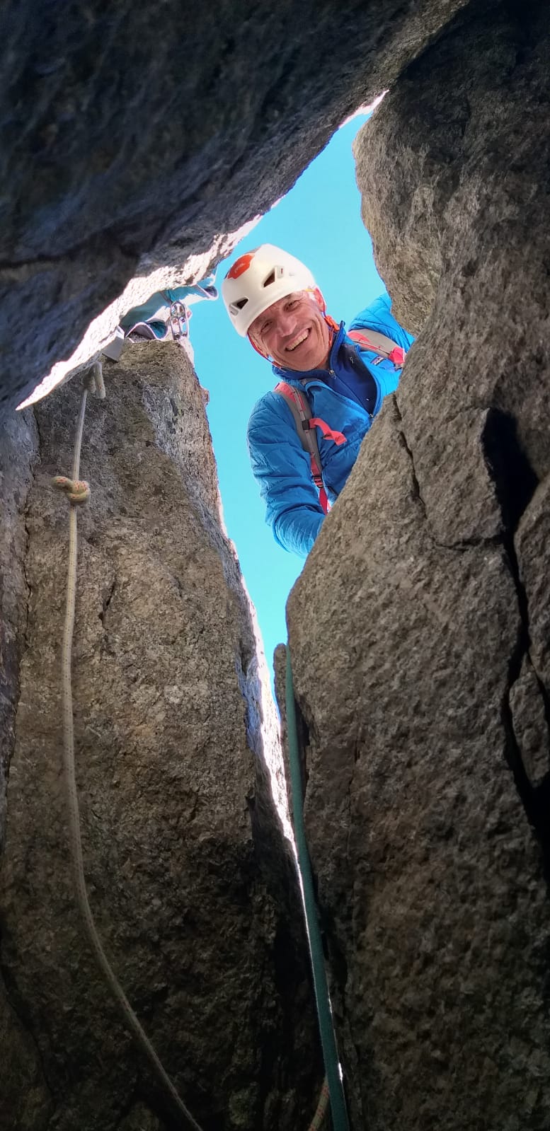 L4: risalire il camino sulla destra sfruttando le bellissime lame poi eentrare dentro il camino, superare il masso incastrato (1ch) fino ad una grotta (conviene sostare qui) e risalire dentro ad un stretto buco (corda fissa, togliere lo zaino) 5a