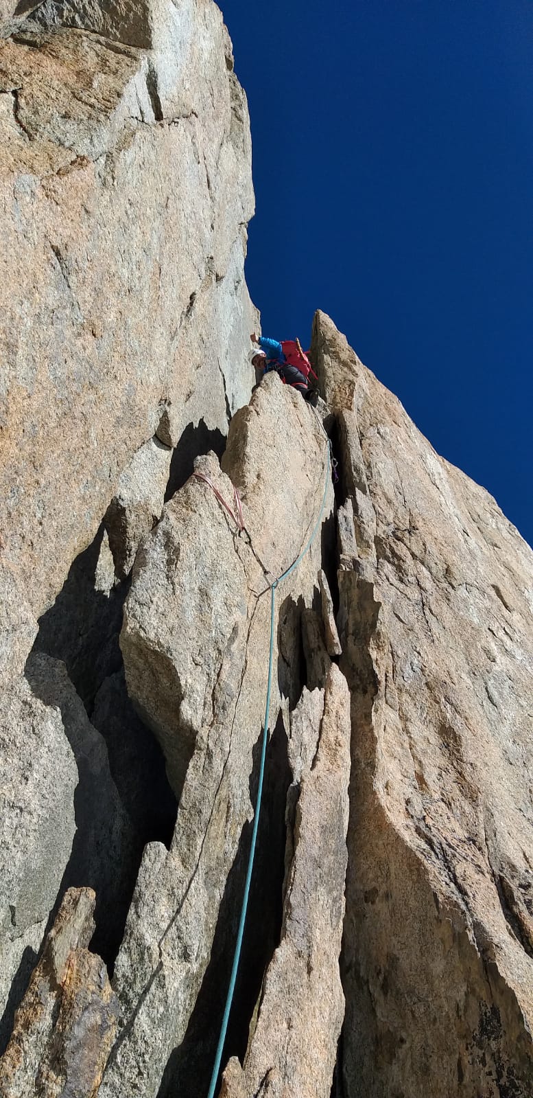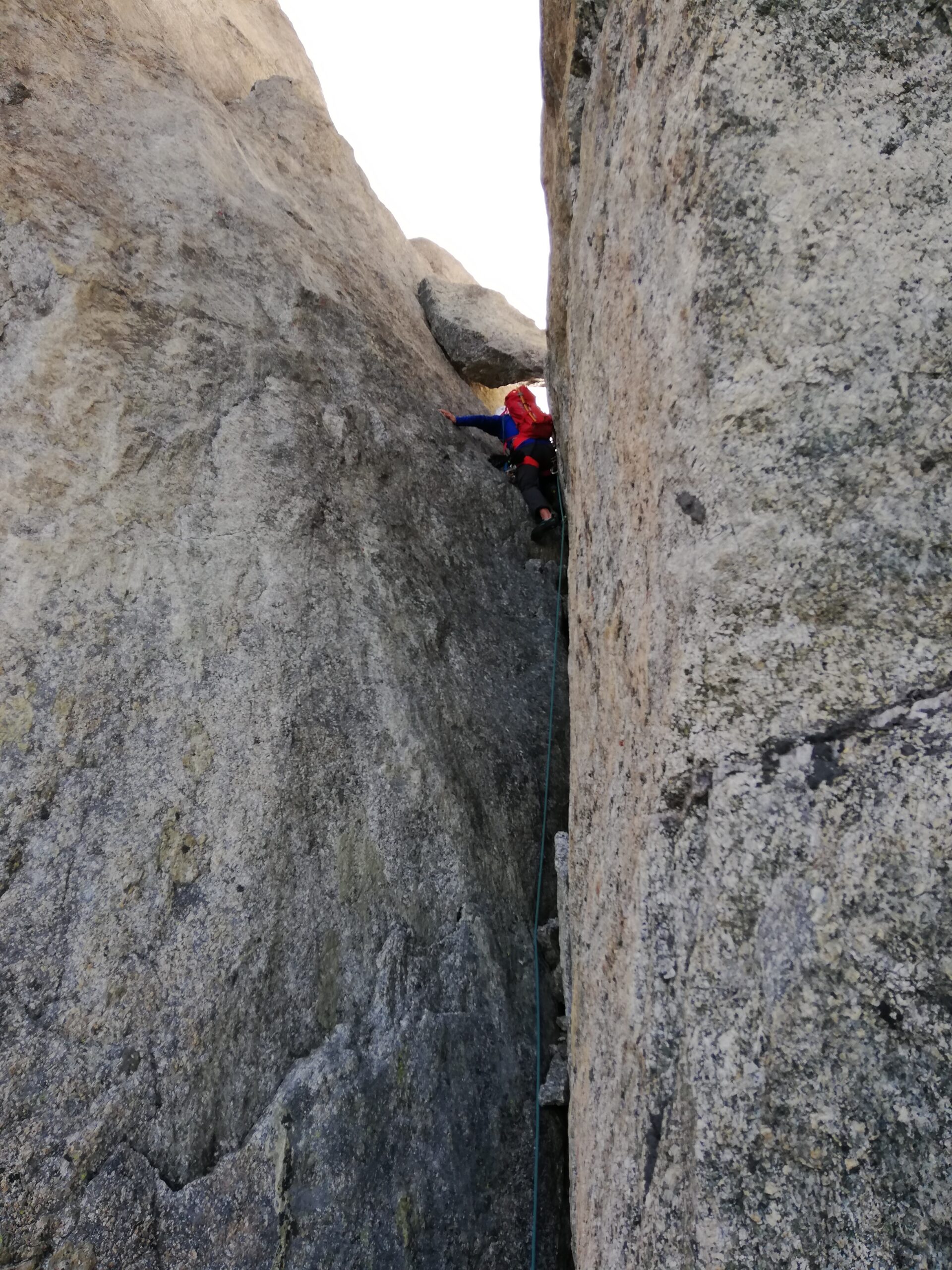 L2: risalire il canale/camino con masso incastrato (possibile sosta su clessidra) e risalire la placca che riporta in cresta, seguirla (2ch) e traversare a destra su terrazzo (4c)