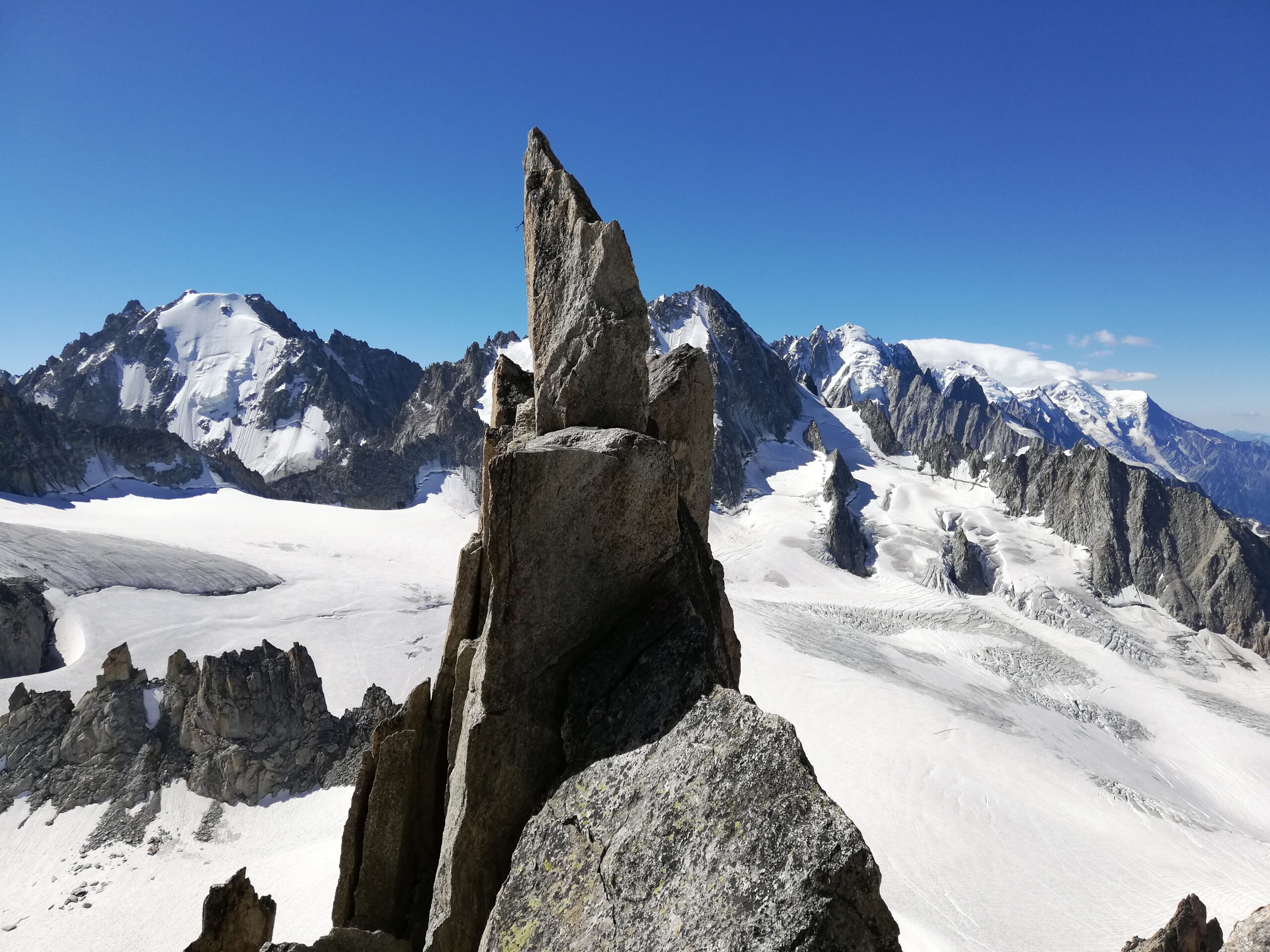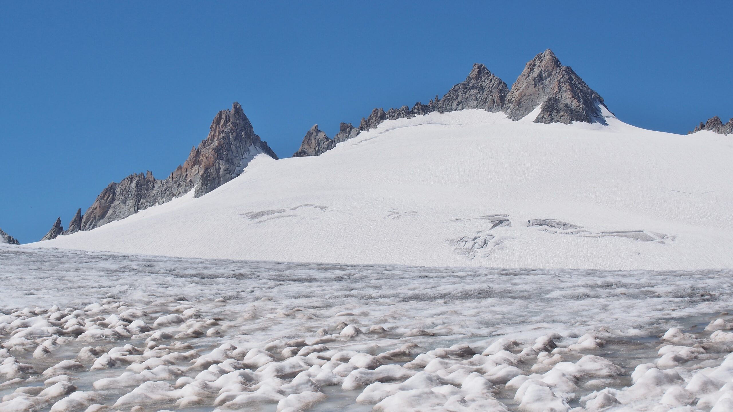 Discesa: dalla cima (2spit+maillon) calarsi in una specie di canale (nord) fino ad una terrazza oppure disarrampicare per 8 m fino ad una sosta su cordoni e calarsi; calarsi fino al ghiacciaio (con corde da 60m) altrimenti è presente una sosta a spit intermedia.