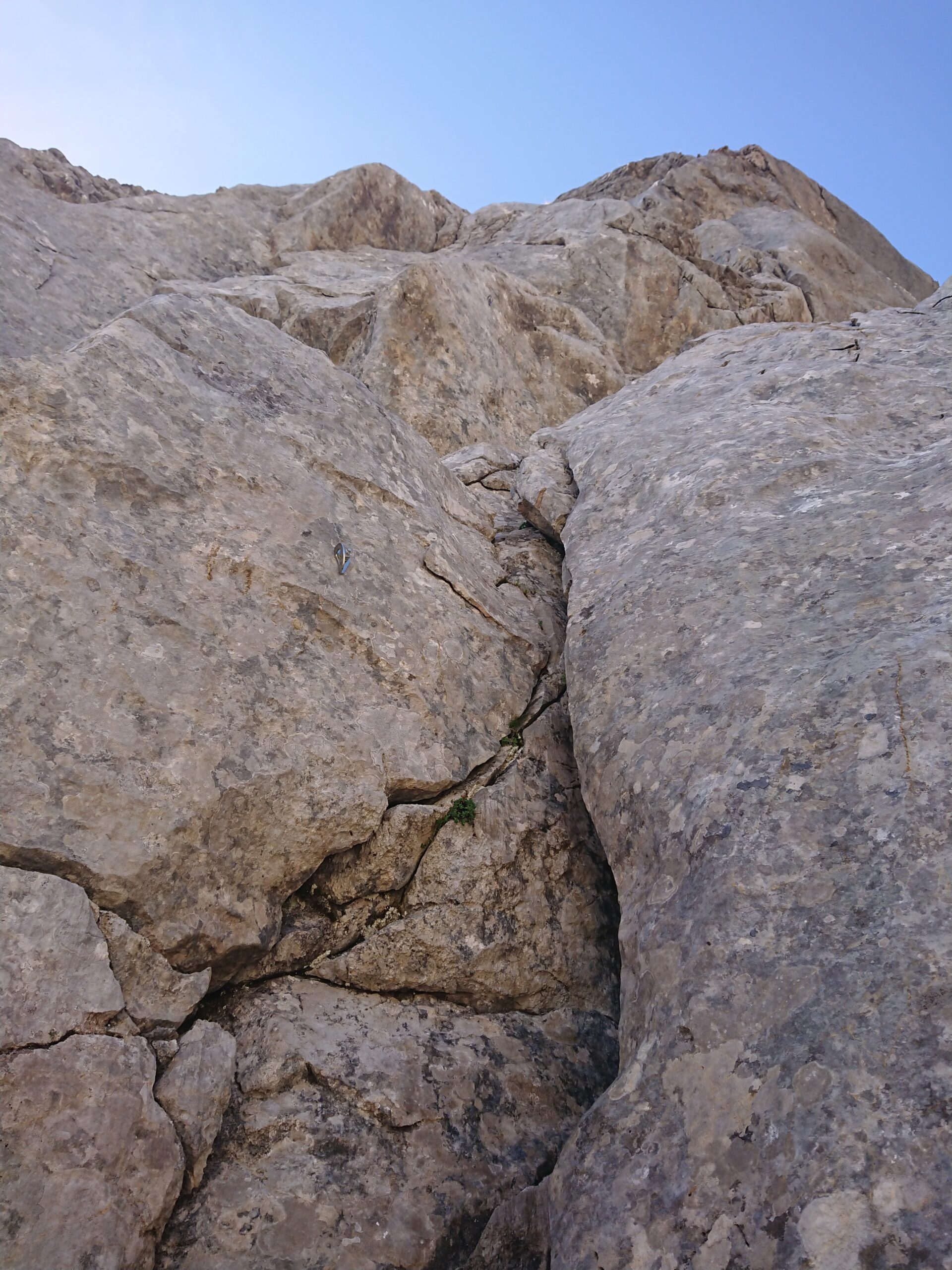 – dopo il lungo tratto erboso orizzontale, alla ricomparsa delle roccette, lungo il filo di cresta è presente una calata di emergenza spit+anello/clessidra di circa 15 mt sul versante nord, che porta su sfasciumi a base parete.
