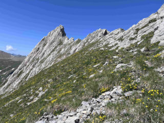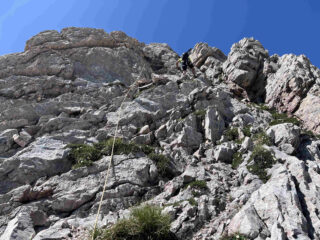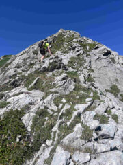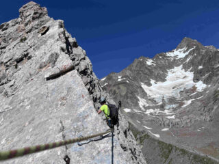Partiti dal parcheggio di La Visaille con zaino in spalla e scarponi ai piedi abbiamo raggiunto il rifugio Elisabetta con le MTB per poi nasconderle all’interno della casermetta militare sotto al rifugio. Breve sosta al rifugio per caffè e torta ai frutti di bosco e poi ci siamo incamminati a piedi per raggiungere la cresta. Noi abbiamo attaccato direttamente la prima crestina dietro al rifugio slegati in quanto facile e ben appigliata e camminabile in molti tratti. Dopo il primo tratto ci siamo legati per salire in conserva. In sito si trovano alcuni spit nei punti più esposti e non occorre altro. Noi abbiamo utilizzato un friend in un punto un po’ esposto in cresta. Prima della cima si affronta una calata di pochi metri con sosta attrezzata. Gita dai panorami grandiosi non soltanto in cima ma durante l’intero percorso della gita tra cui spicca il Monte Bianco ovviamente e l’Aguille Noire de Peterey. Meteo perfetto con giornata calda ma ventilata in attesa della perturbazione in arrivo per la serata e la giornata di domani.