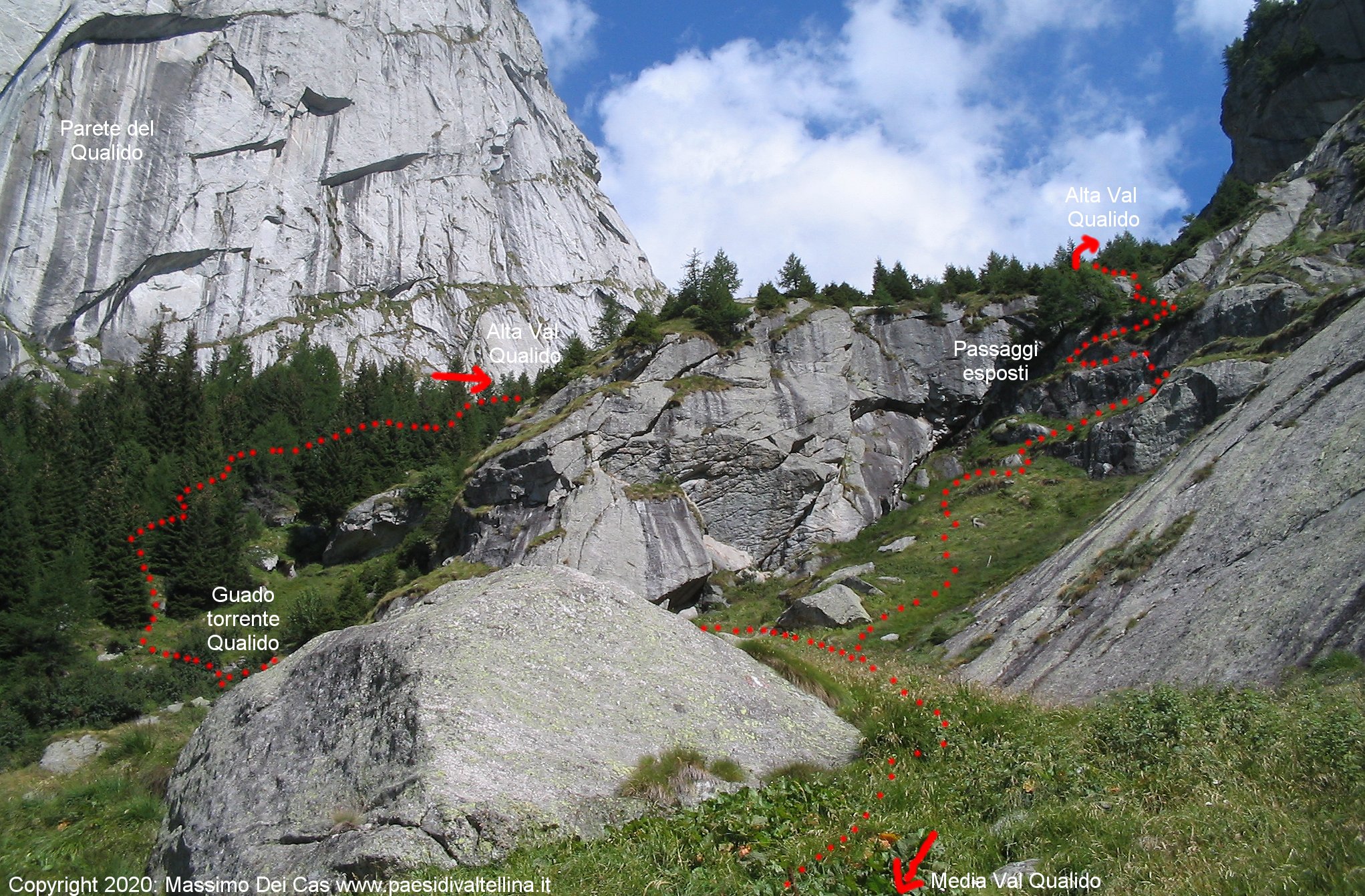 Da qui non salire sotto la parete del qualido a sx (si puö fare ma si allunga un pö il giro) ma continuare dal lato opposto, su sentierino evidente riattraversando il fiume. Sempre dritto, quando finiscono i segni navigare a vista, la parete è li’ davanti.