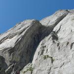 Il primo tiro è più lungo di 60 m partendo dalla pietraia, ma conviene spostarsi a far sicura sulla placca.