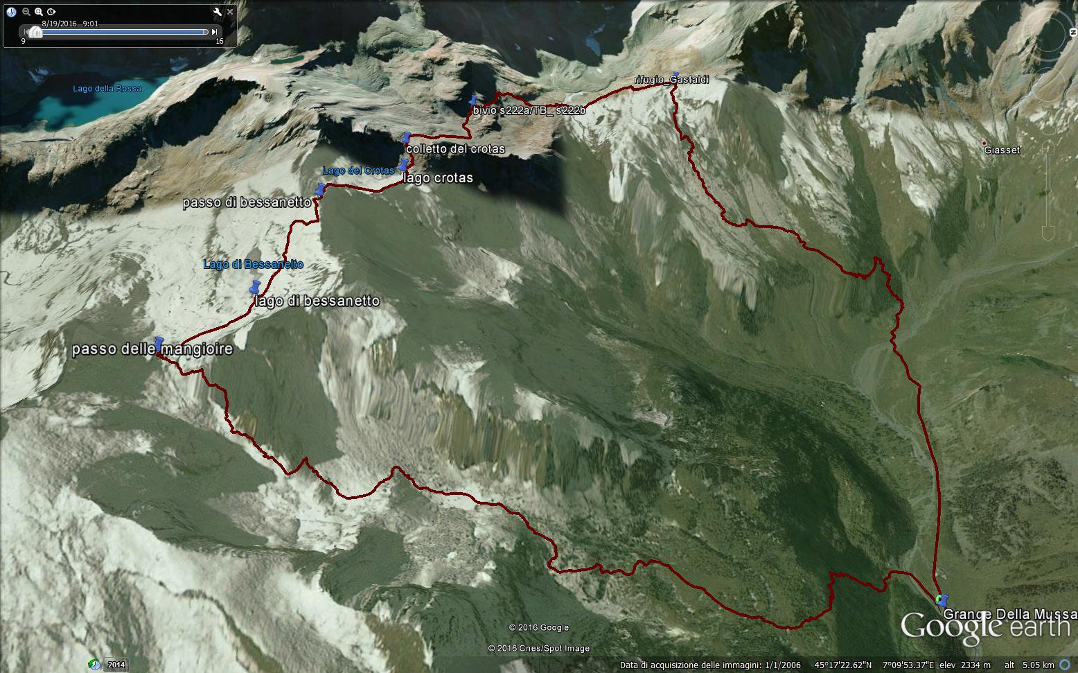 Costeggiando il lago di Bessanetto prima e risalendo la spalla poi, transitare al passo di Bessanetto, raggiungere il passo di Quara di Bellacomba (non segnato sulla carta n.8 di Fraternali ma presente sulla n.103 dell’IGC) con l’evidente sperone roccioso da costeggiare e scendere al bel lago del Crotas. Guadagnare il colletto del Crotas (ometto) e per i numerosi bolli ed ometti procedere fino ad incontrare il sentiero n.222a/TB (cartello).