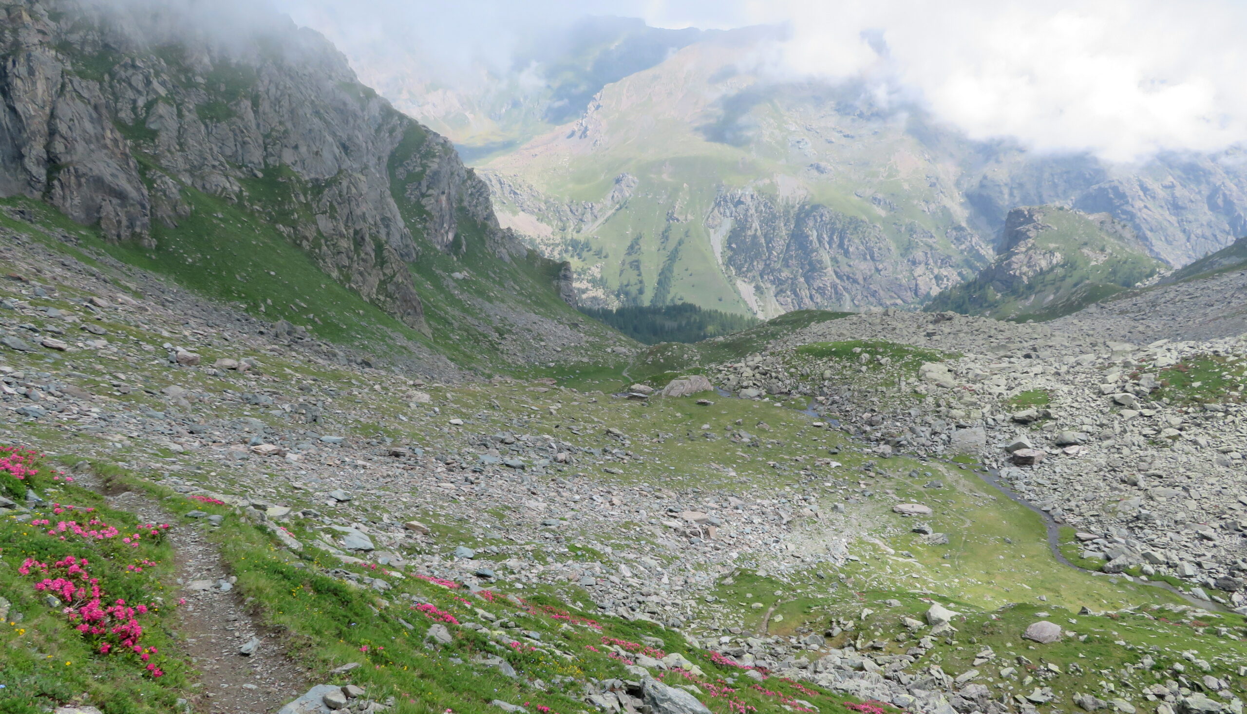 Scendere per breve tratto il sentiero n.119 e raggiunta la piana di Bessanetto piegare a destra imboccando il sentiero n. 222b (evidenti bolli bianco/rossi).