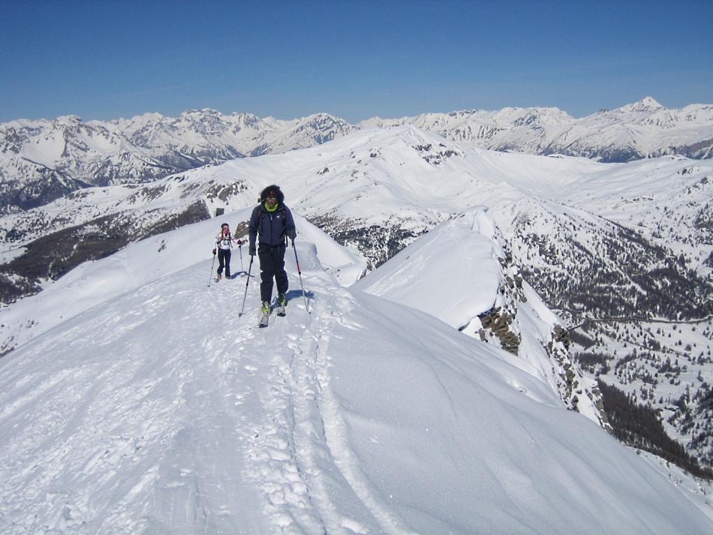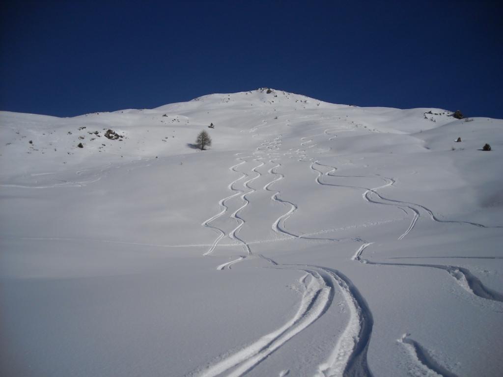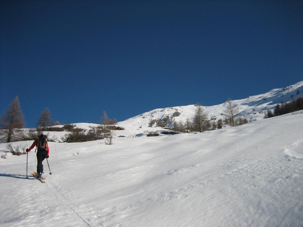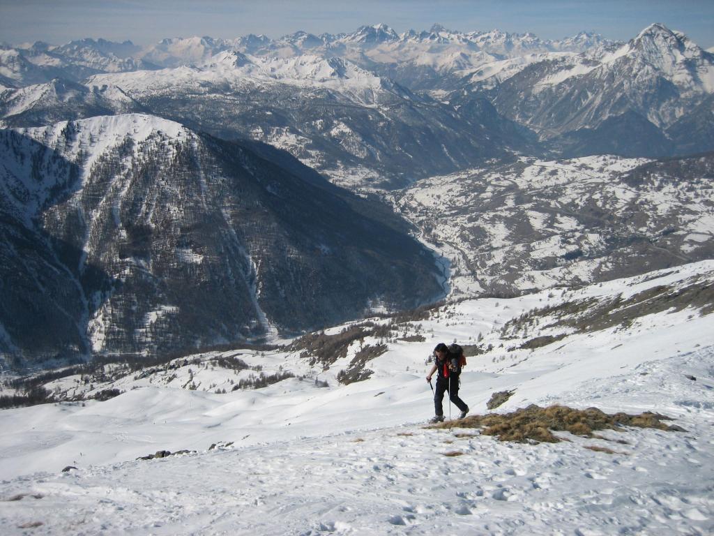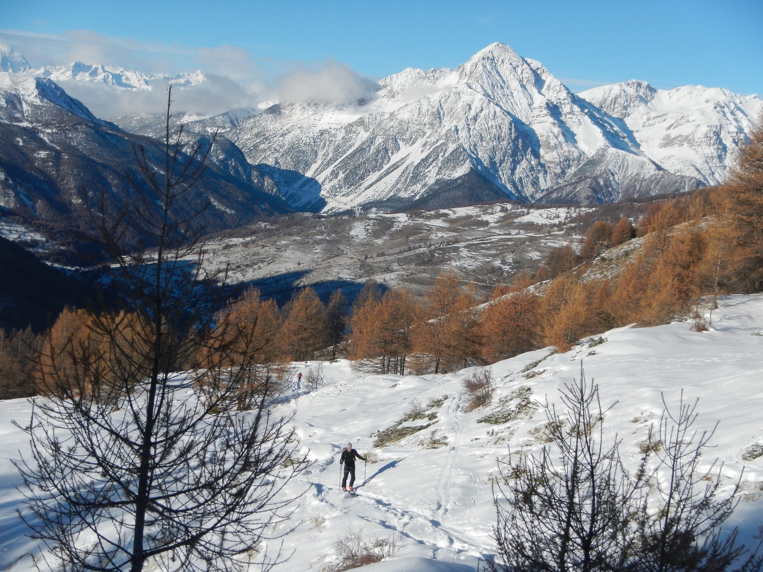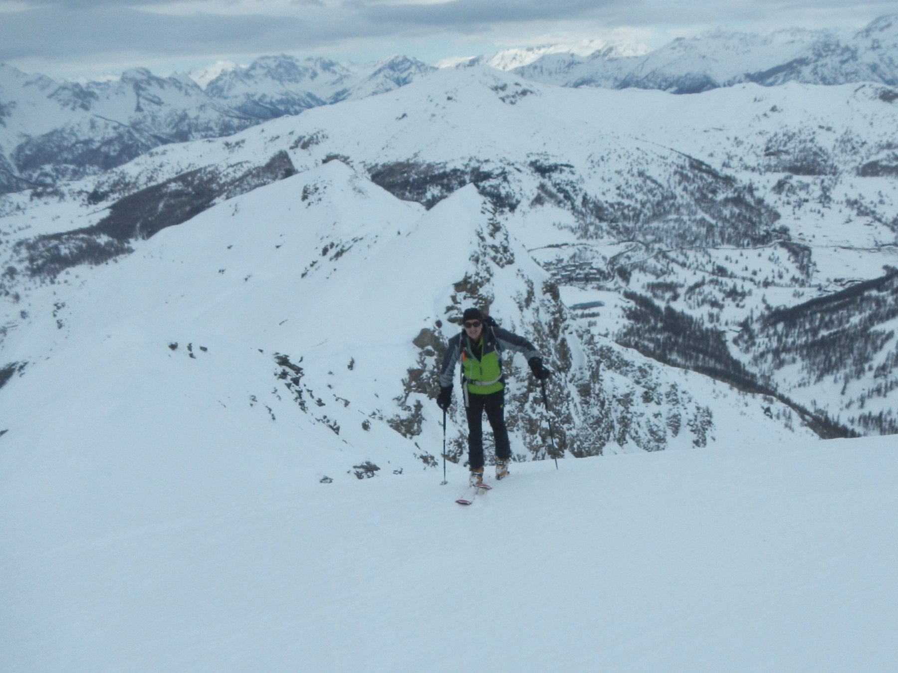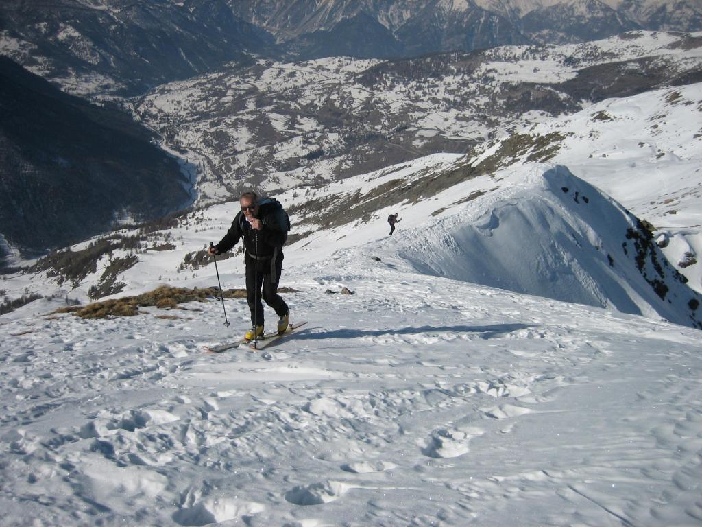 Dal Pont Terrible, imbocco della Valle Argentera (o dal tornante della strada vecchia di Sestriere poco sopra) salire i pendii a fianco degli abitatidi Bessé Bas e Bessé Haut, scegliendo in base alle condizioni se stare sui pendii aperti (sx salendo) o a dx del canale nel bosco. Di qui si giunge all’evidente vetta.