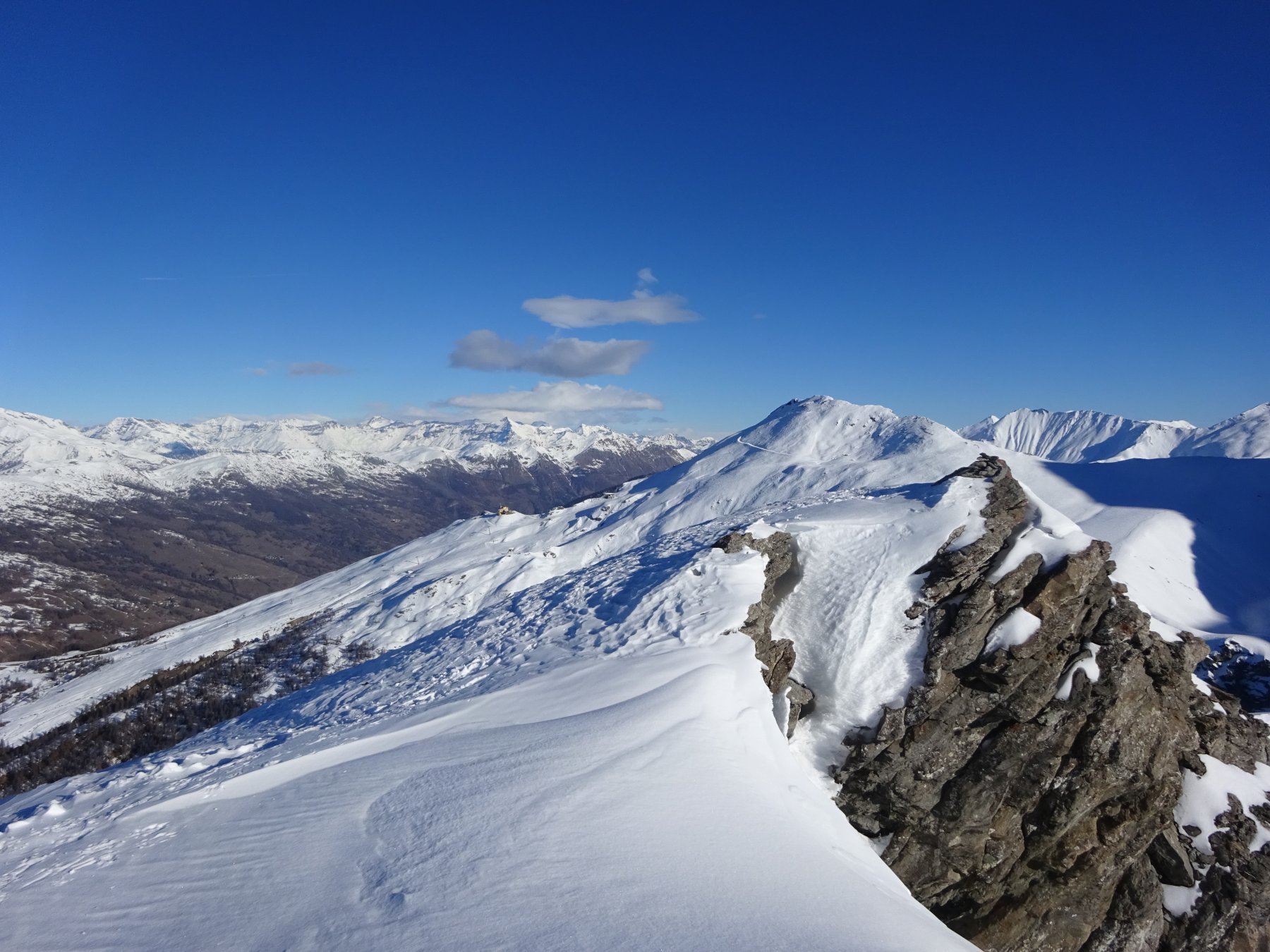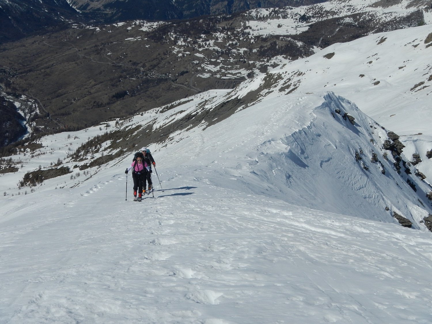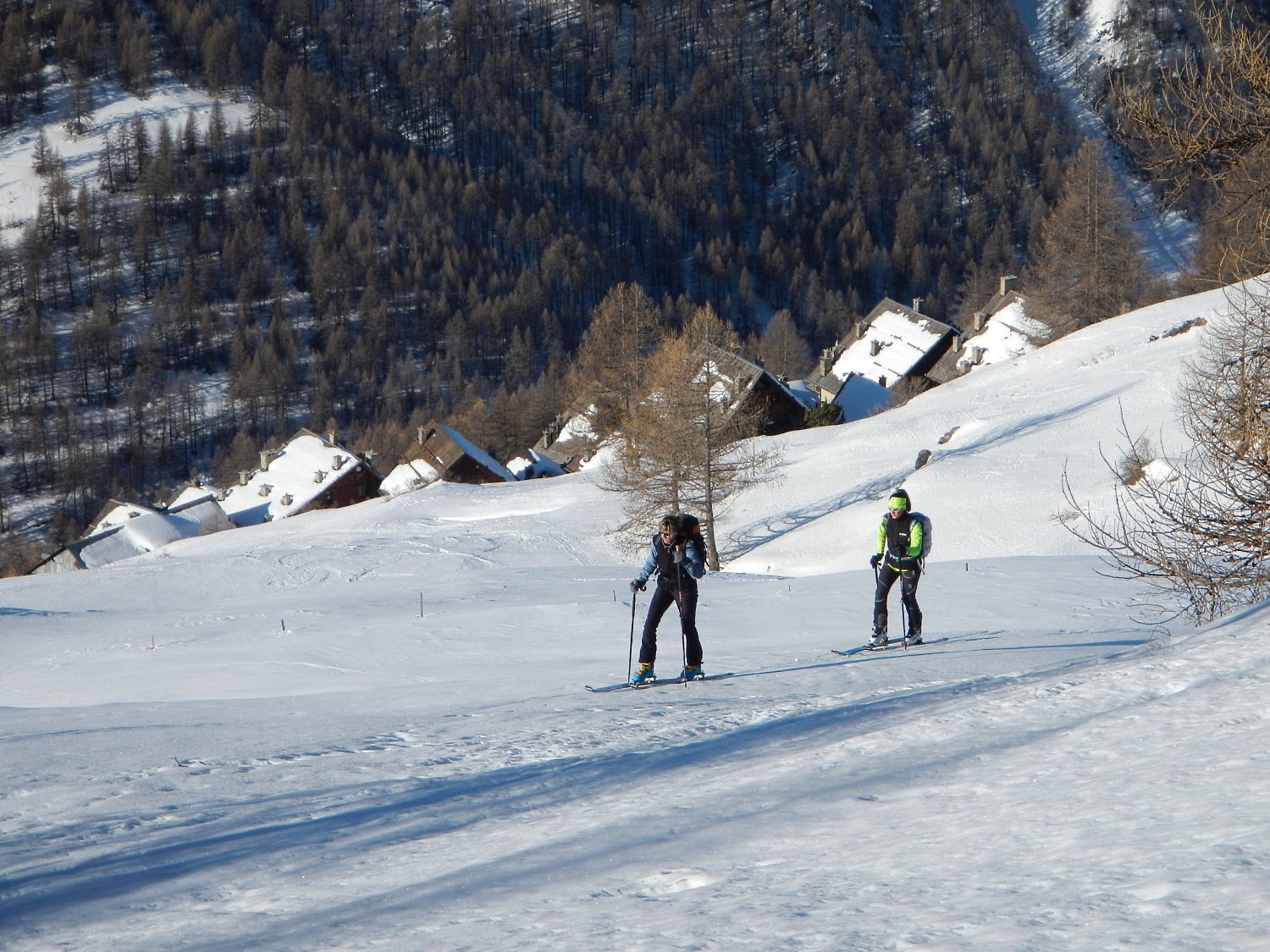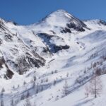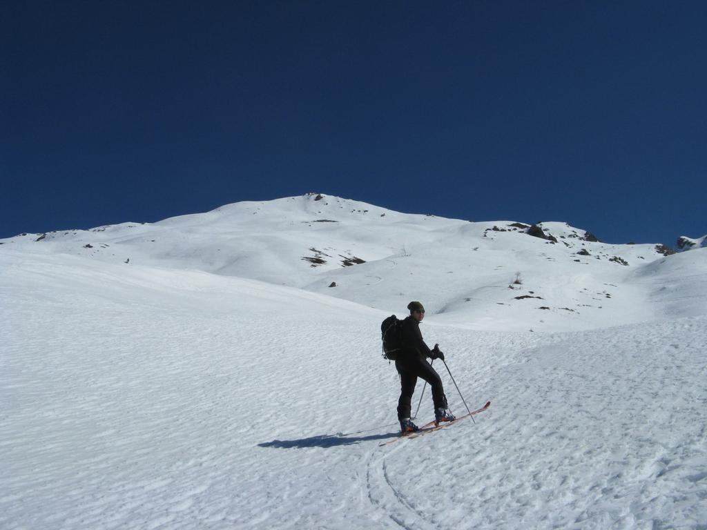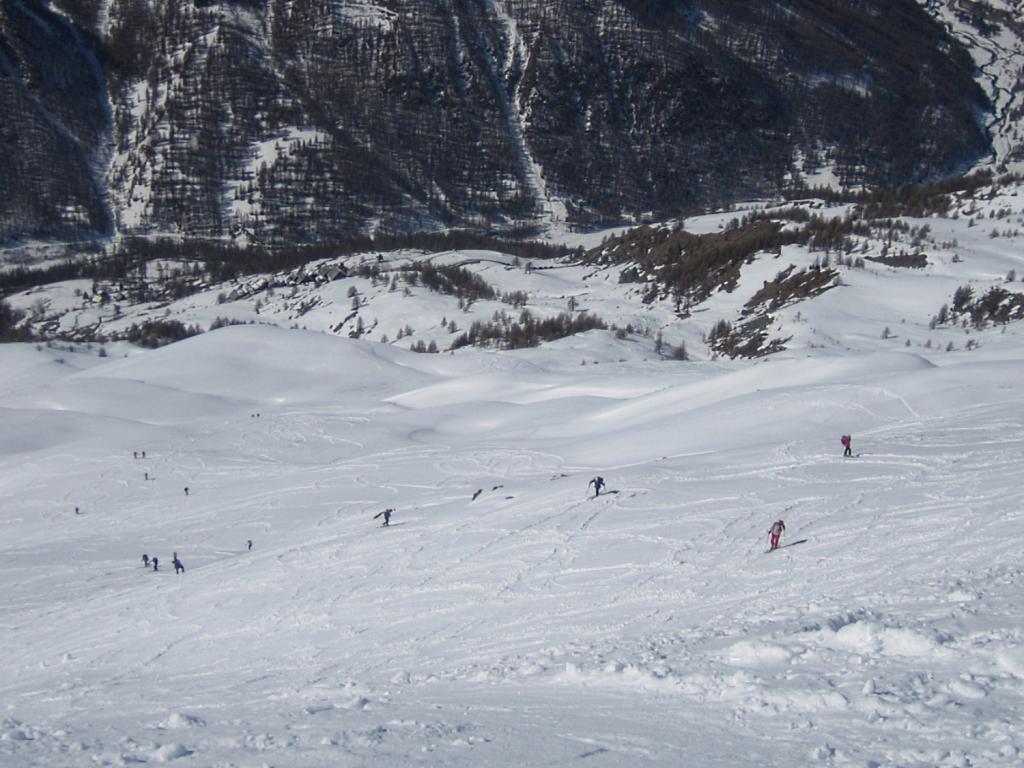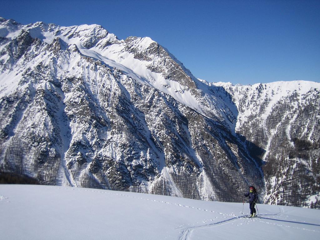 Dal Pont Terrible, imbocco della Valle Argentera (o dal tornante della strada vecchia di Sestriere poco sopra) salire i pendii a fianco degli abitatidi Bessé Bas e Bessé Haut, scegliendo in base alle condizioni se stare sui pendii aperti (sx salendo) o a dx del canale nel bosco. Di qui si giunge all’evidente vetta.