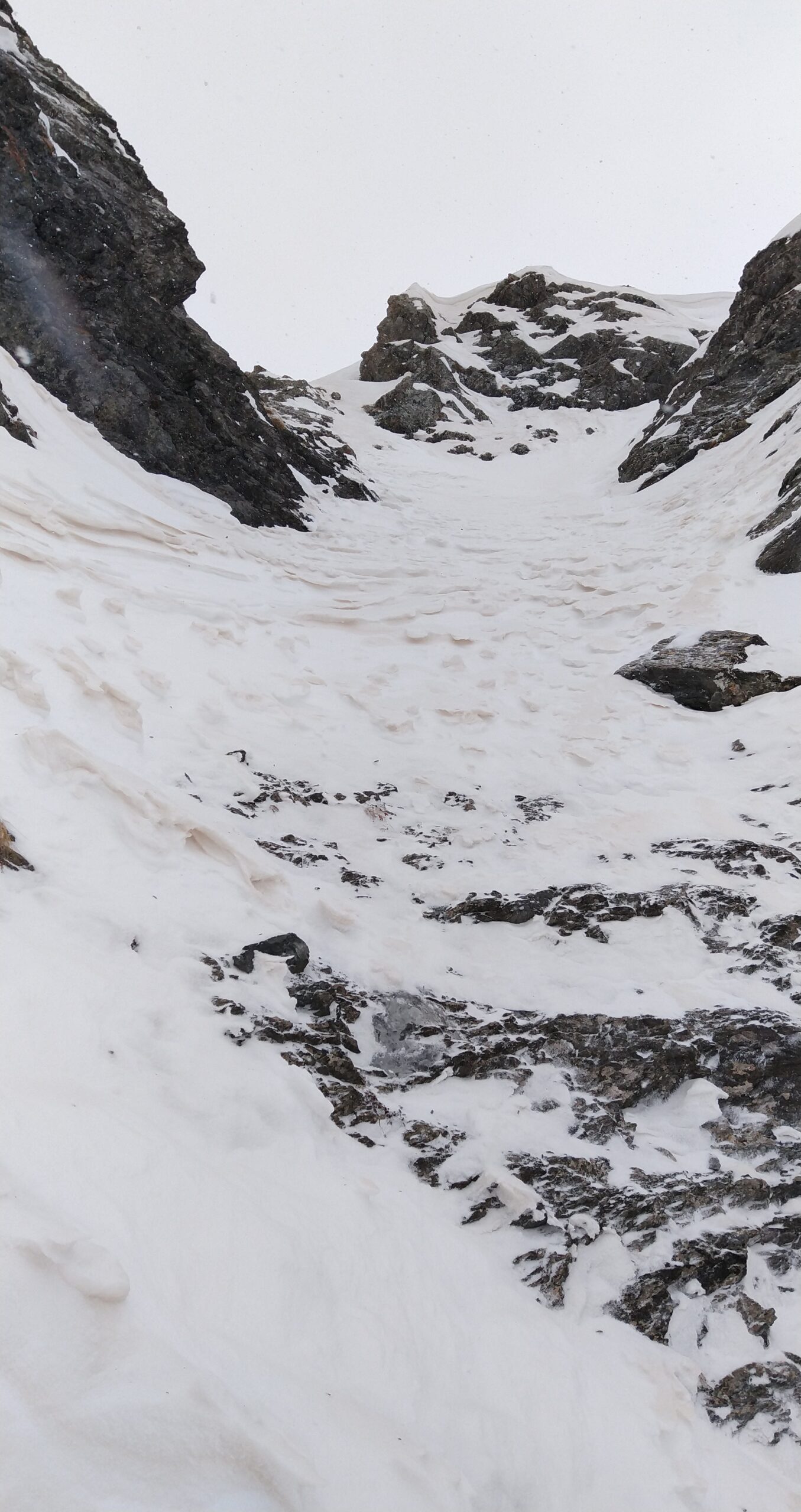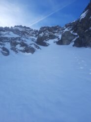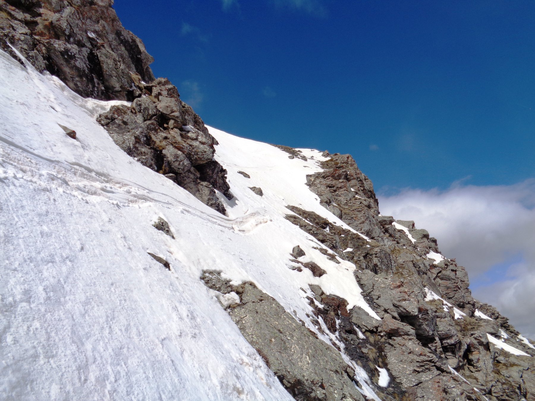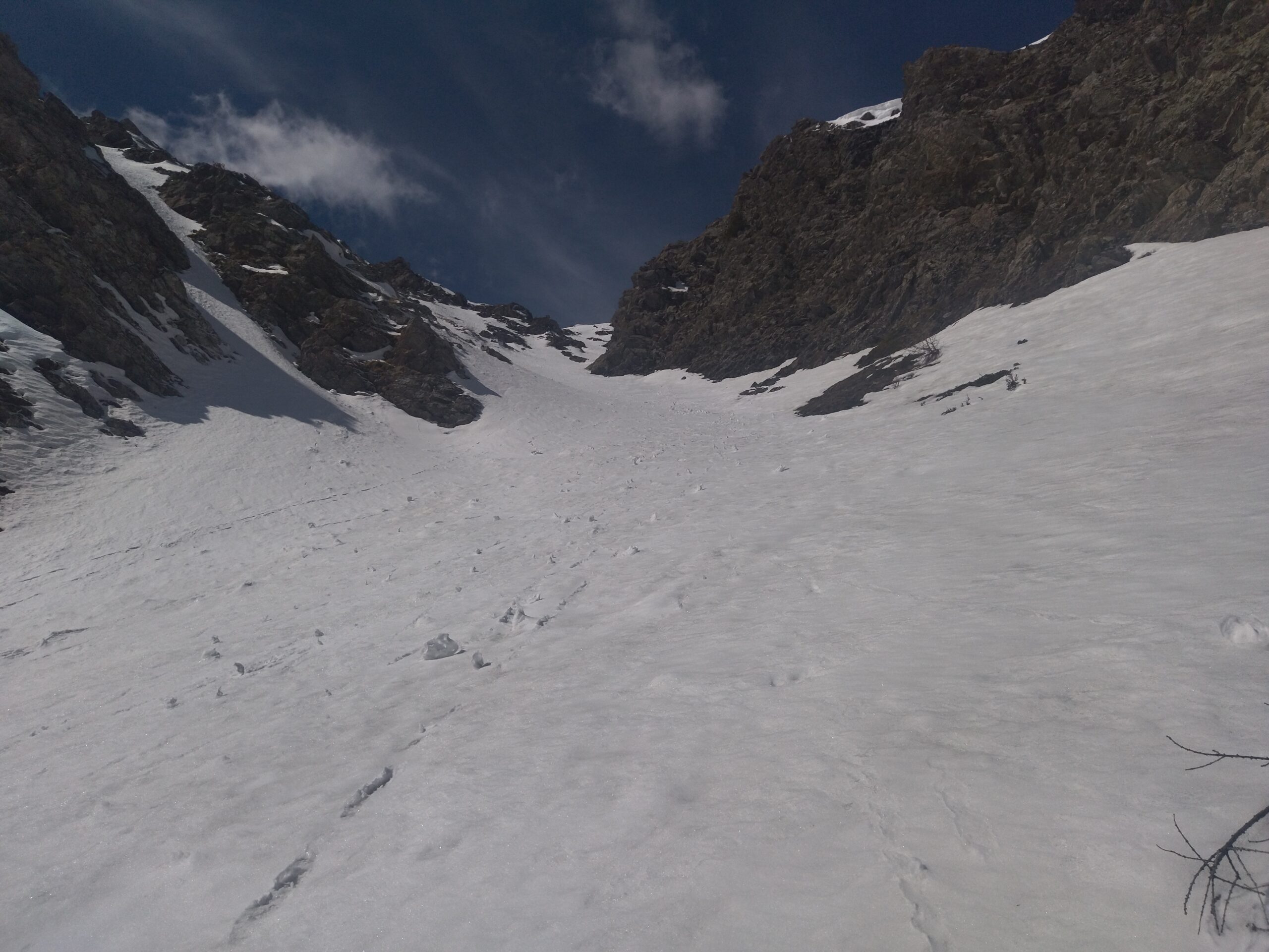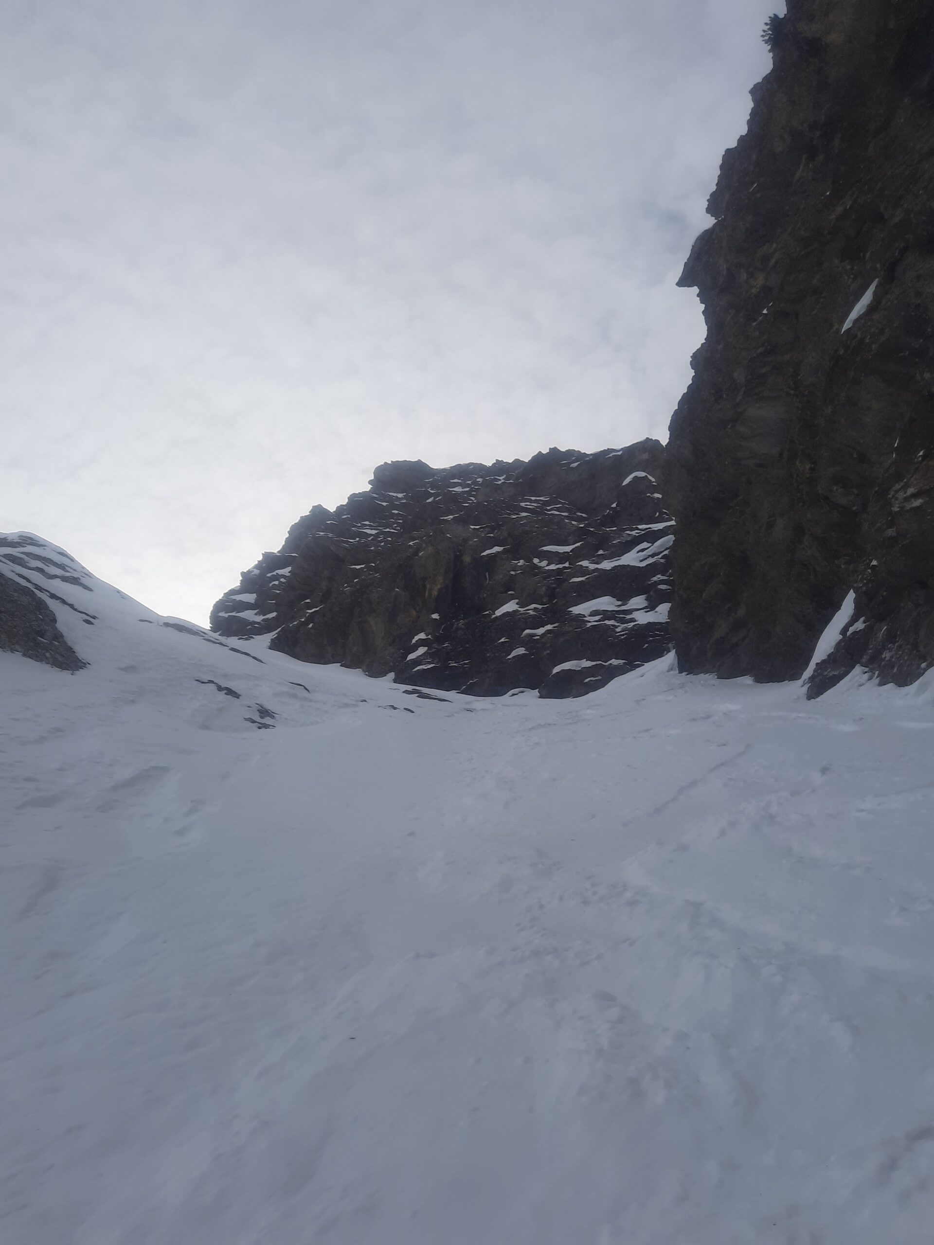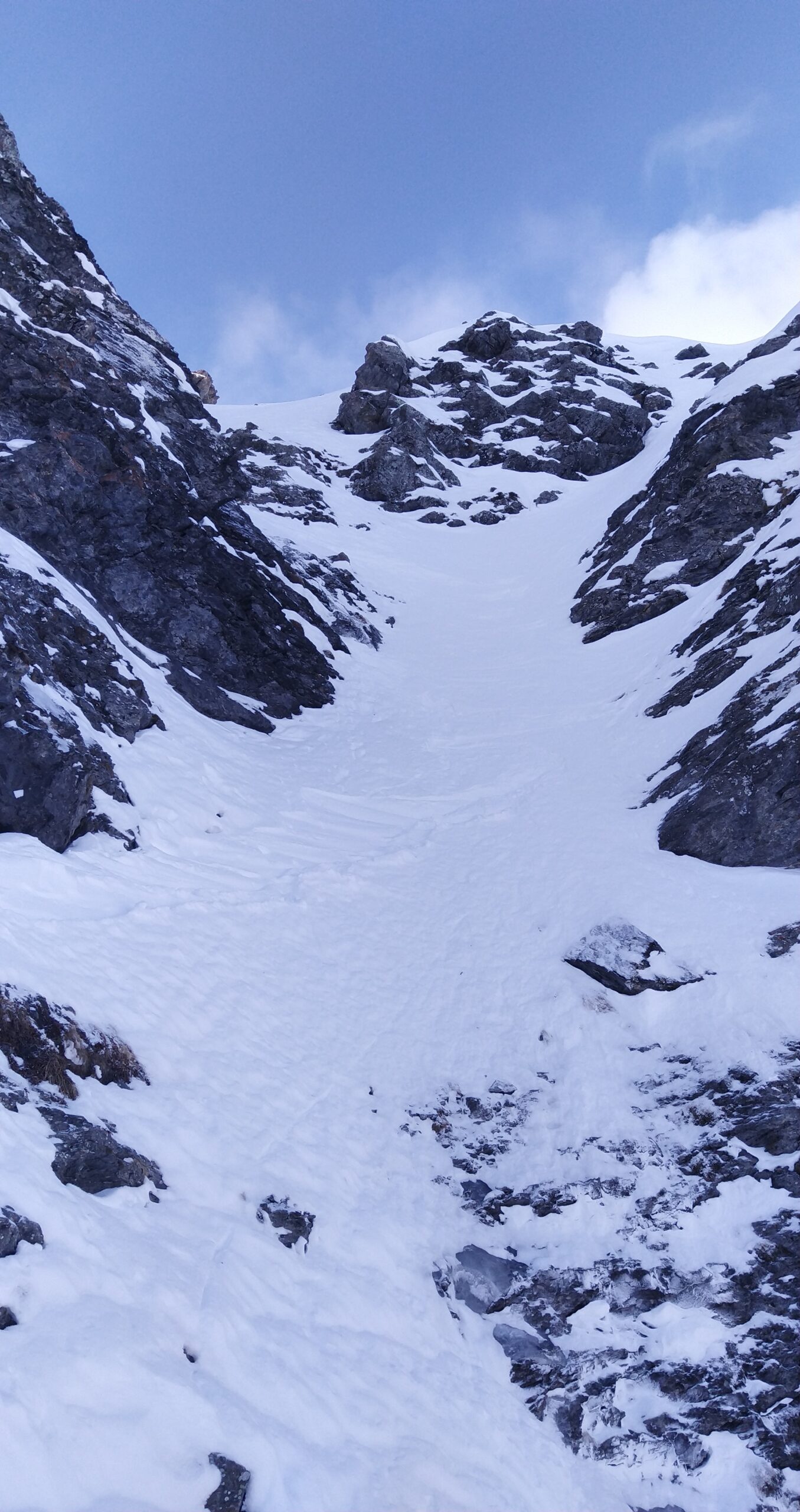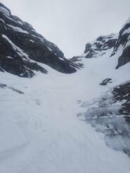 - il Budello: seguire il canale S fino alla strettoia, da lì con un traverso da ricercare a sx si arriva ad una selletta da cui parte il canalino del budello: stretto e ripido, primi 100m a 50° poi continuo a 45, finisce con due balze che possono presentare roccia o ghiaccio. 4.3/5.1 E3/4