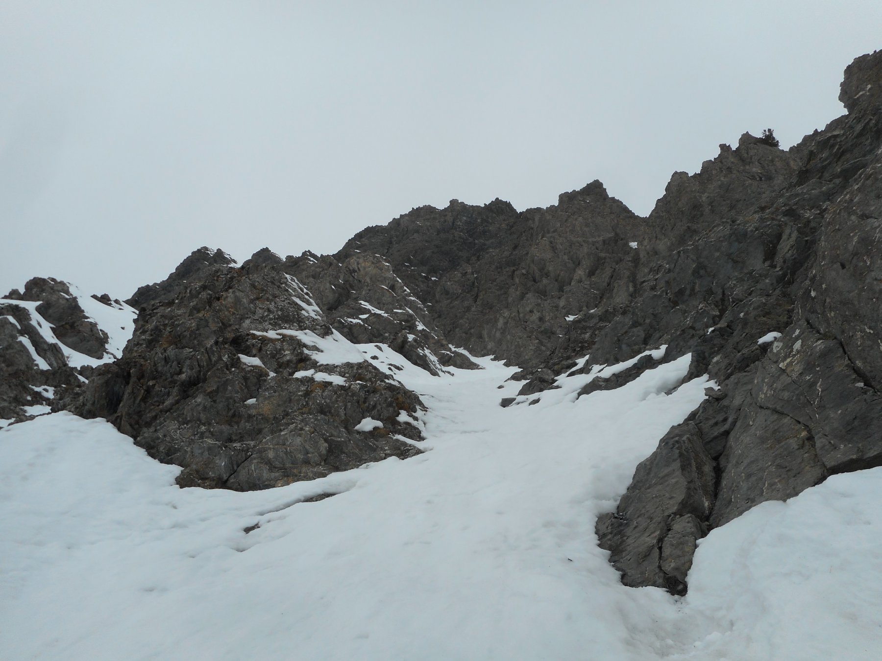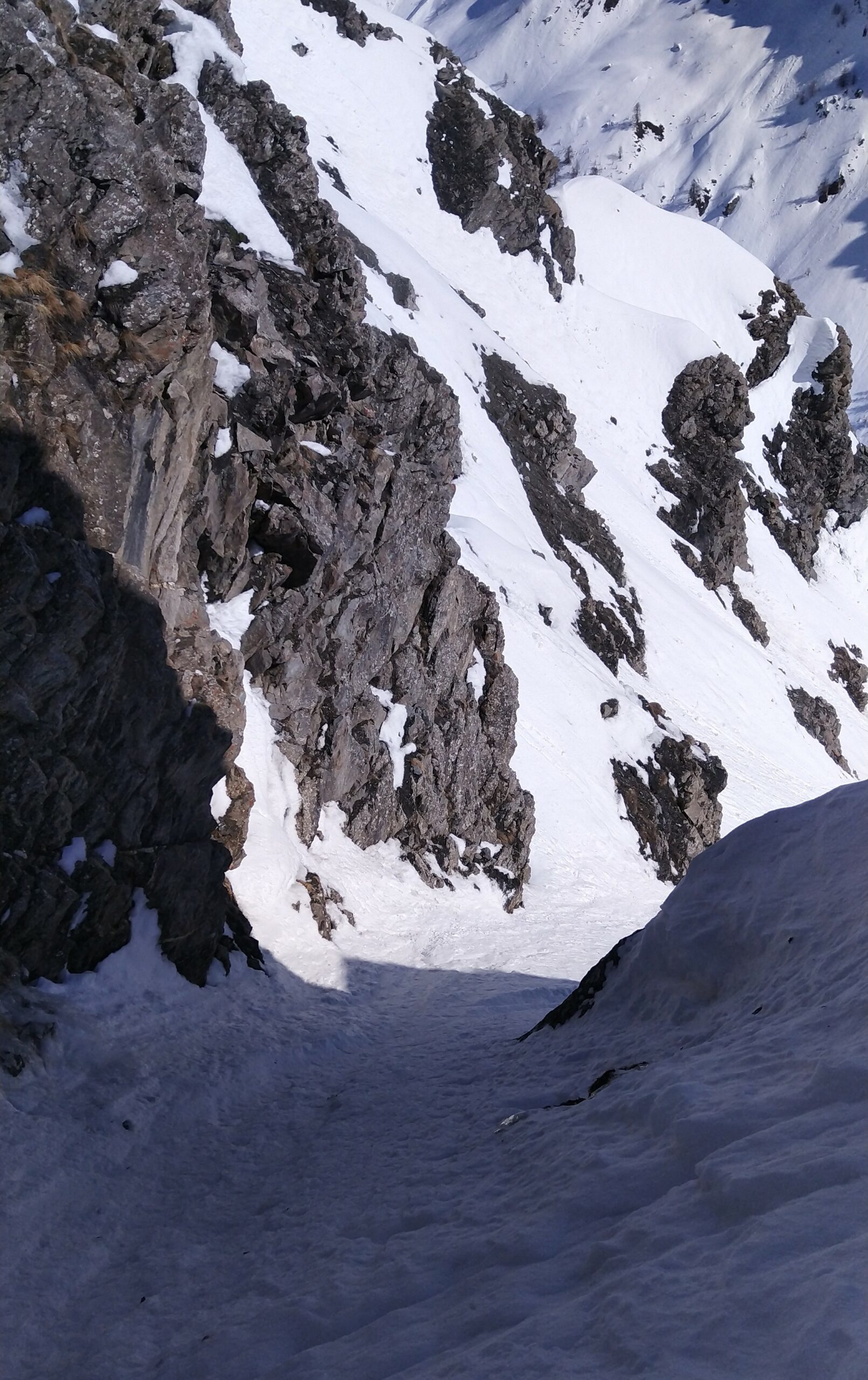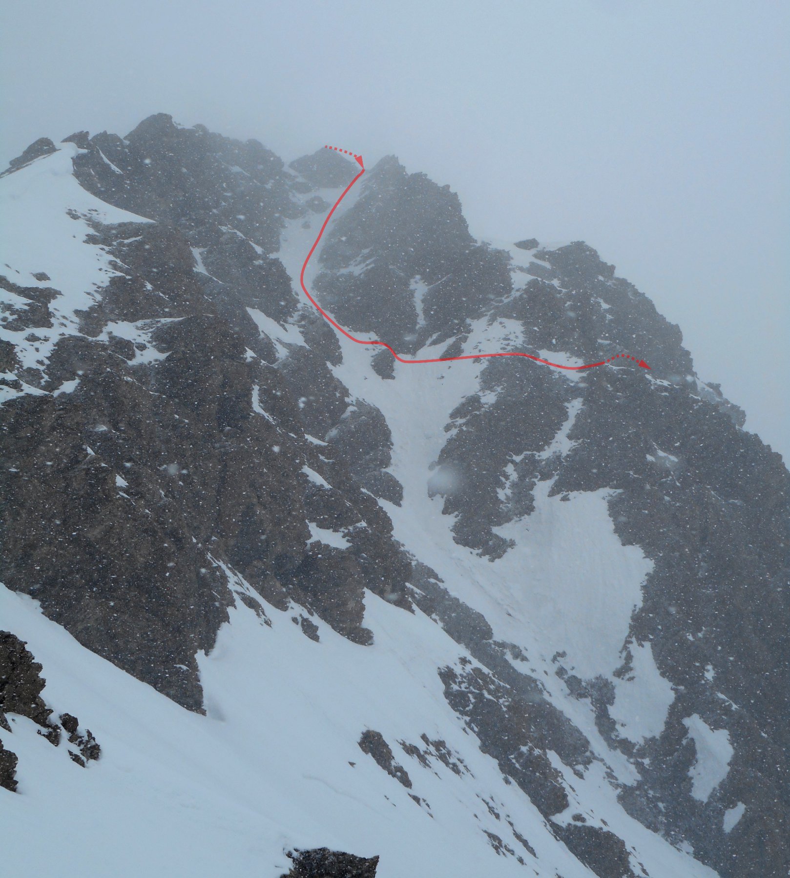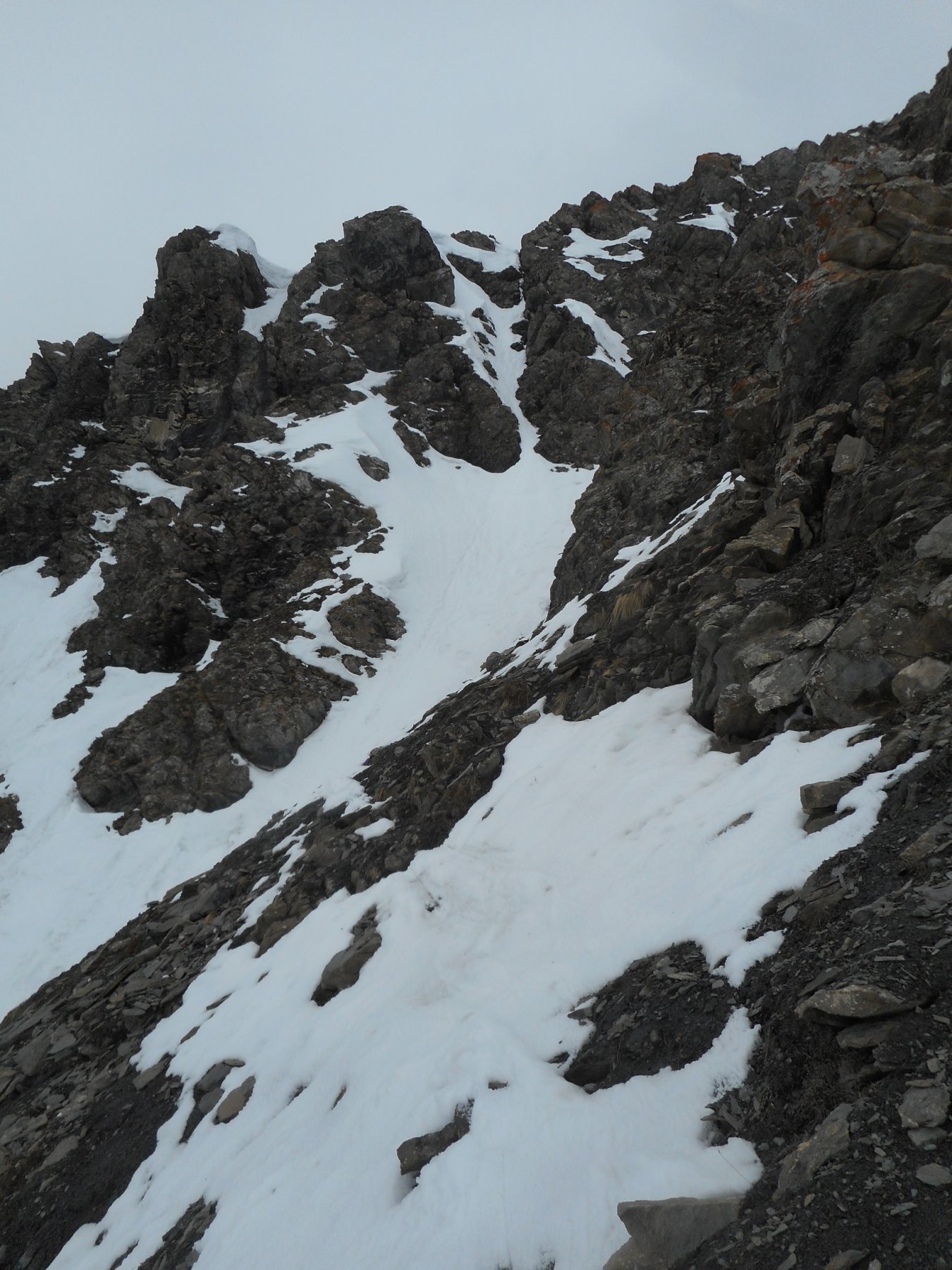- il Budello: seguire il canale S fino alla strettoia, da lì con un traverso da ricercare a sx si arriva ad una selletta da cui parte il canalino del budello: stretto e ripido, primi 100m a 50° poi continuo a 45, finisce con due balze che possono presentare roccia o ghiaccio. 4.3/5.1 E3/4