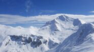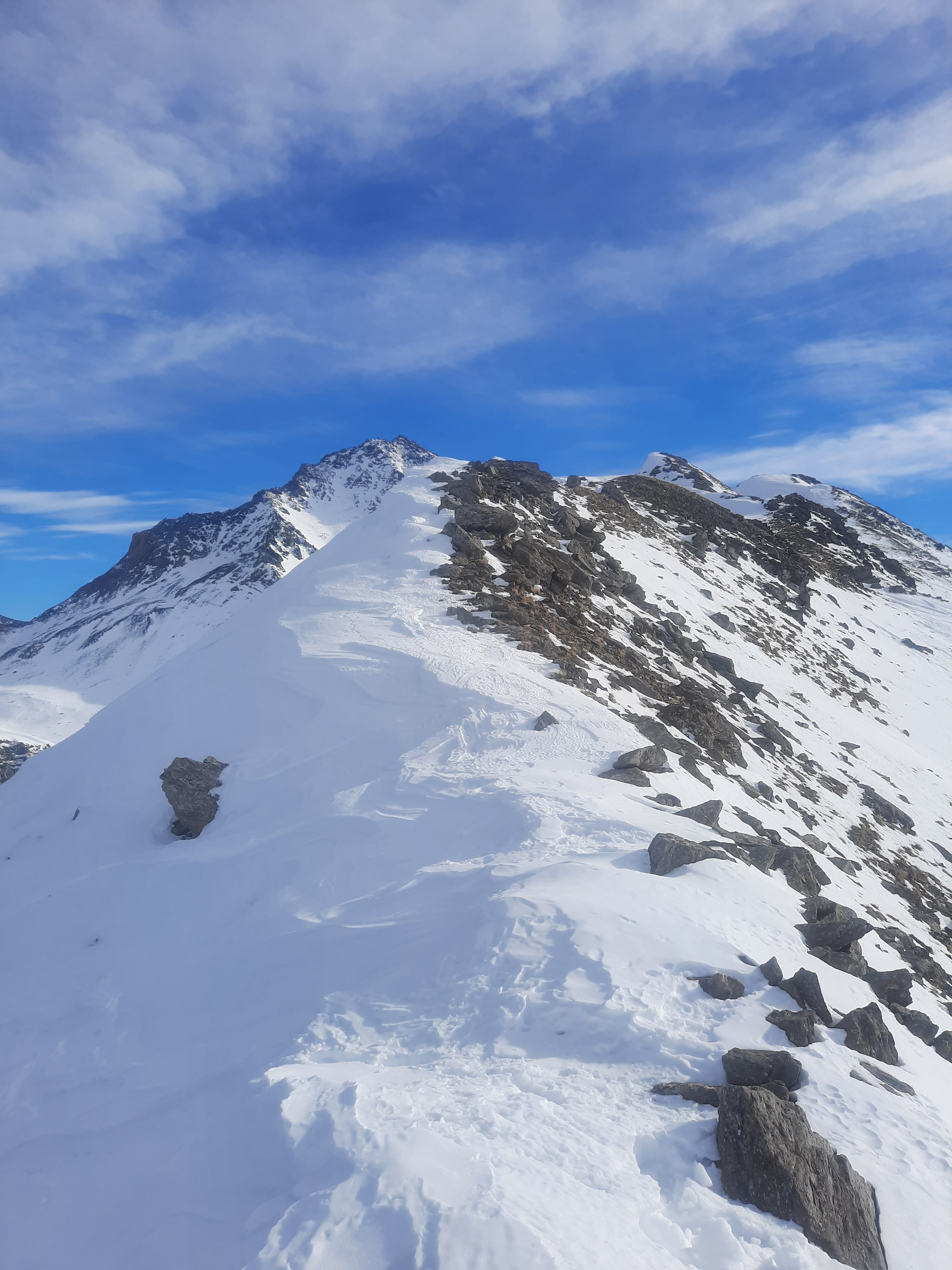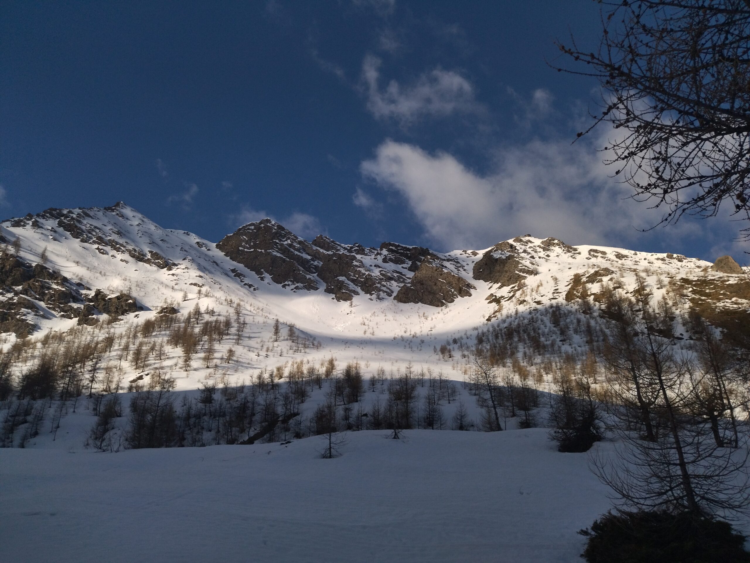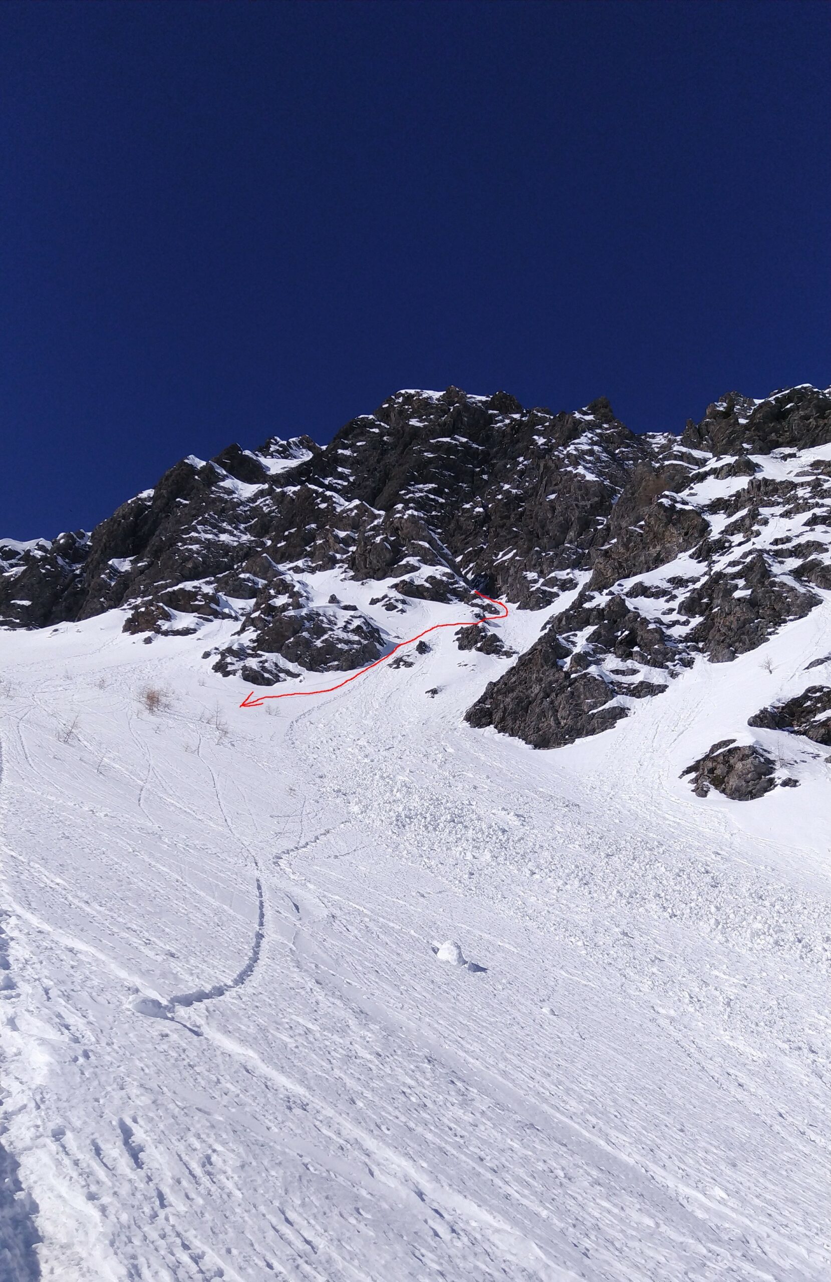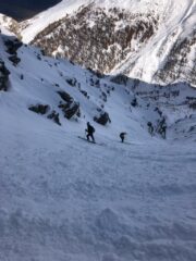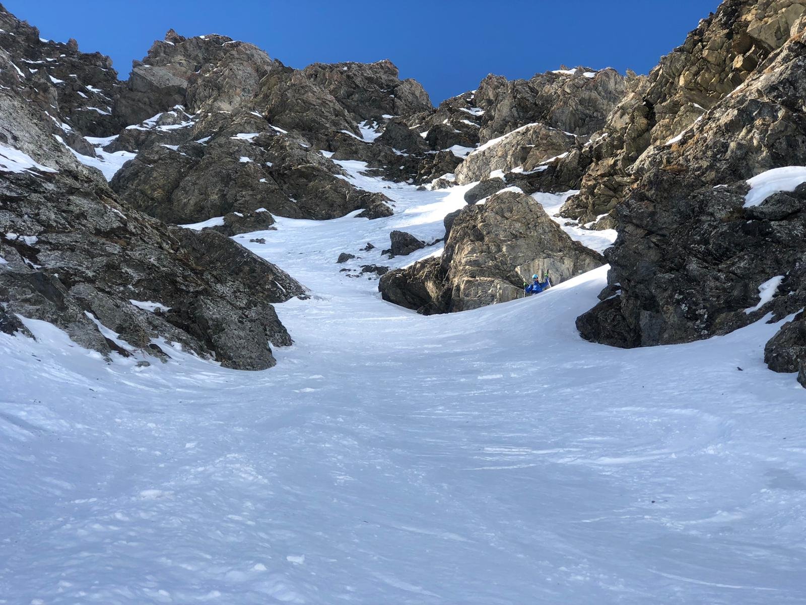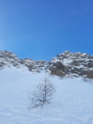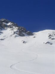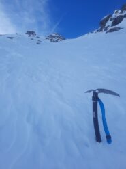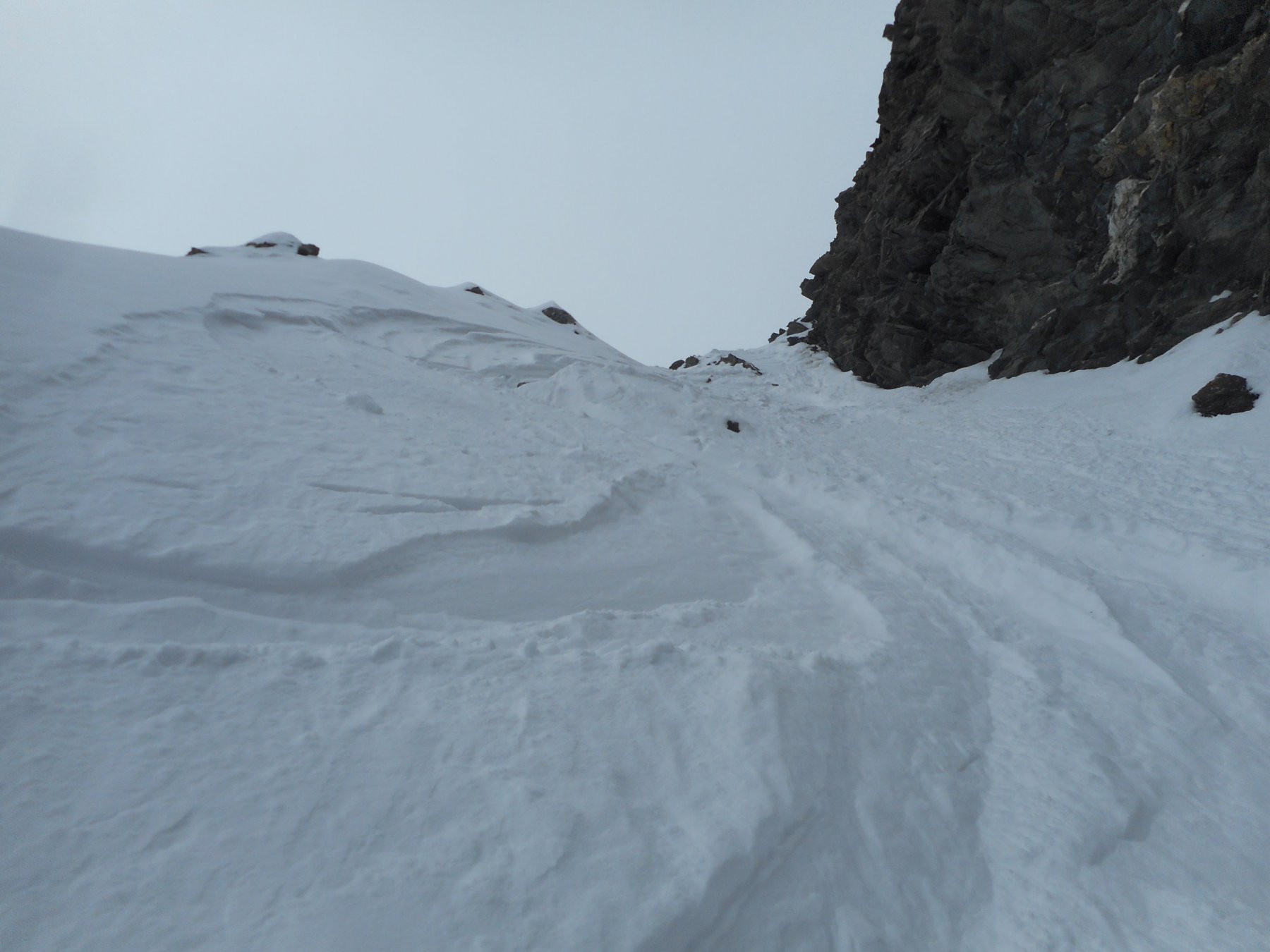 - il Budello: seguire il canale S fino alla strettoia, da lì con un traverso da ricercare a sx si arriva ad una selletta da cui parte il canalino del budello: stretto e ripido, primi 100m a 50° poi continuo a 45, finisce con due balze che possono presentare roccia o ghiaccio. 4.3/5.1 E3/4