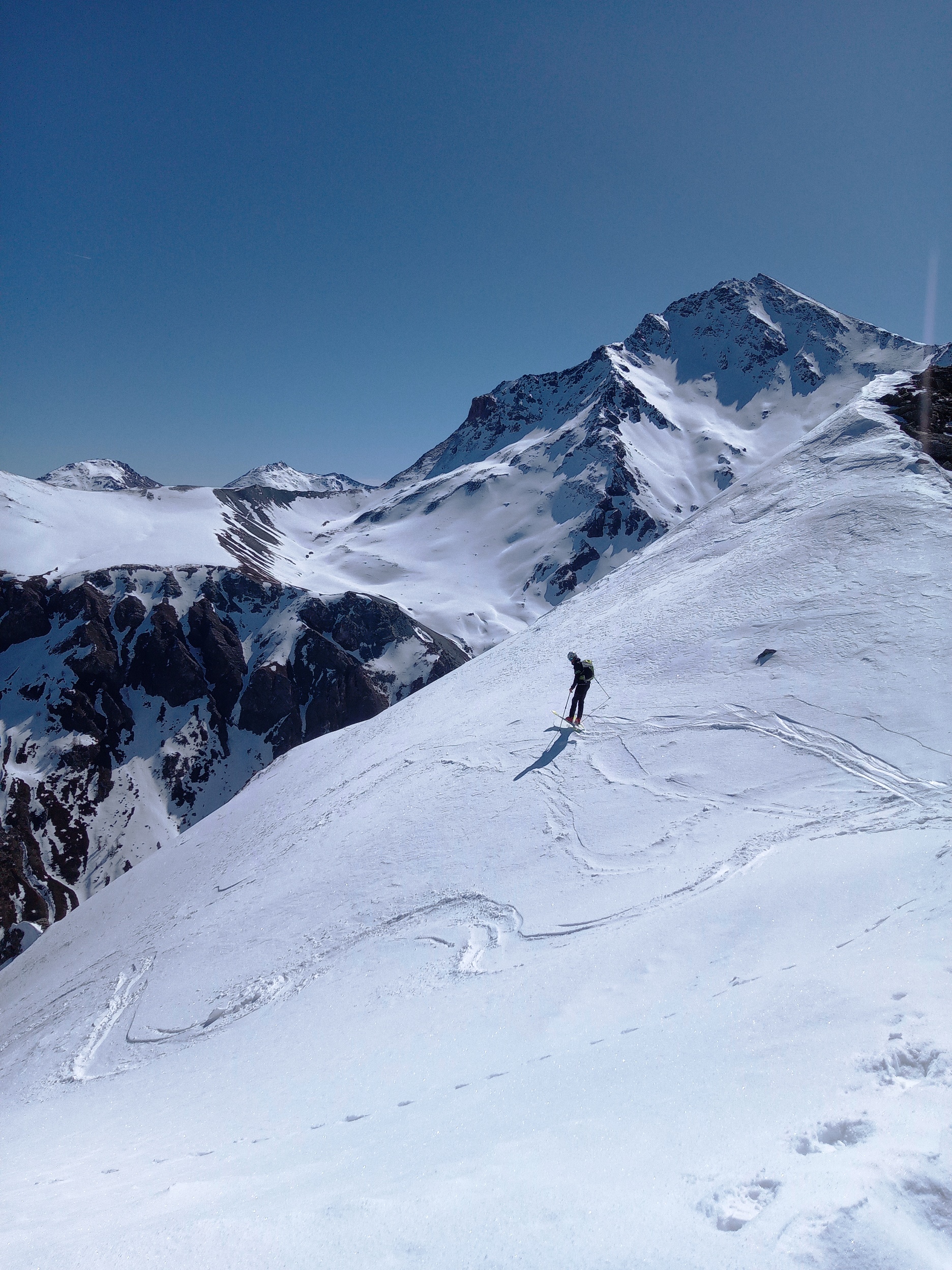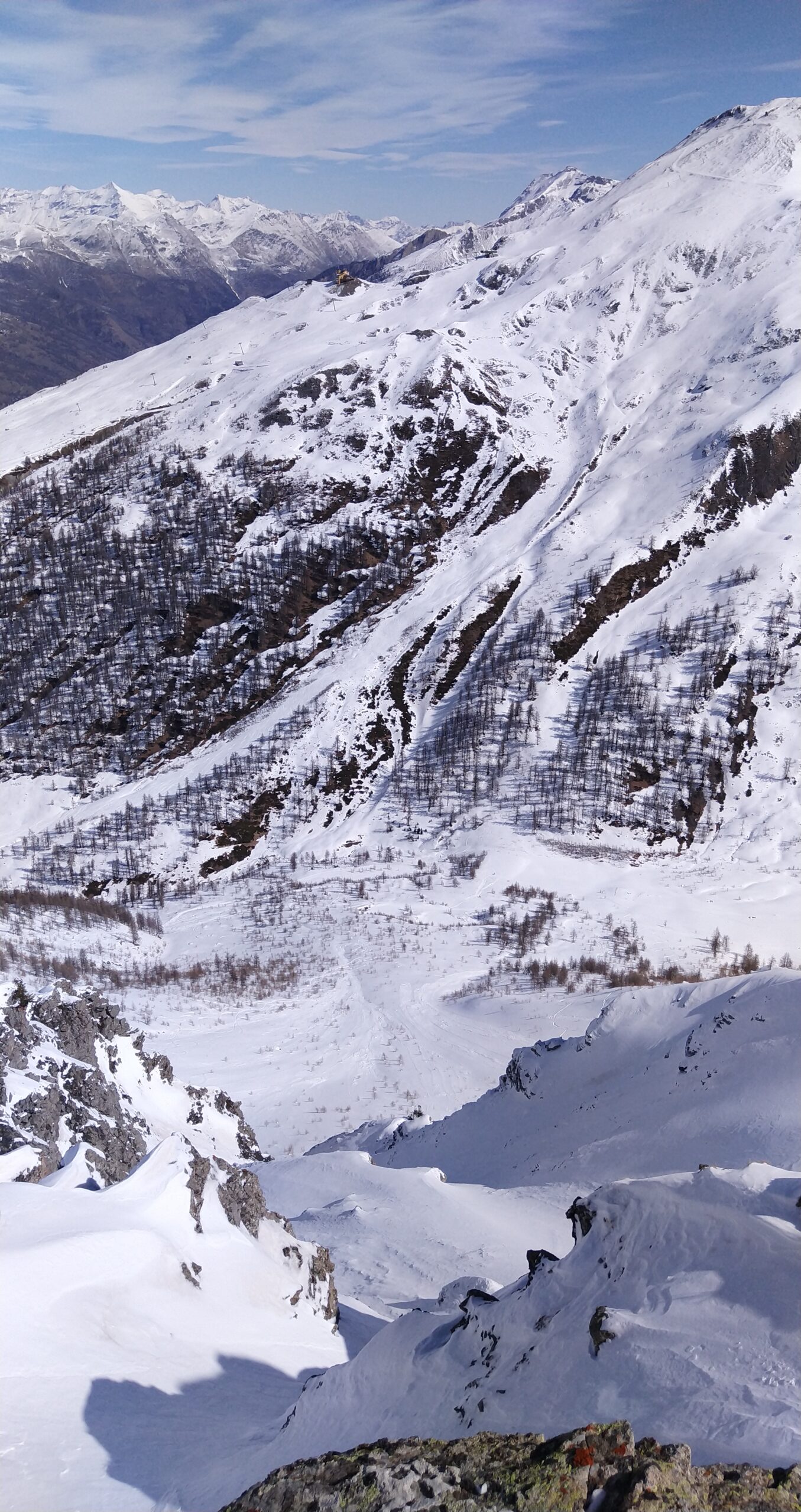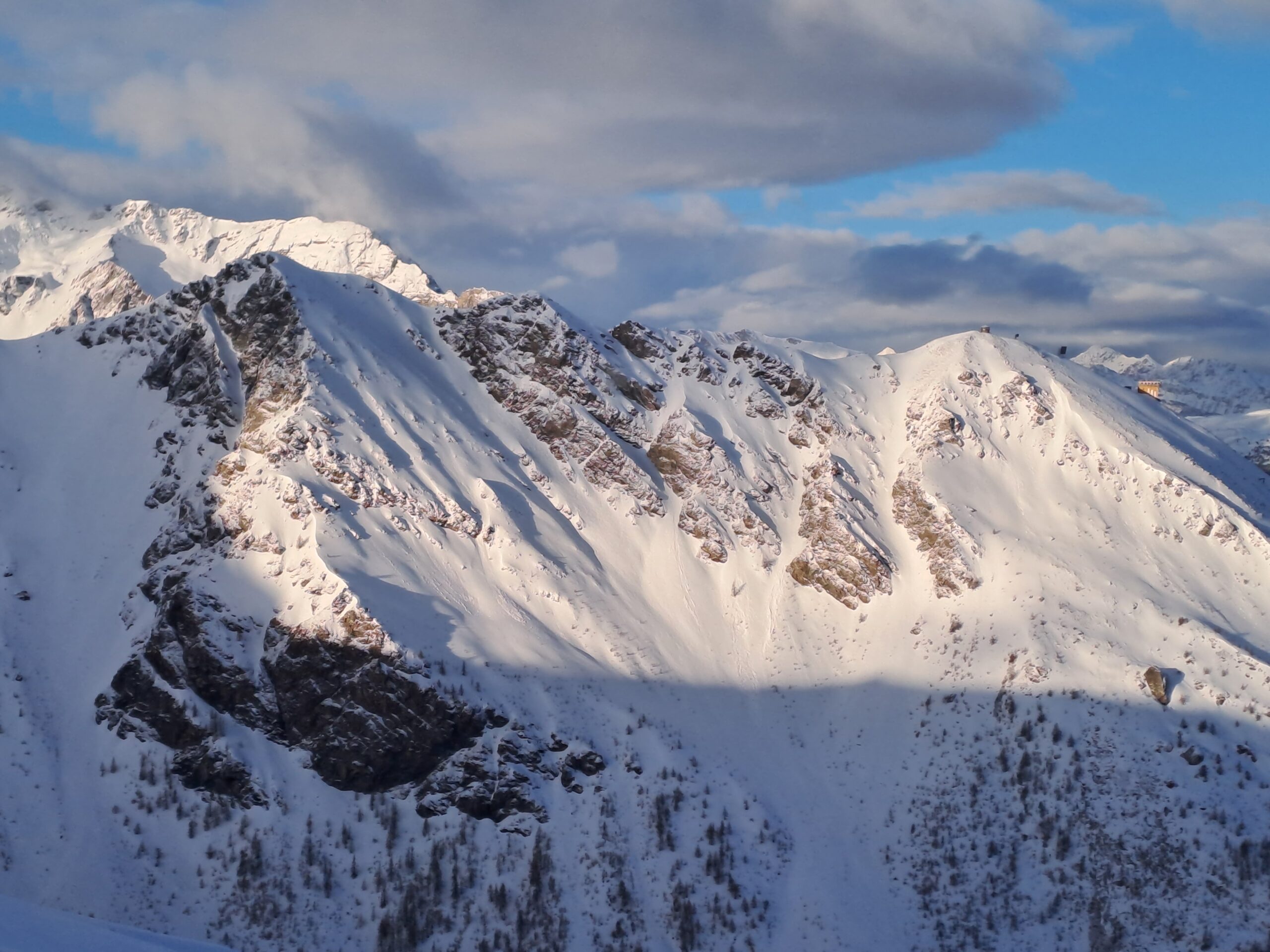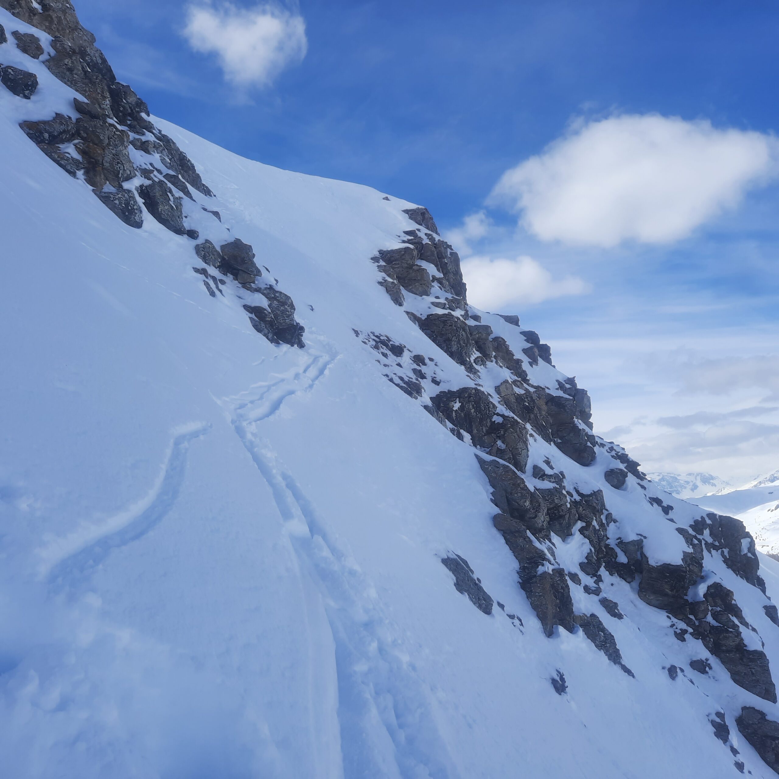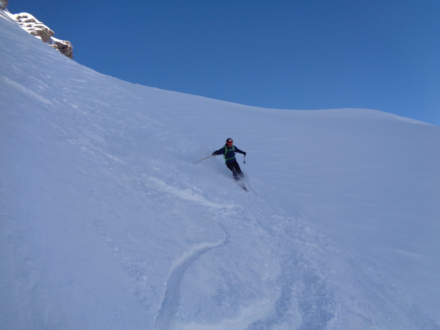 - Faina: parte direttamente dalla costruzione di vetta e scende in mezzo a balze e quinte rocciose in un ambiente bello ma mai troppo ripido (max 40°). Variante di sx consigliabile in caso di scarso innevamento. 4.1 E2