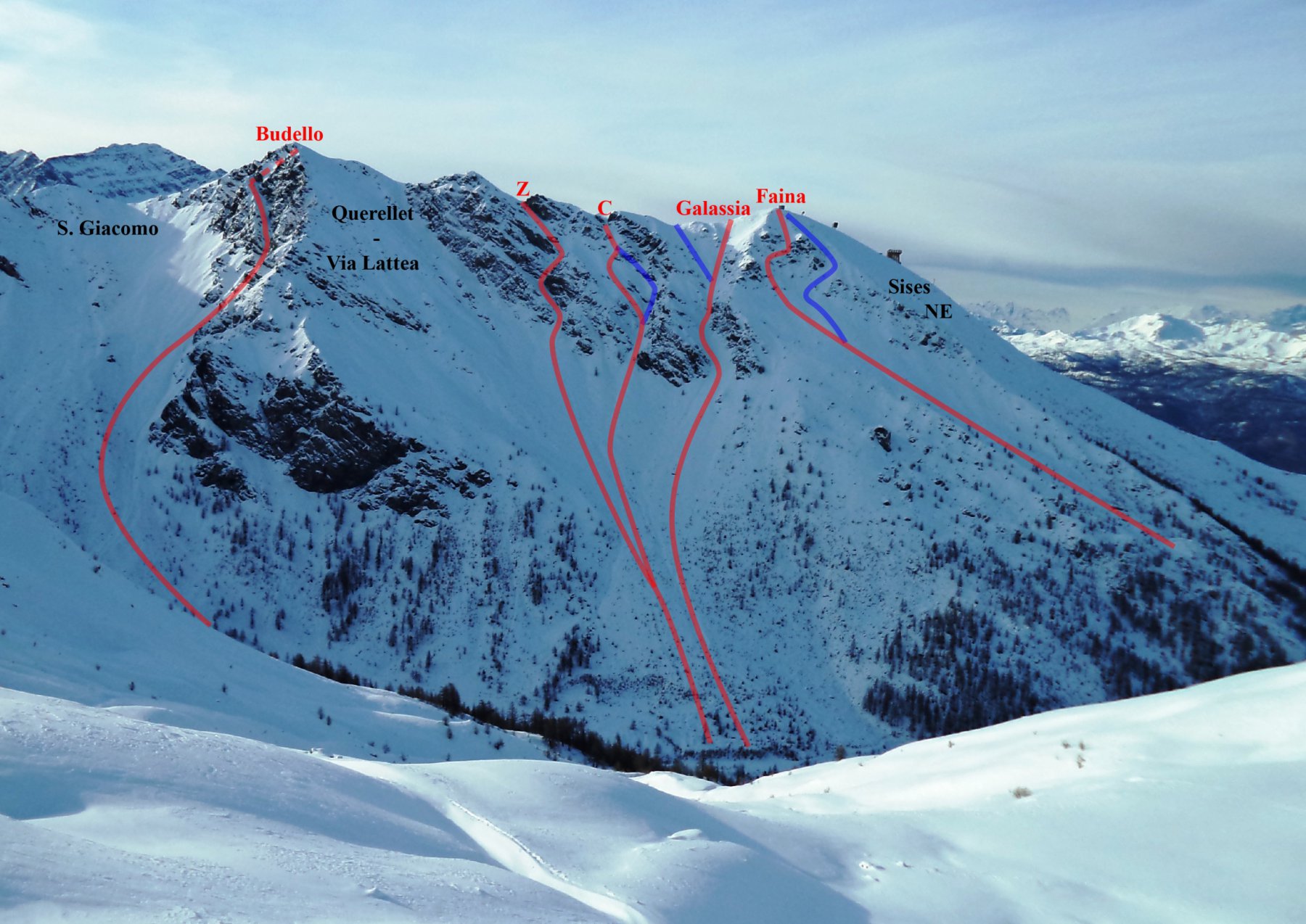 - Galassia: vero e proprio canale rettilineo che parte da dietro la vetta del Sises, esposizione in pieno E e pendenze mai eccessive (35°-40°). 4.1 E1