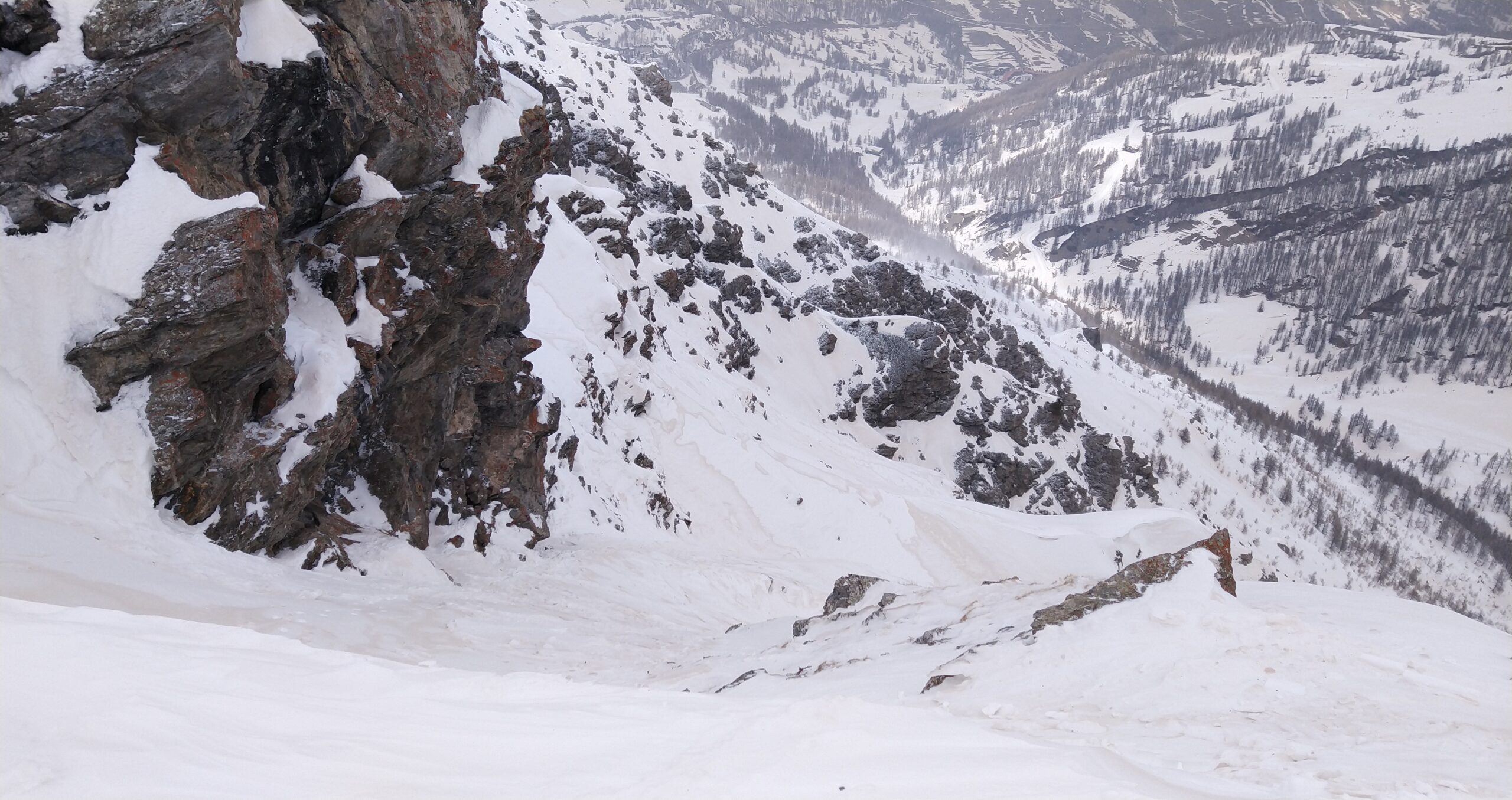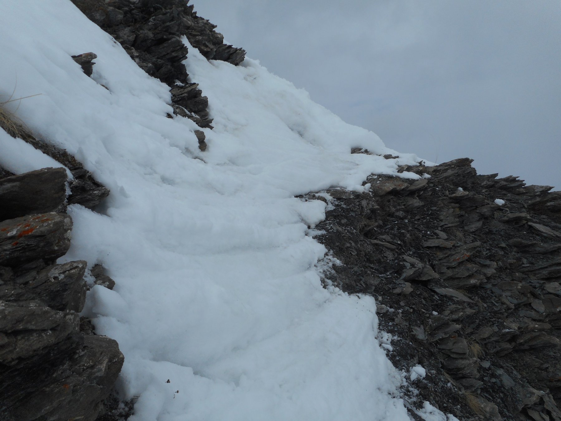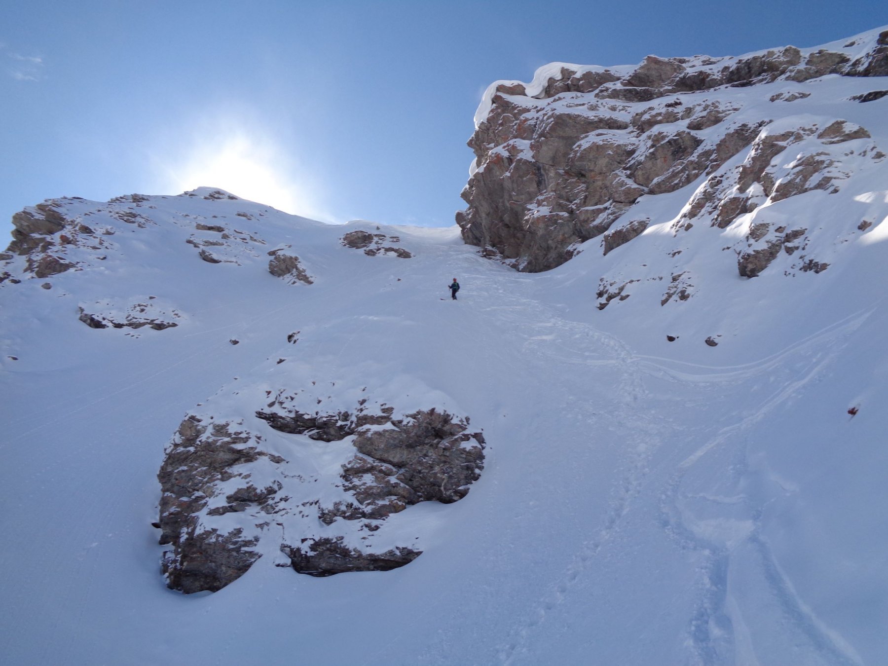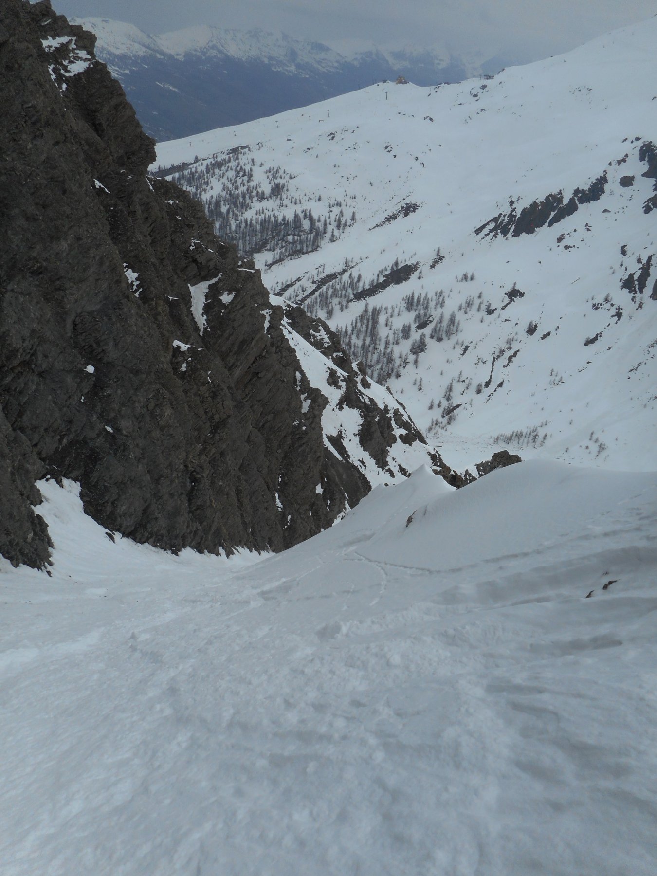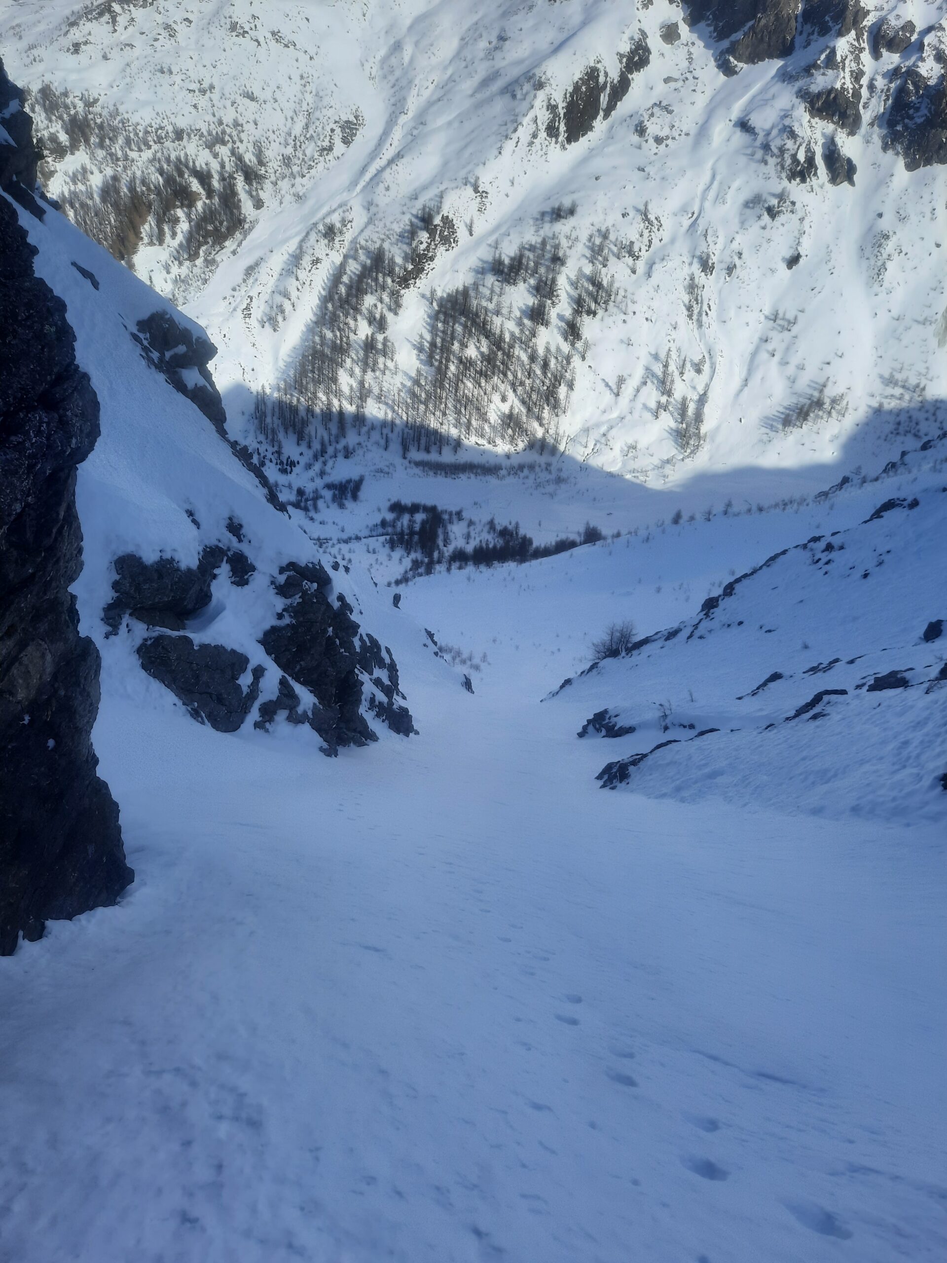 - Canale S: dalla vetta del Querellet affacciarsi a sx e scendere un breve pendio (5-10m) molto esposto, che dà accesso ad una selletta da cui parte il canale S (tutto più vicino ai 45° che ai 40°). Si sbuca sotto il passo san giacomo. 4.2/4.3 E3