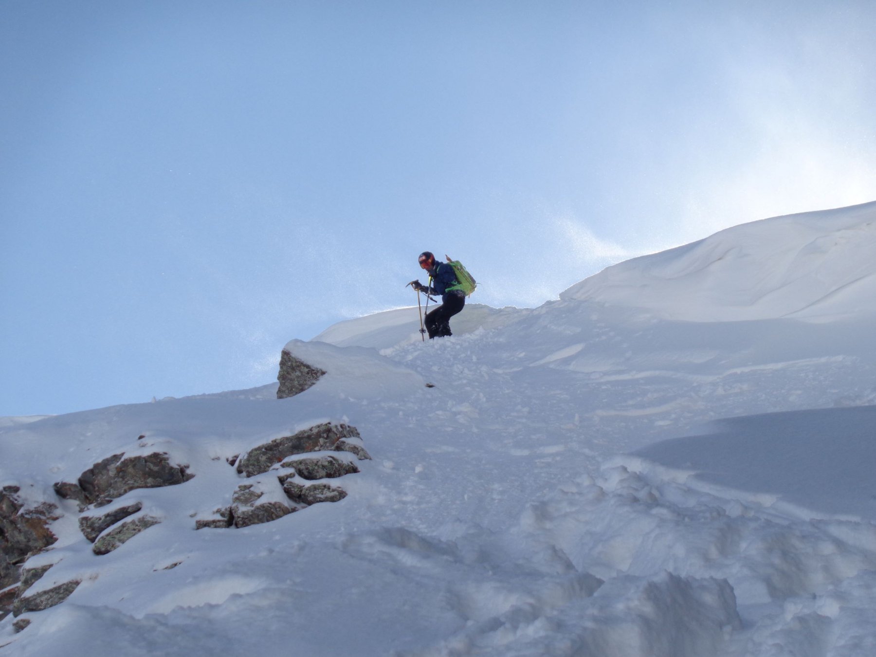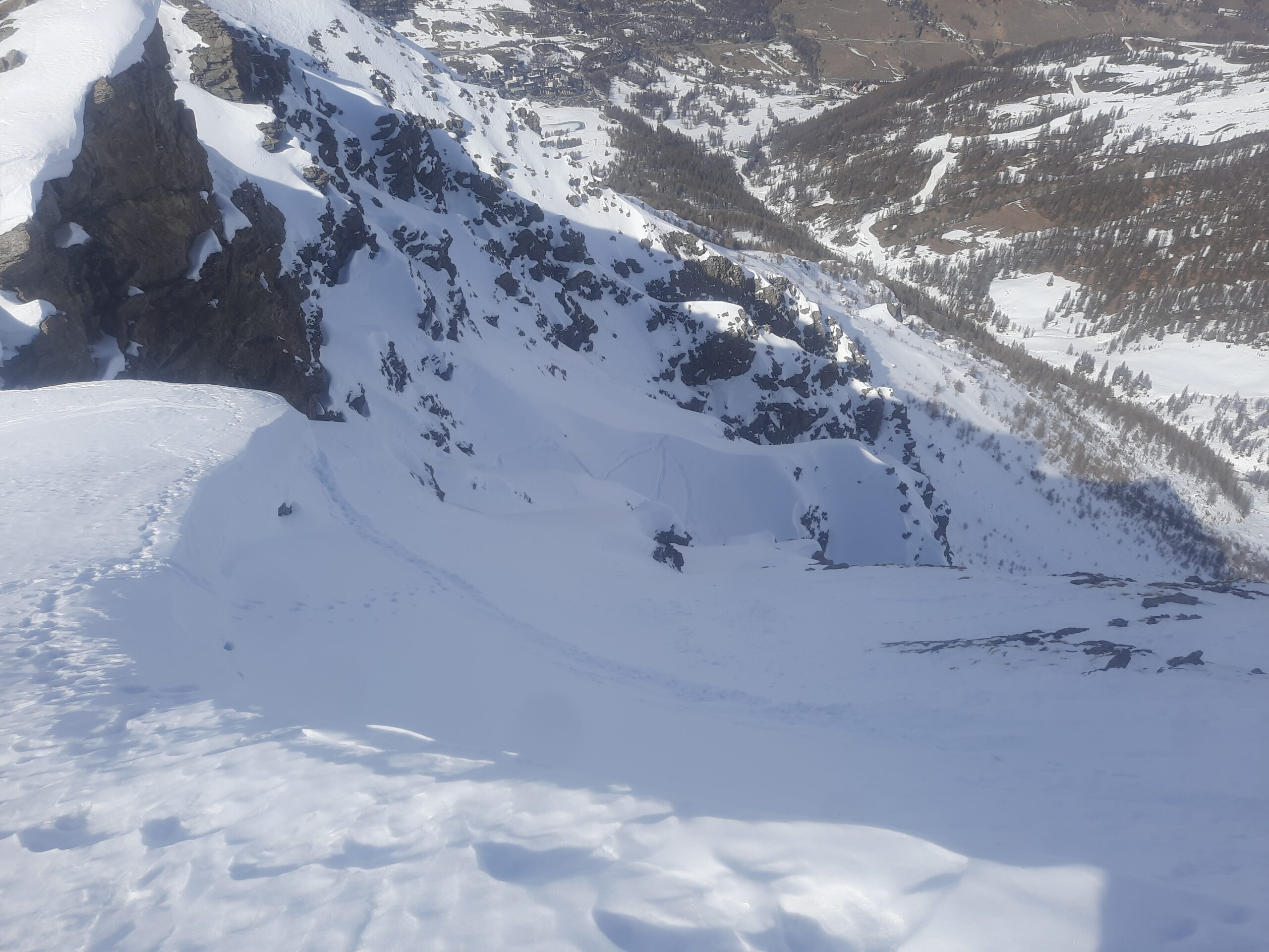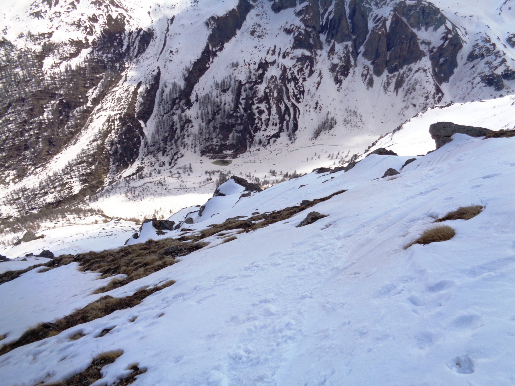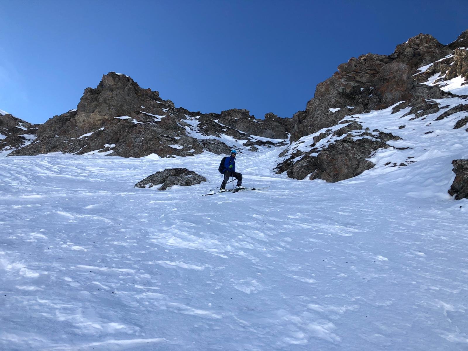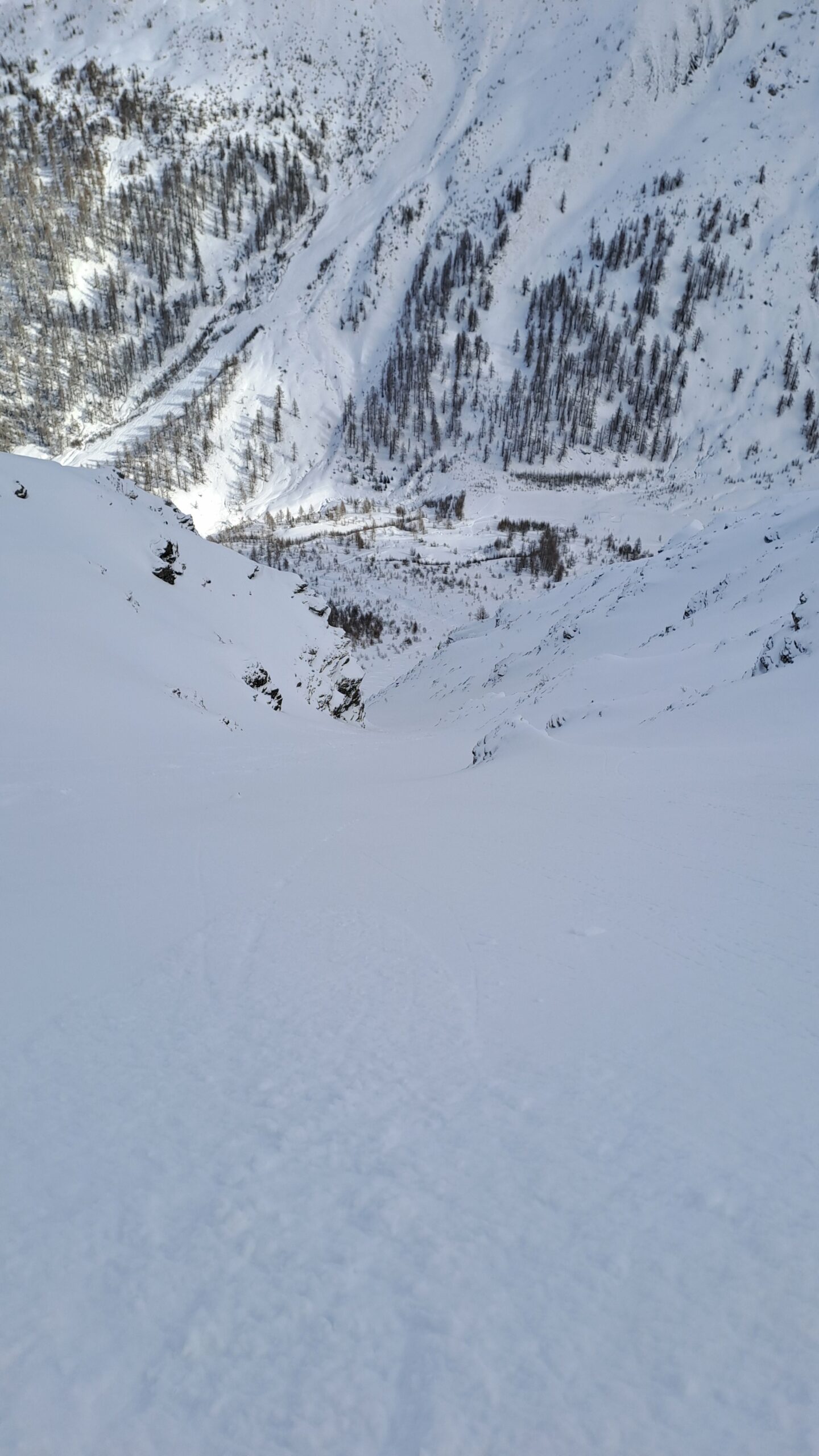 - Canale S: dalla vetta del Querellet affacciarsi a sx e scendere un breve pendio (5-10m) molto esposto, che dà accesso ad una selletta da cui parte il canale S (tutto più vicino ai 45° che ai 40°). Si sbuca sotto il passo san giacomo. 4.2/4.3 E3