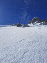 Avrei voluto ridiscendere il canale nella variante di sinistra ma purtroppo, stranamente, c’erano tante pietre scoperte.