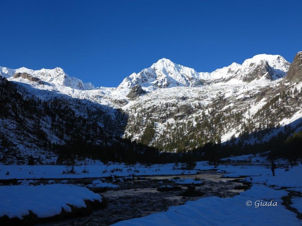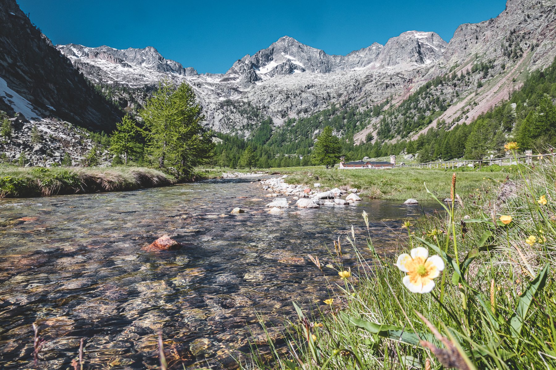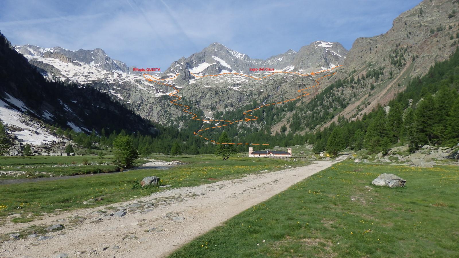 Dal posteggio si prosegue lungo la sterrata che si inoltra nel vallone del Valasco, sfruttando poi il bel sentiero che permette di evitarne un lungo tratto, prima di incontrarla nuovamente all’imbocco del Piano del Valasco, dove si raggiunge l’omonimo rifugio 1765 m. Proseguendo sulla rotabile si continua a monte del rifugio, deviando poi a sinistra raggiungendo il Piano superiore del Valasco. Attraversato il torrente su un ponte in legno (qui purtroppo la strada è stata portata via dalle alluvioni) si riprende a salire con numerosi tornanti (qualche possibile scorciatoia ma un po’ impervia) fino a circa 2000 m dove si incontra il bivio per il Rifugio Questa (qui il cartello indica un’ora di salita).