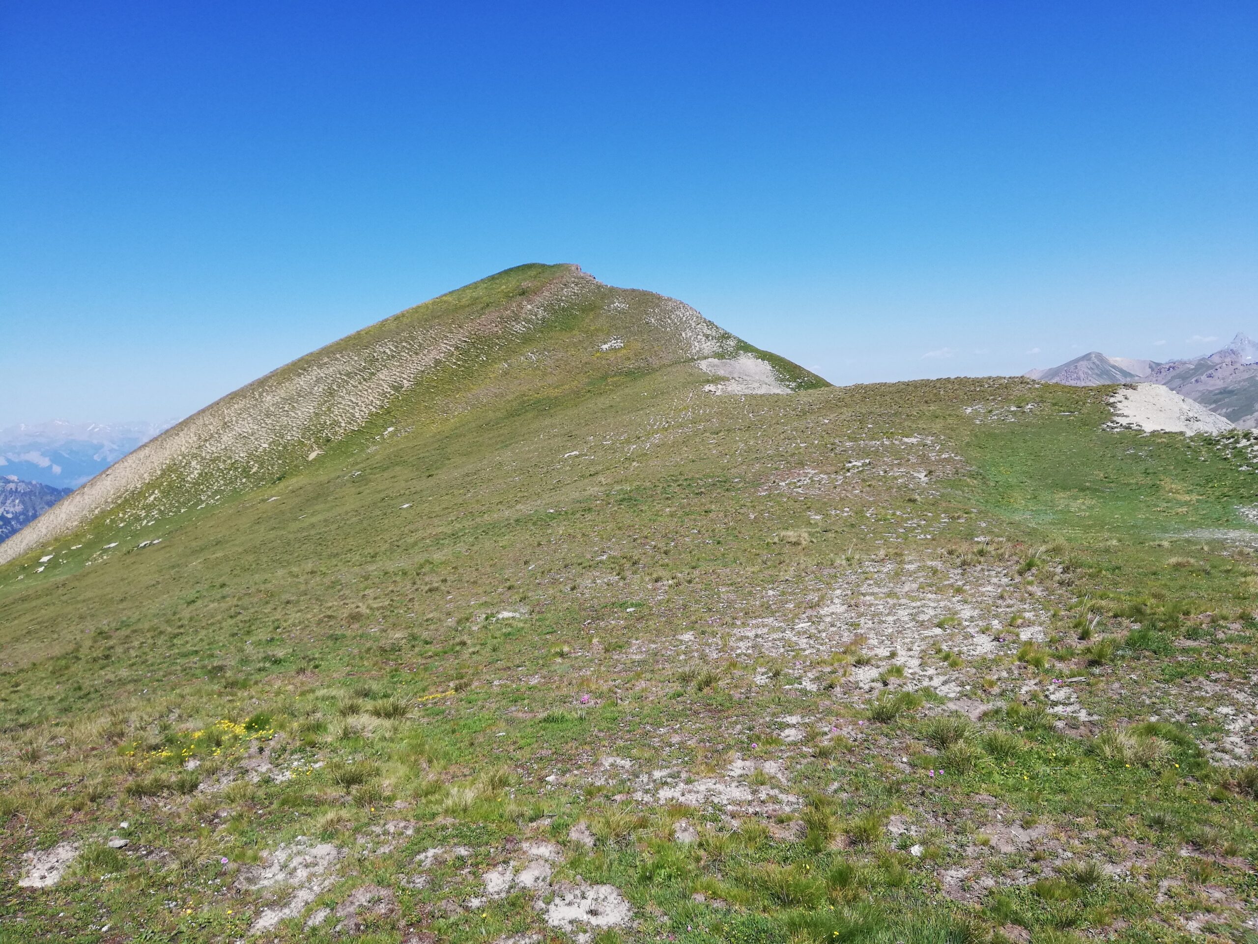 Salendo alla meglio su erba senza difficoltà si guadagna la parte alta dell’ avvallamento dove la pendenza si abbatte e si esce sul crinale SE del Queyrellet molto panoramico e a precipizio sul Vallon Cristillian lungo il quale raggiunge la cima.