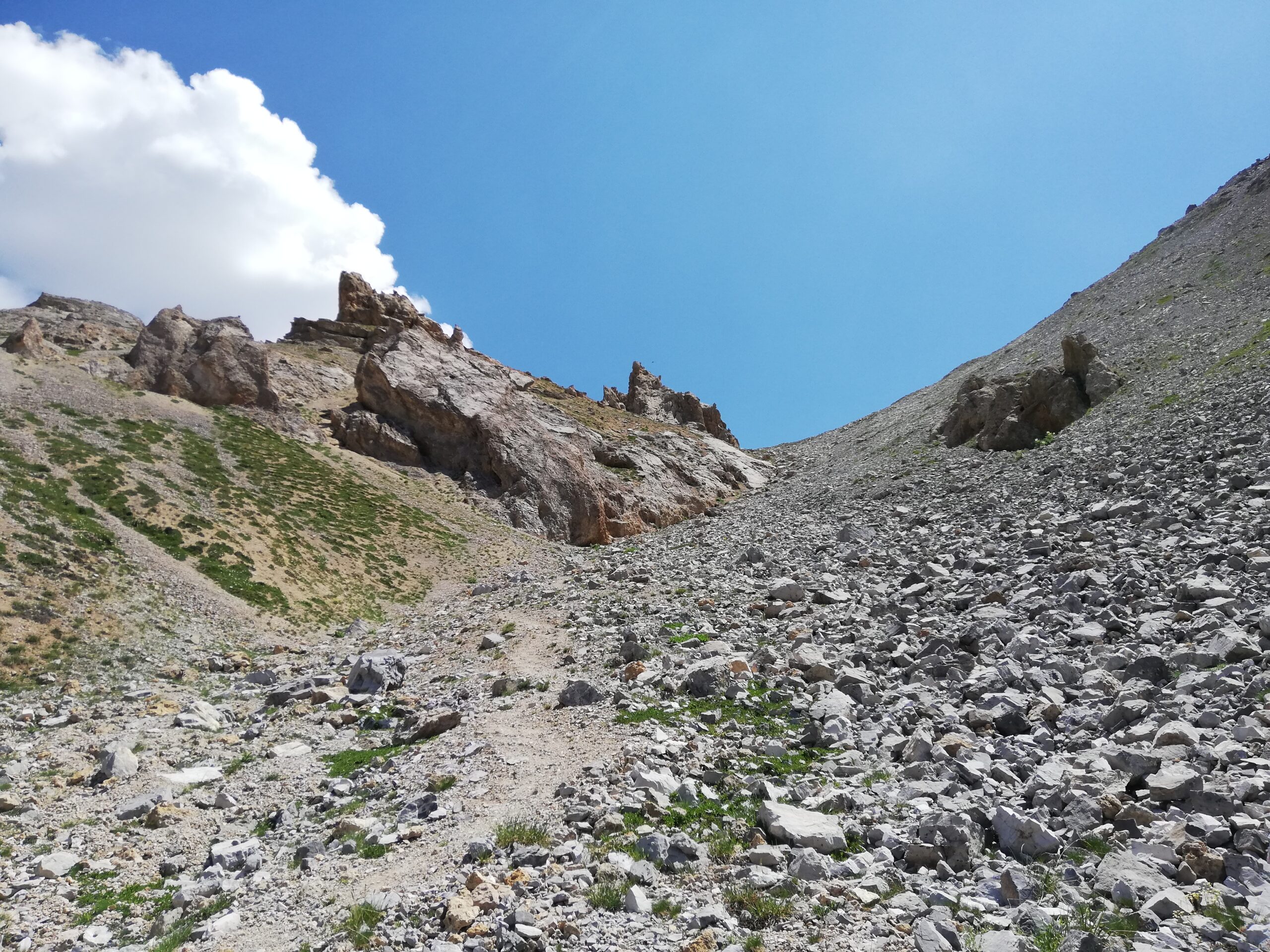 Scendendo sul versante opposto su ripido pendio ghiaioso (EE) tra guglie calcaree si arriva al Col Beauarnon dove termina una vaga traccia lungo l’omonimo vallone.