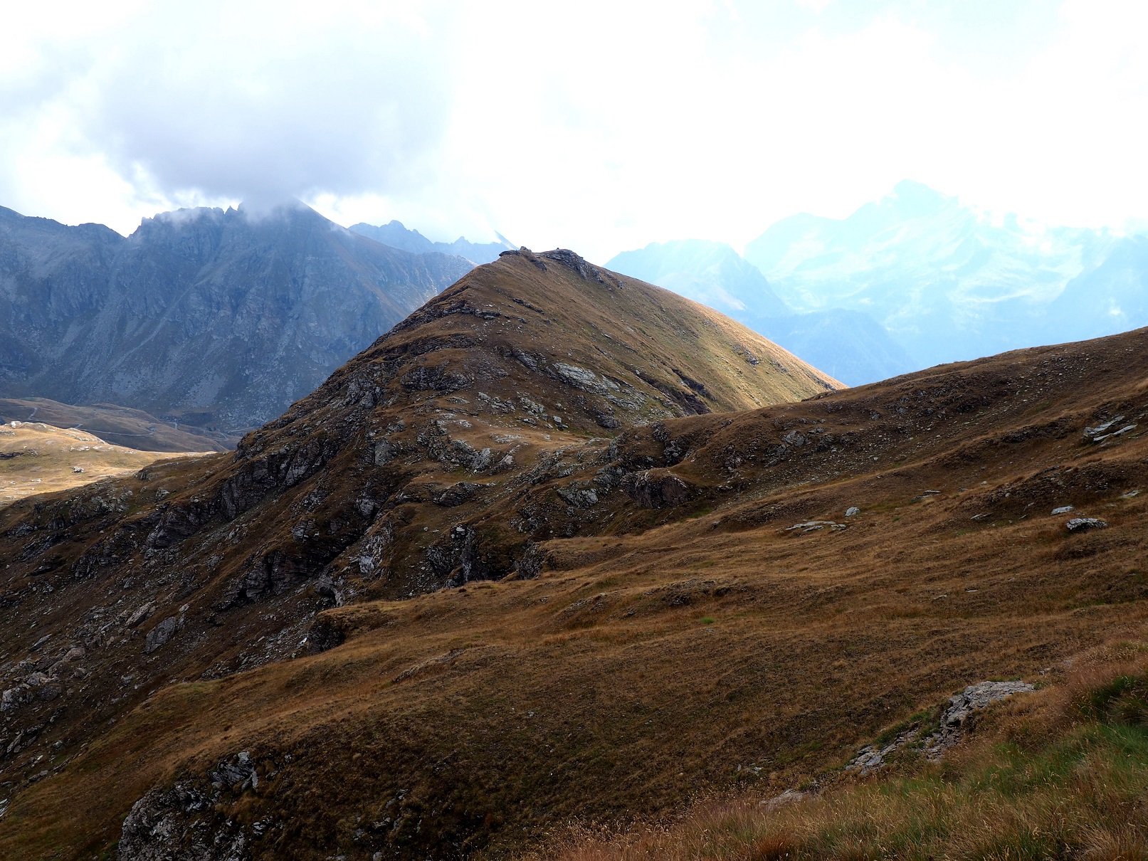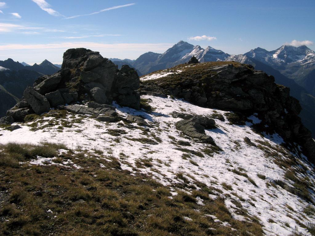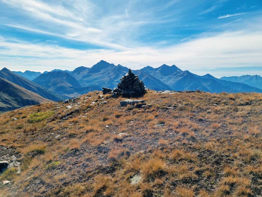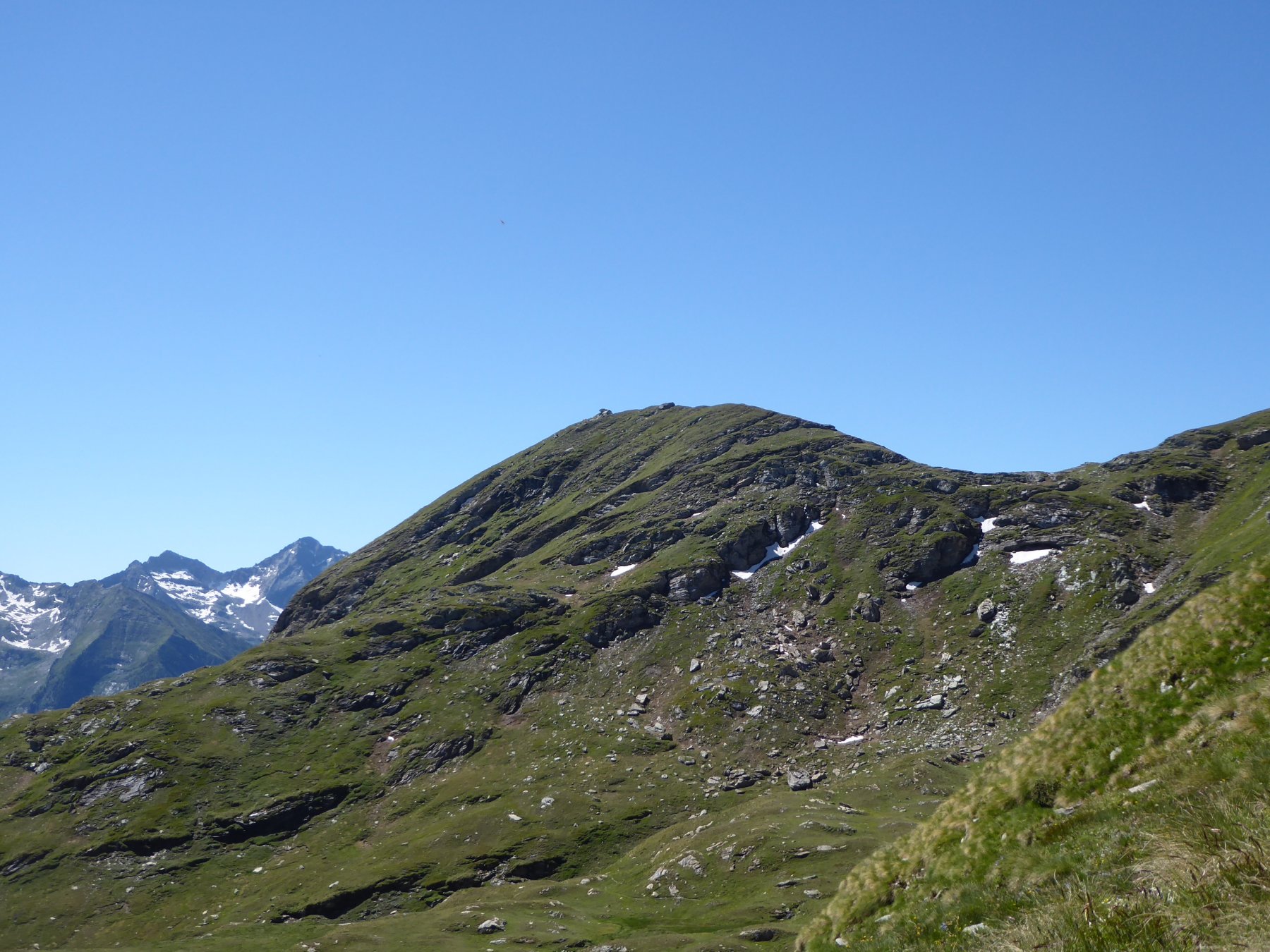 Dall’intaglio si prosegue a sinistra seguendo la traccia che aggira sul versante nord un dosso detritico, giungendo poi sull’ampia dorsale erbosa che con alcuni saliscendi conduce al grosso ometto posto in cima.
