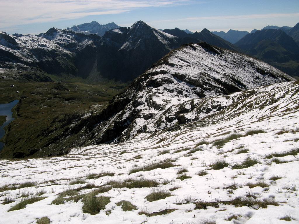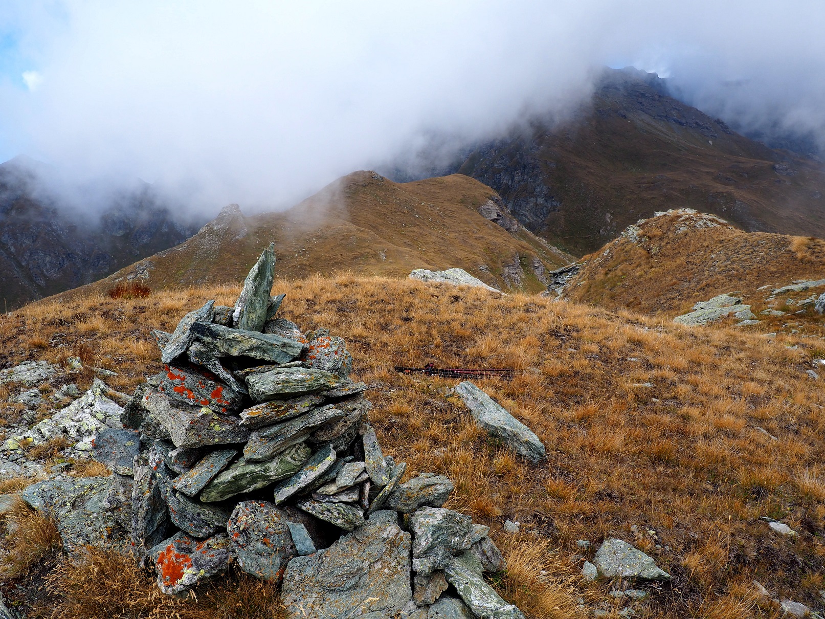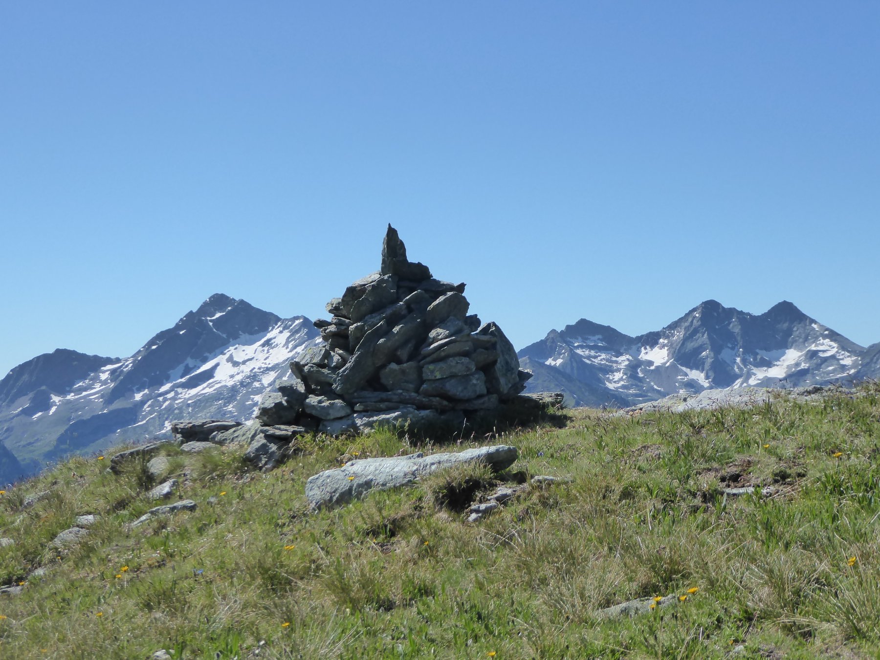 Dall’intaglio si prosegue a sinistra seguendo la traccia che aggira sul versante nord un dosso detritico, giungendo poi sull’ampia dorsale erbosa che con alcuni saliscendi conduce al grosso ometto posto in cima.