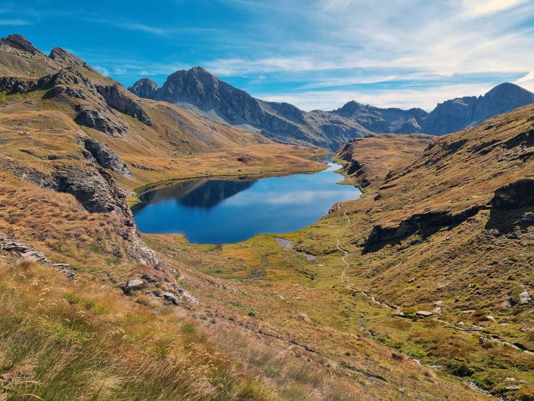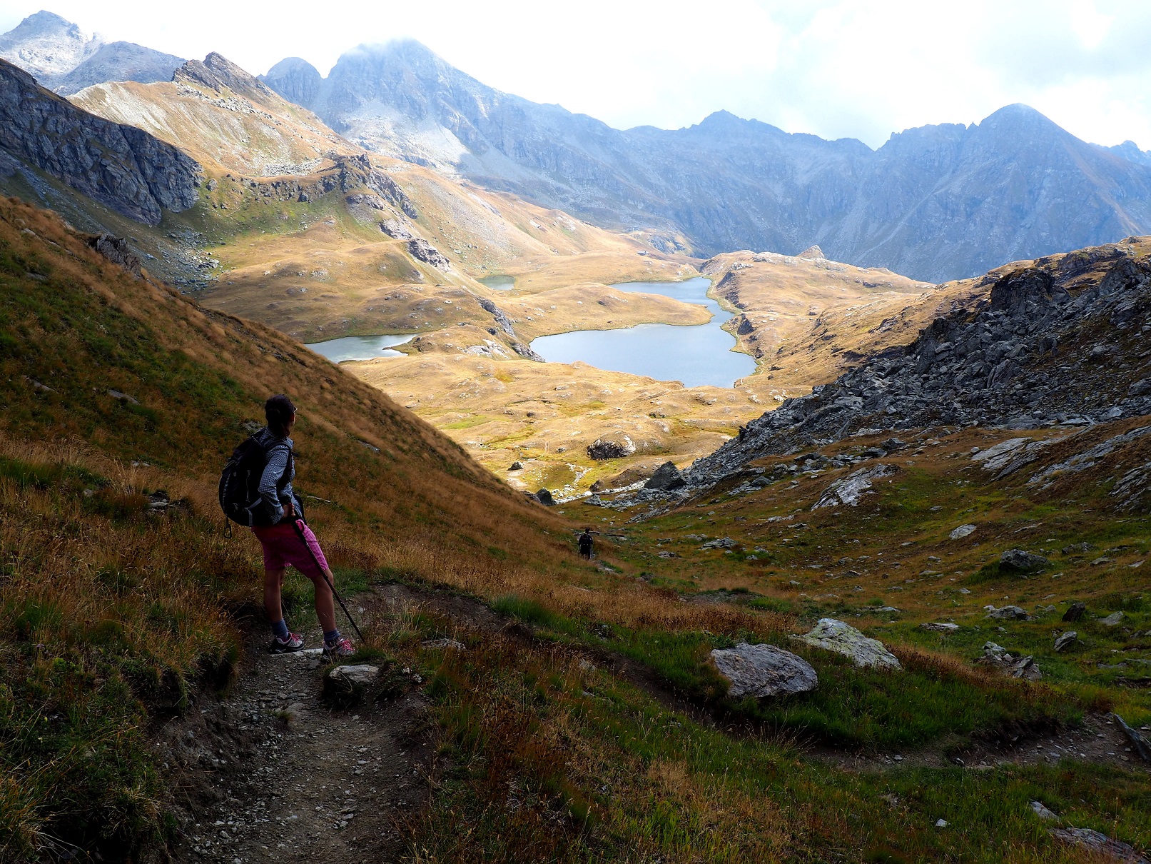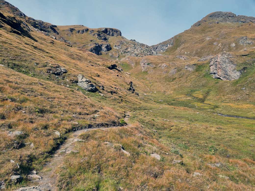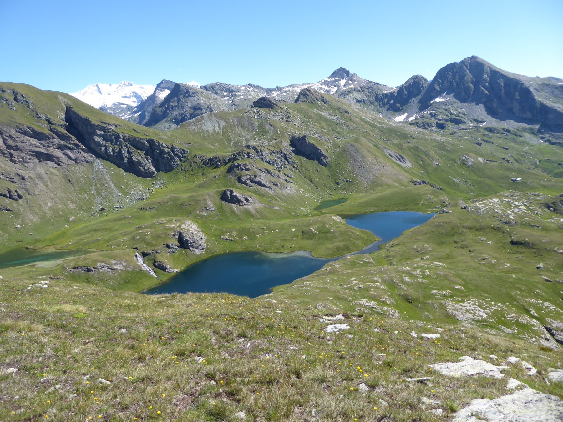 Dal lago si prosegue sul dolce sentiero che attraversa i ripiani erbosi ed un ruscello, prima di iniziare un lungo traverso che costeggia le pendici del Mont Quiappa, prima di scendere in modo diretto al pascolo con l’Alpe Quiappa.