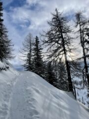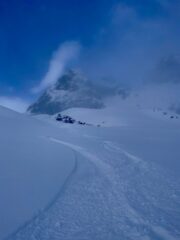 Vista la meteo incerta parto con poche aspettative. Arrivo ad All’Acqua con 15/20 cm di neve depositata il giorno prima, cielo con poche nubi e temperatura prossima allo 0. Decido di salire in Piansecco per poi vedere il da farsi. Faccio squadra con Pietro, conosciuto sul percorso e con il quale condivideró tutta la gita. Dopo la pausa in capanna ci dirigiamo su traccia appena battuta verso il lago delle Pigne. Purtroppo una volta giunti in prossimitá del lago il cielo si copre (come da previsioni) e la visibilità diventa molto bassa. Decidiamo quindi di scendere da un bel canale verso l’alpe di Manió e poi ancora verso la strada del passo. Discesa interamente effettuata in neve polverosa leggermente pesante ma molto divertente in pendii completamente vergini. Rientrati al parcheggio ripelliamo verso la cap. Piansecco sotto una bella nevicata per concederci un’altra ottima discesa in neve polverosa.
