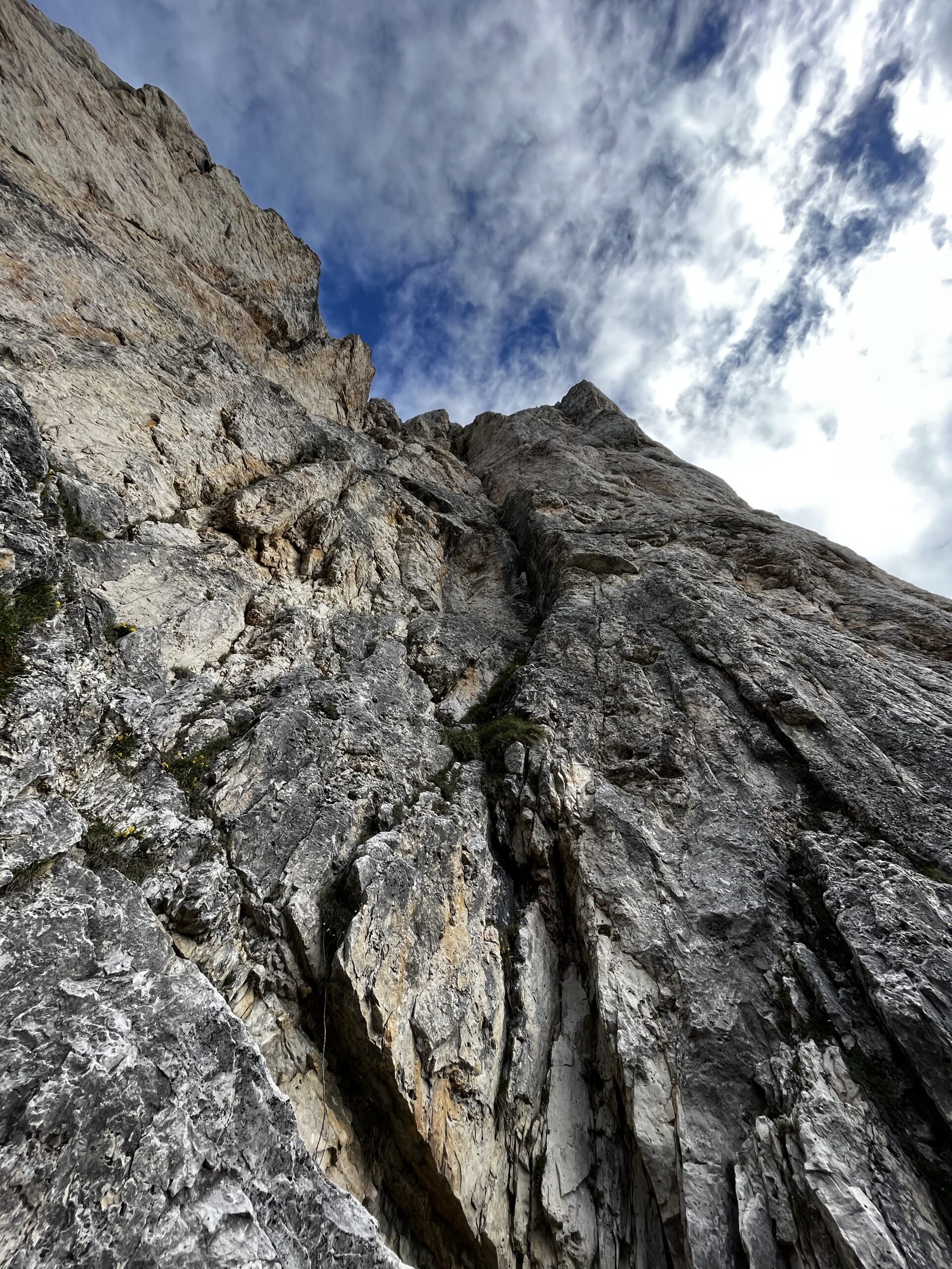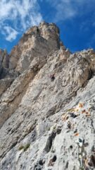 - L7: 45m 6a+, Tiro delicato in placca su piccole prese. Dalla sosta si attraversa la cengia inclinata verso sinistra fin sotto la placca (zero protezioni, primo spit con cordone all’inizio della placca verticale) . La roccia su questo tiro non è sempre compatta, soprattutto all’uscita ci sono molti massi instabili, prestare attenzione!