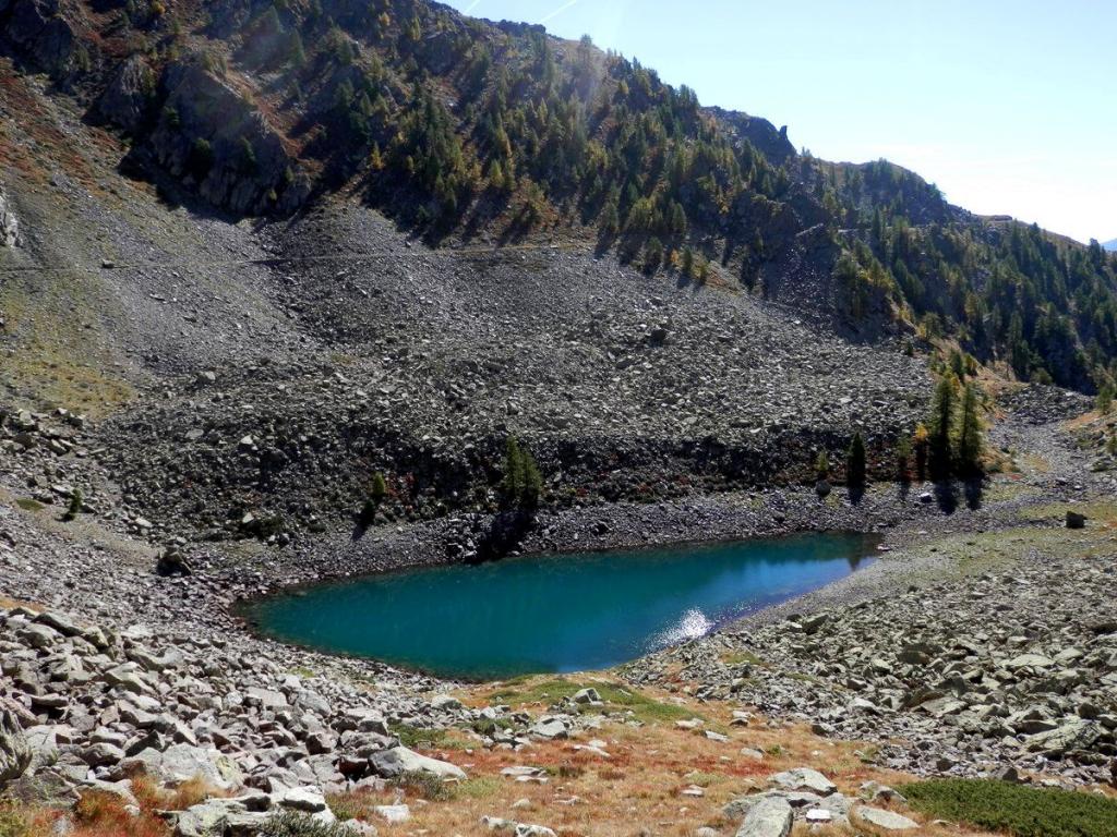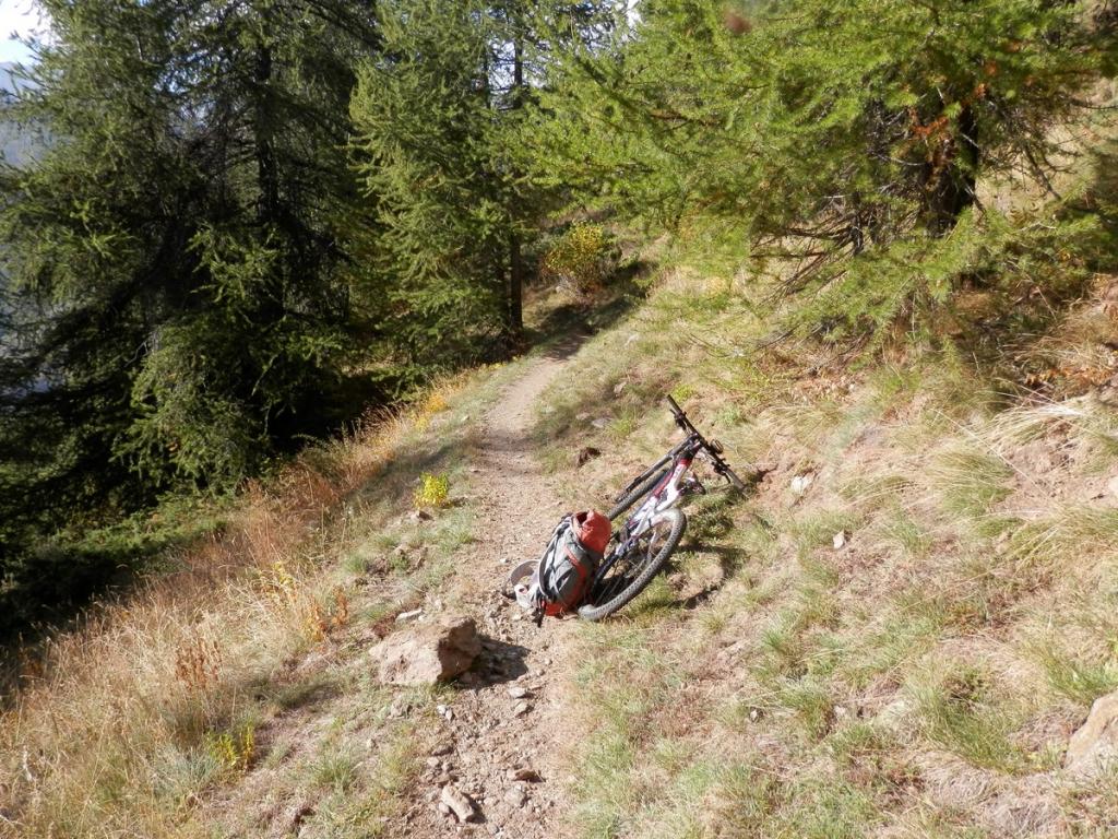 Alla grangia Clai Haute attenzione, se si prosegue su bella strada sterrata a destra non si va da nessuna parte, invece bisogna prendere il sentiero a sinistra che con 450 m di portage ci porta a scollinare proprio nei pressi del Chemin de l’Energie, lungo sentiero praticamente quasi in piano che taglia a mezzacosta; attenzione a non salire troppo partendo dall’ultima palina in legno se non si arriva sopra e bisogna scendere fino a raggiungerlo.