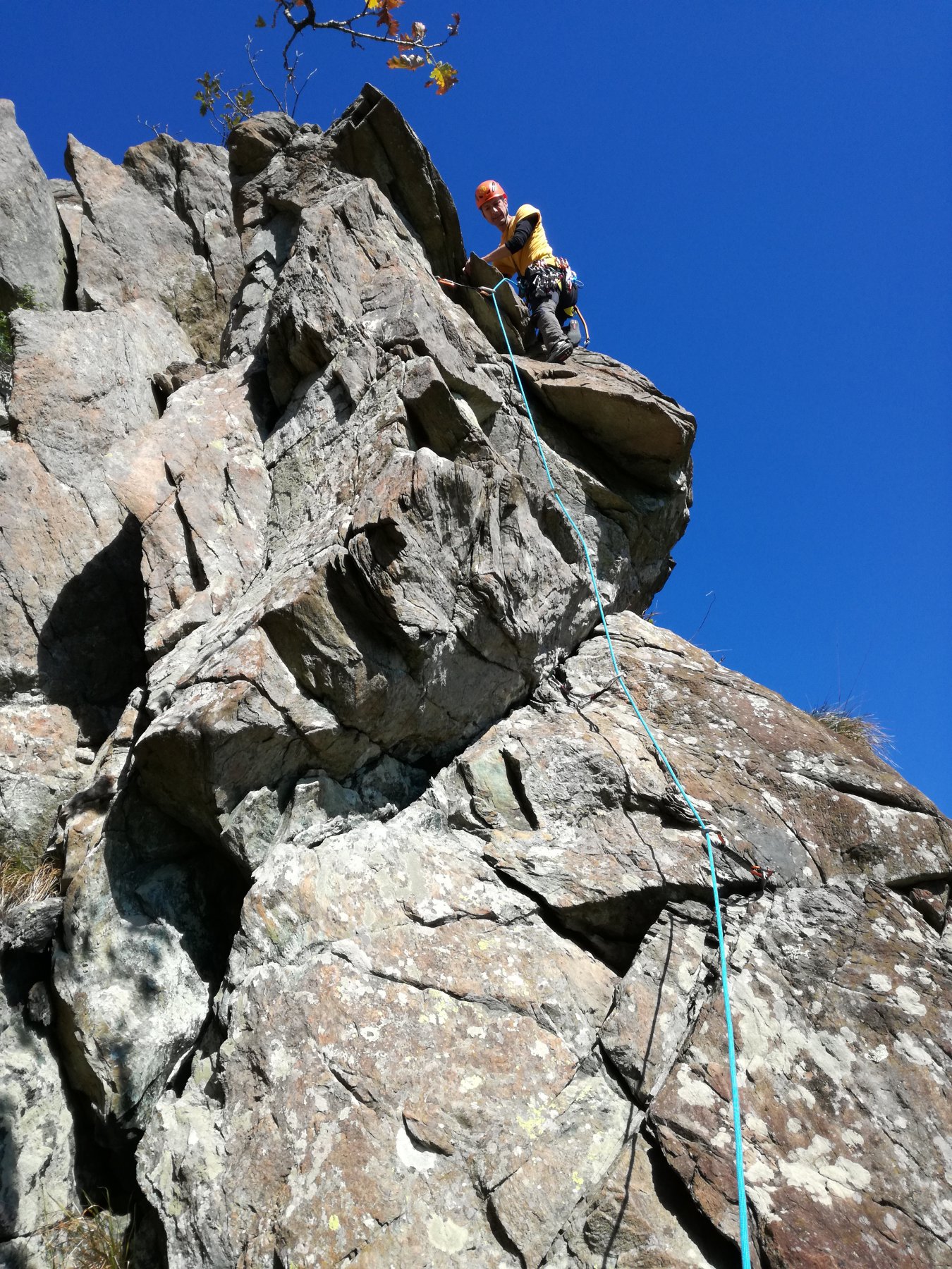 Si attaccano le placche a dx del filo, con arrampicata tecnica e difficoltà crescenti, fino alla base di un caminetto con rocce un po’ scagliose e strapiombanti; di qui si esce con movimenti più atletici, fino alla sommità del pilastrino (dal IV al V+; 3 ch. e 2 spit; 1 nut già posizionato all’interno del caminetto; sosta su piastrina subito all’uscita, oppure su ancoraggio di calata alla sommità del pilastrino). Dalla sommità del pilastrino si attrezza quindi una breve calata di circa 6 m. per scendere a monte, a dx del sottostante forcellino. Si torna quindi a camminare su pendio erboso in diagonale verso dx (al di sopra della caratteristica colata di massi) per raggiungere la base di una successiva crestina di rocce. Le rocce alla base della crestina sono ben poco invitanti; si prosegue quindi per alcuni metri nel canalino a sx del filo, fino ad una seconda solida pianta di quercia, per sostare sotto una più interessante paretina.