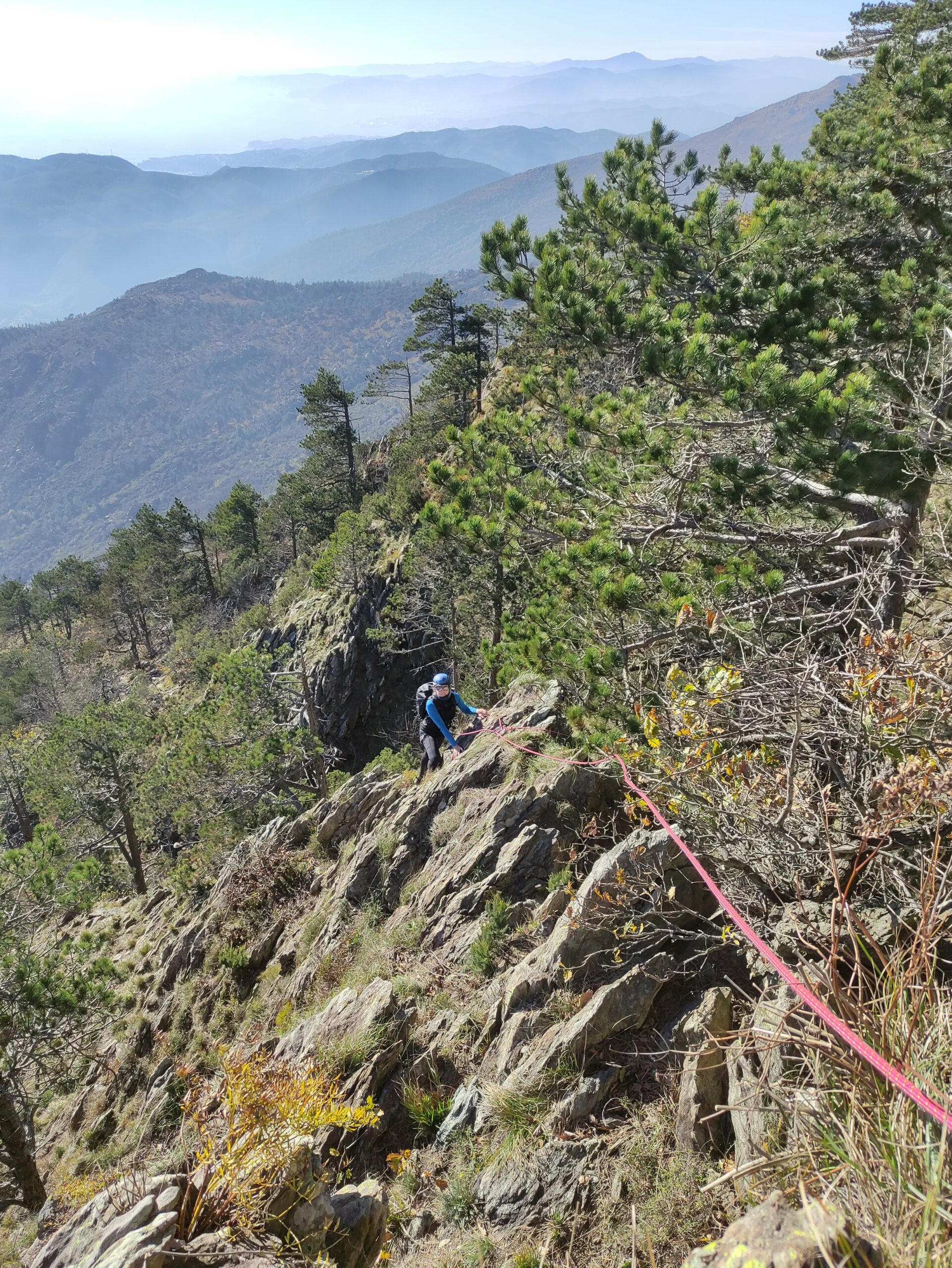 Da qui in poi si seguono le frecce e le tacche di vernice rossa, superando alcuni risalti rocciosi di II° e di III°, superata l’ultima balza, si segue il sentiero a tratti poco evidente fino a trovare la bella traccia che ripidamente porta in vetta.