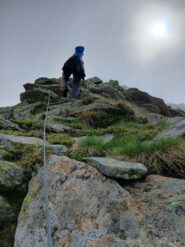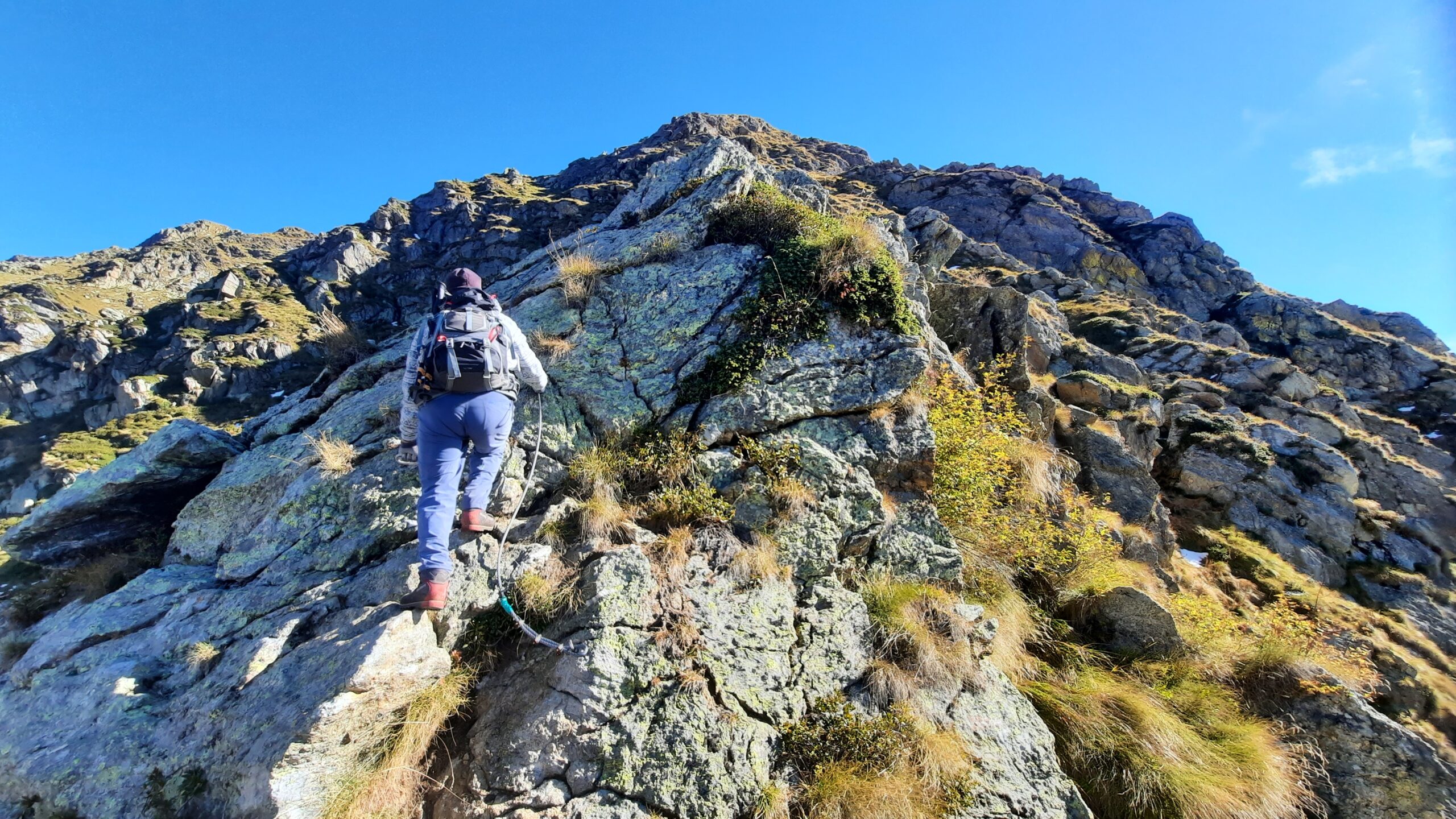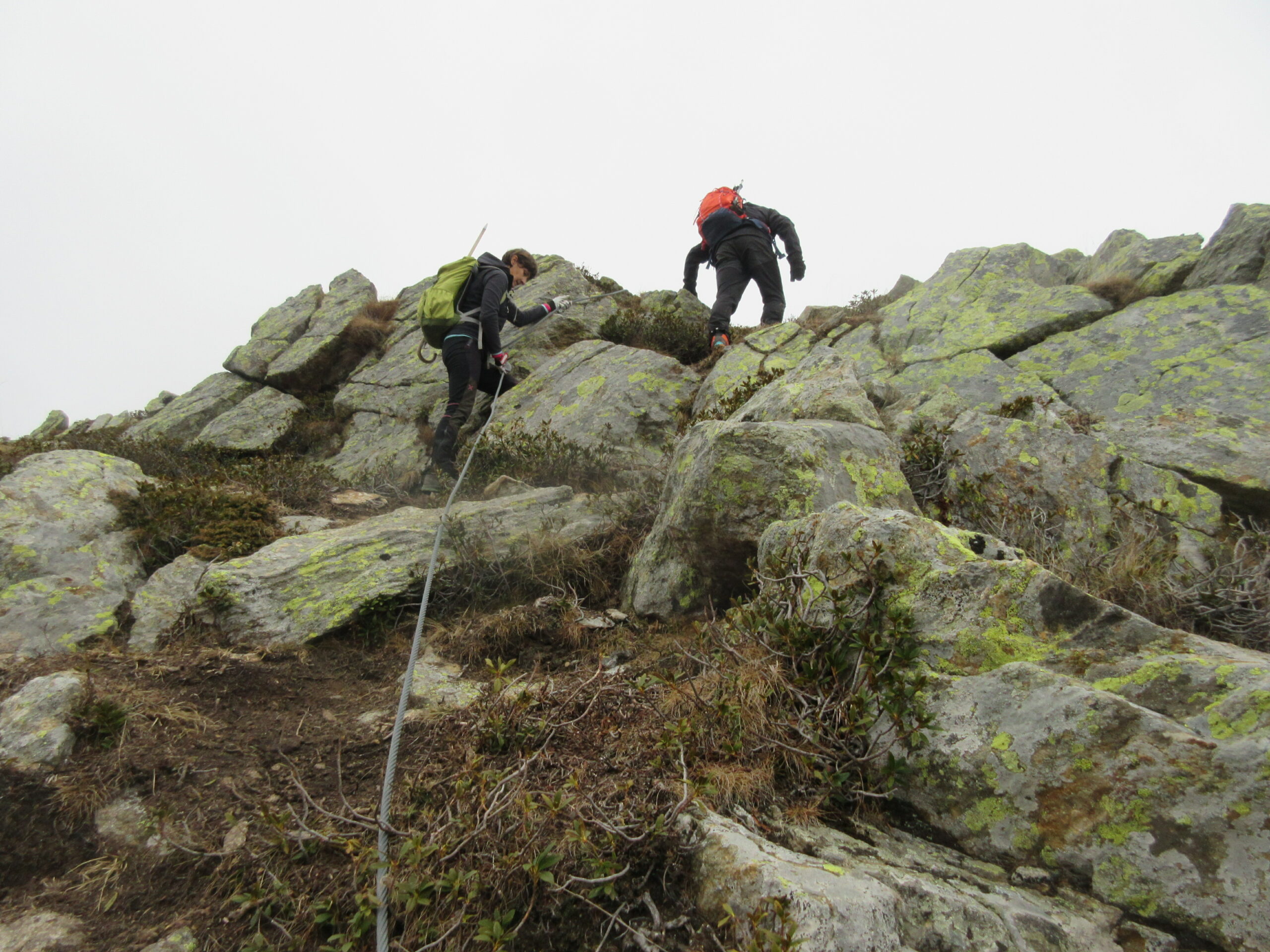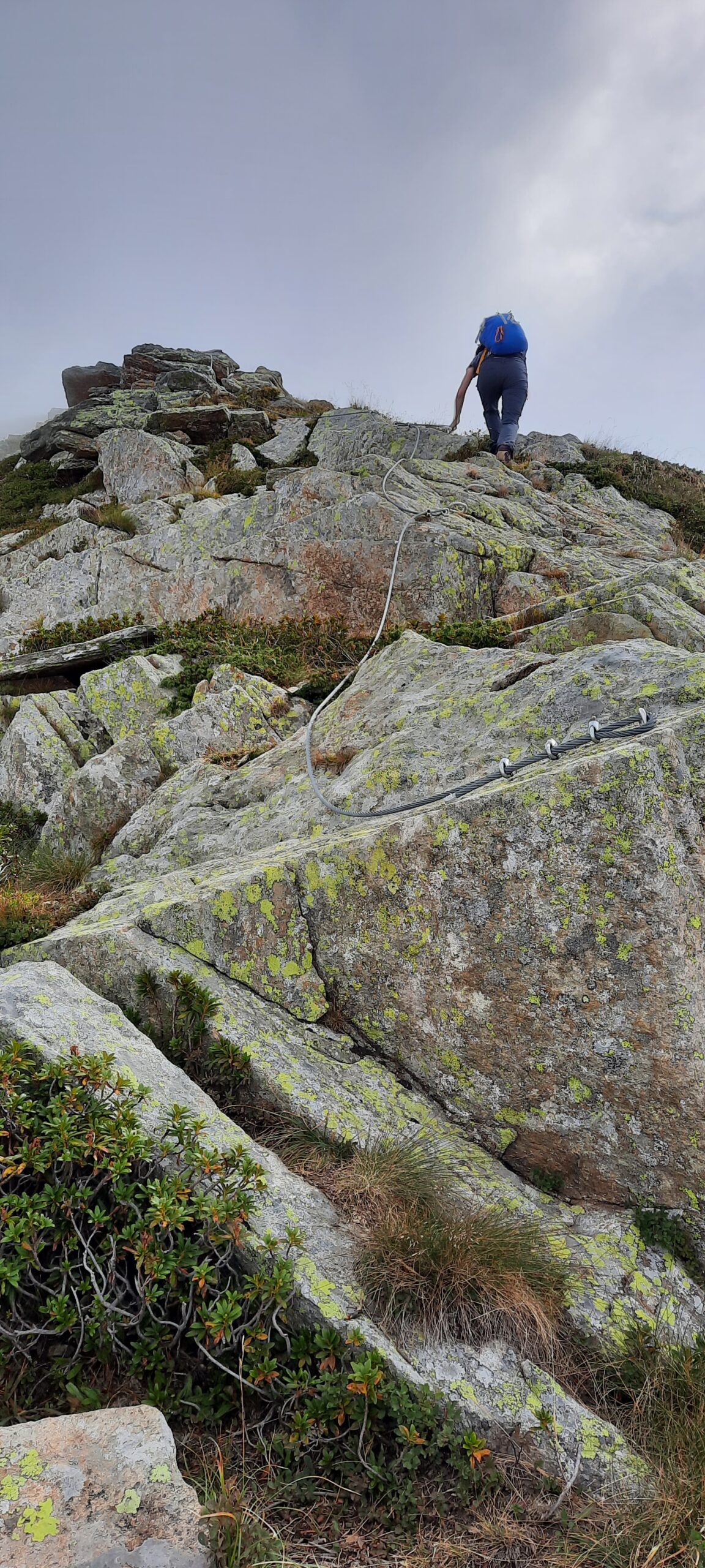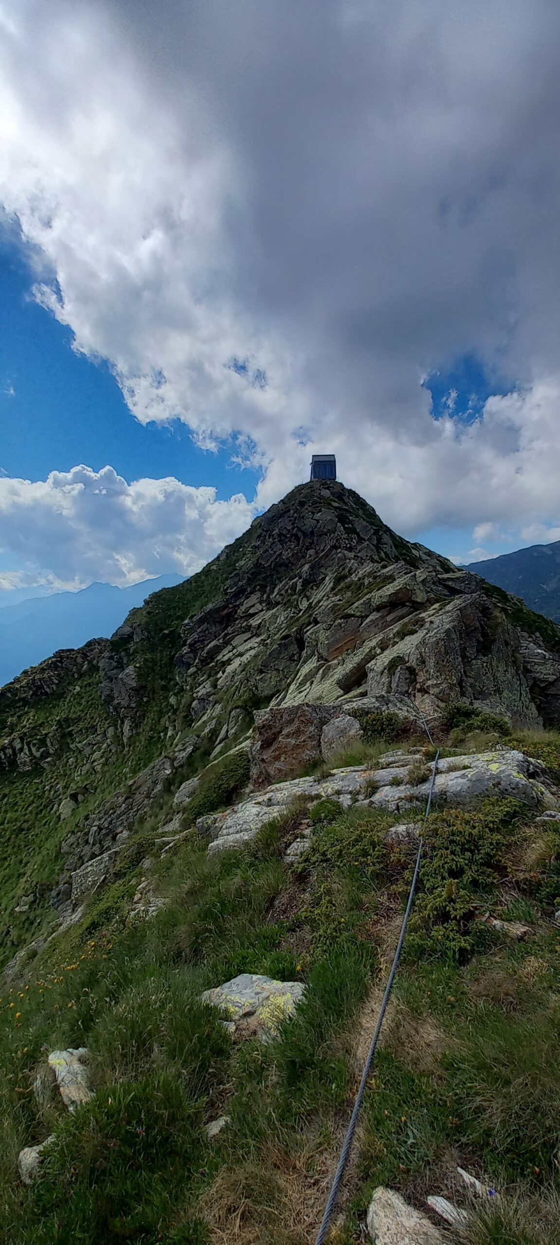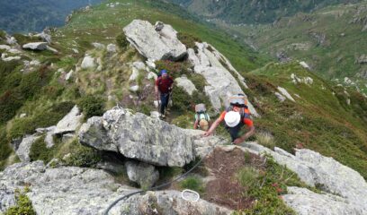 A 1800 m circa si giunge al poggio erboso con i ruderi dell’Alpe Liri, dove a destra si stacca il sentiero a mezza costa per i Laghi di Chiono. Si riprende a salire a monte delle baite, sul pendio erboso via via più ripido, finchè la dorsale diventa una sorta di cresta di roccette ed erba e si incontra il cartello indicante l’inizio del tratto attrezzato a circa 2100 m. Si supera immediatamente una breve placca con cavo e alcuni gradini metallici, prima di riprendere sul sentiero ora molto ripido tra zolle erbose. il percorso continua alternando sentiero a zone attrezzate finchè si sposta sul versante ovest per aggirare una zona di cresta più articolata. Attenzione, in questa zona che non si vede mai dal basso, è possibile incontrare neve anche ad inizio estate/tarda primavera.