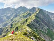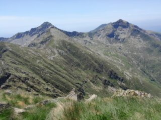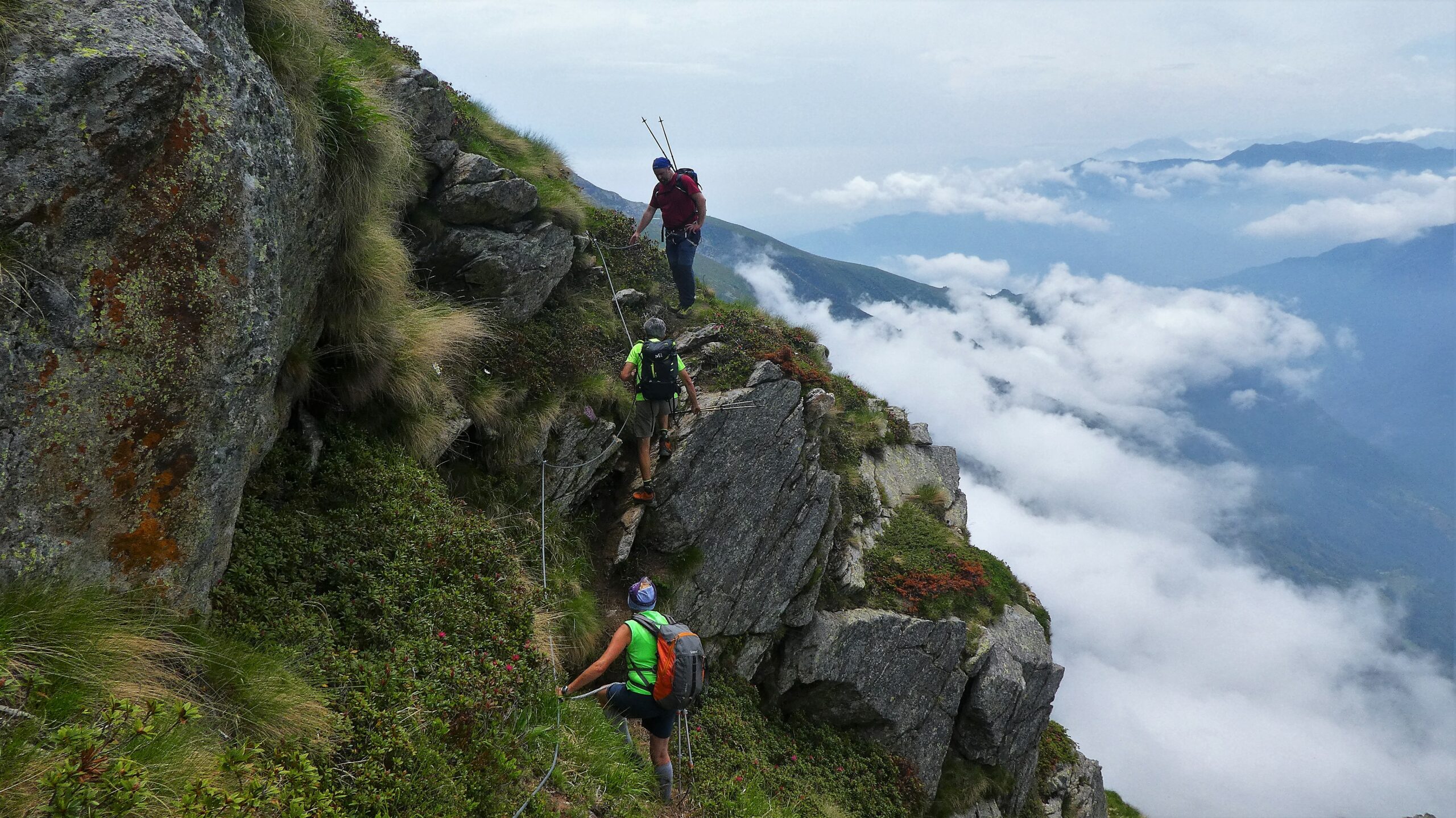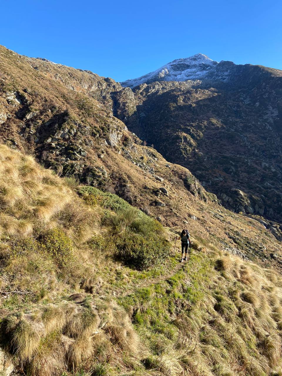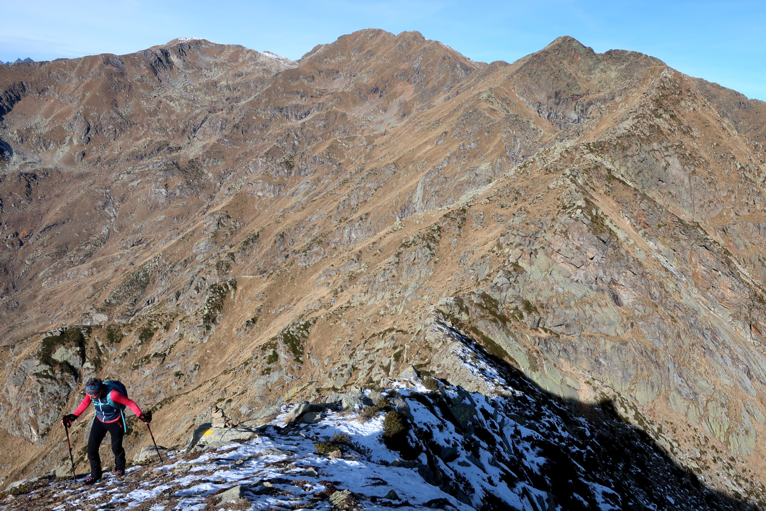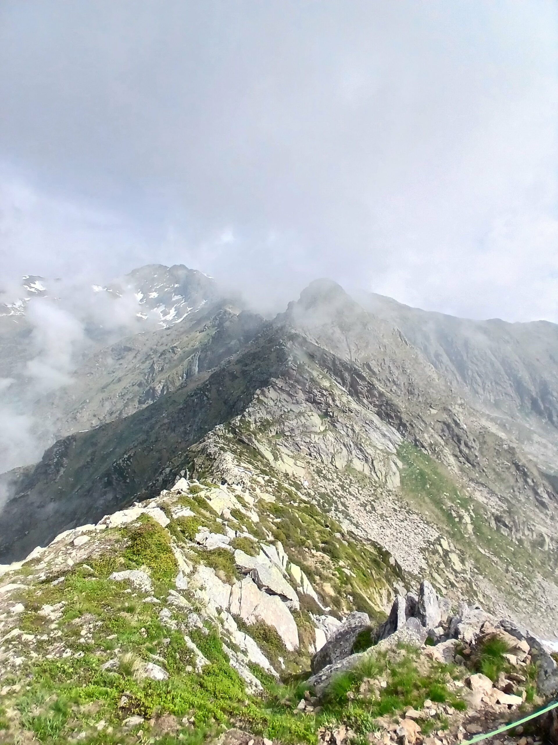 A 1800 m circa si giunge al poggio erboso con i ruderi dell’Alpe Liri, dove a destra si stacca il sentiero a mezza costa per i Laghi di Chiono. Si riprende a salire a monte delle baite, sul pendio erboso via via più ripido, finchè la dorsale diventa una sorta di cresta di roccette ed erba e si incontra il cartello indicante l’inizio del tratto attrezzato a circa 2100 m. Si supera immediatamente una breve placca con cavo e alcuni gradini metallici, prima di riprendere sul sentiero ora molto ripido tra zolle erbose. il percorso continua alternando sentiero a zone attrezzate finchè si sposta sul versante ovest per aggirare una zona di cresta più articolata. Attenzione, in questa zona che non si vede mai dal basso, è possibile incontrare neve anche ad inizio estate/tarda primavera.
