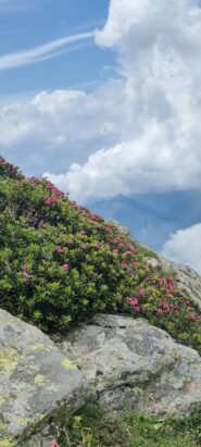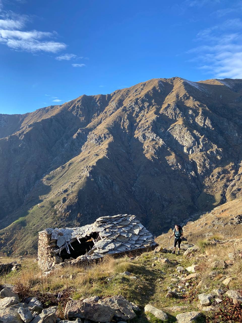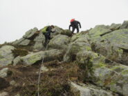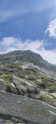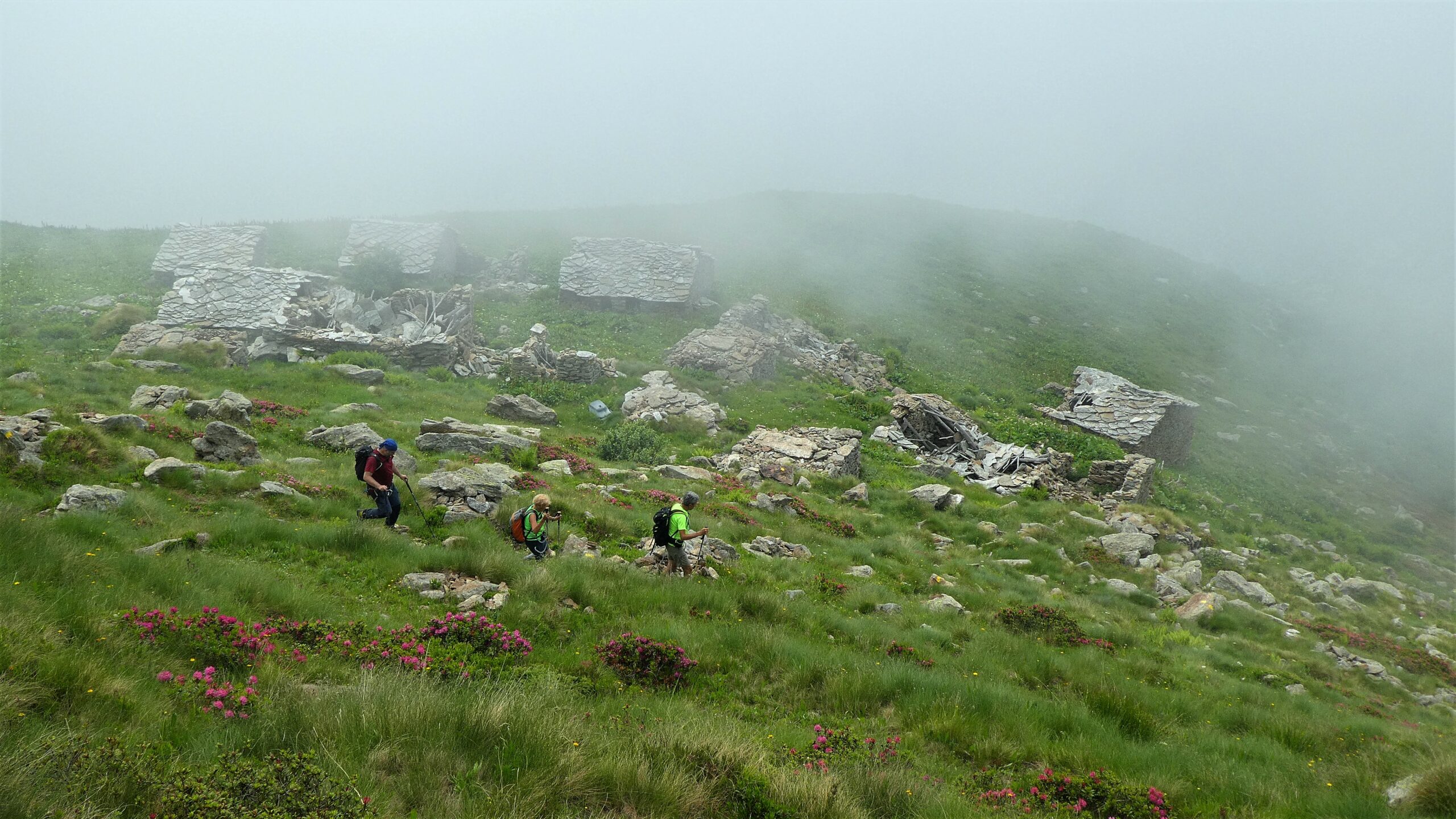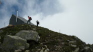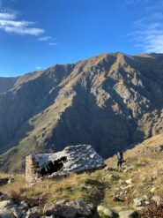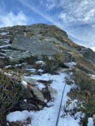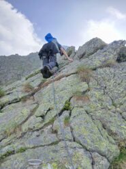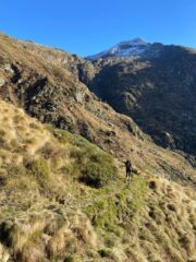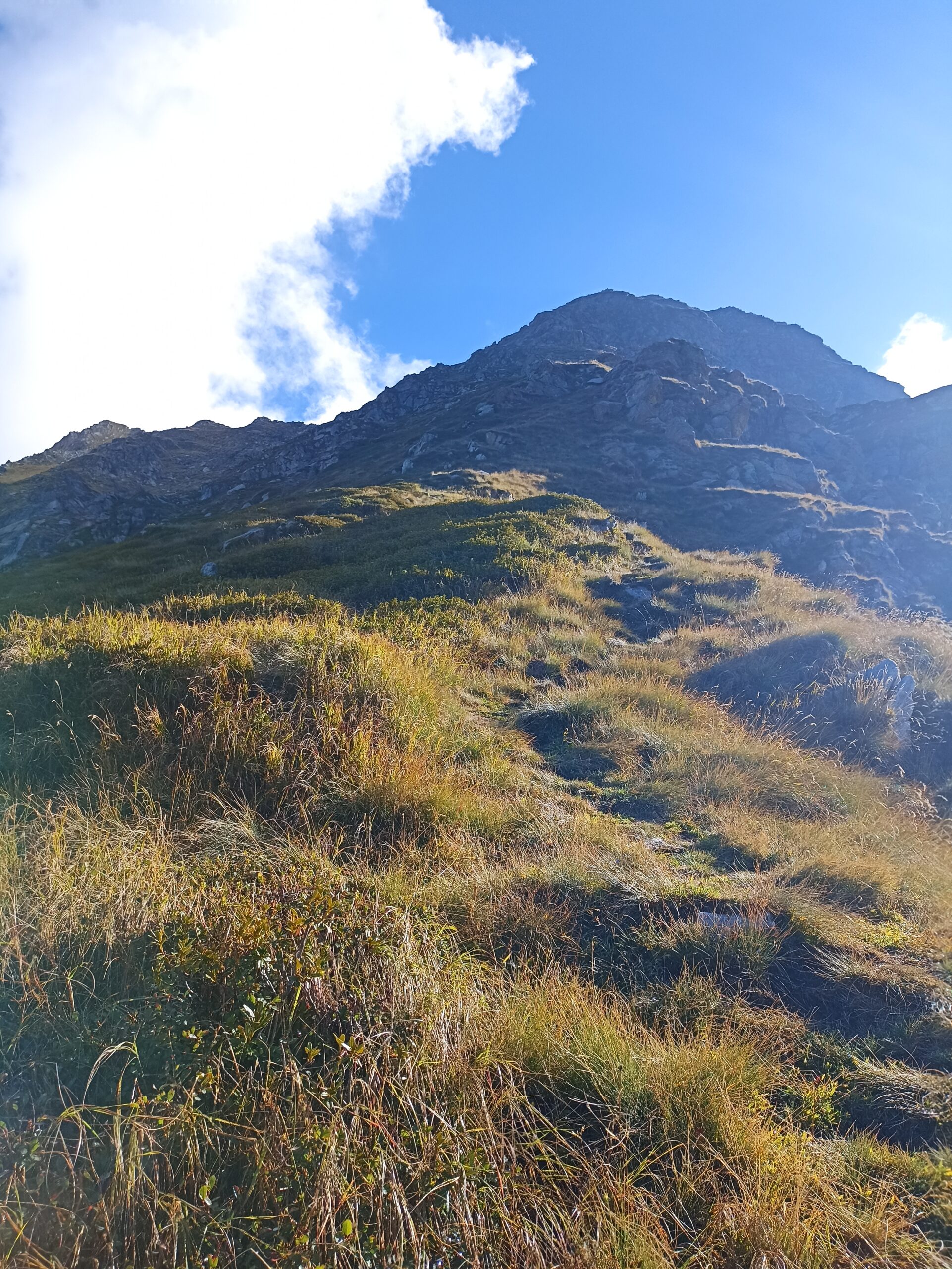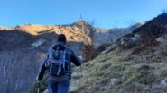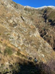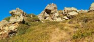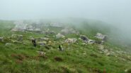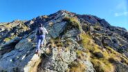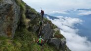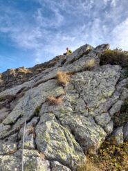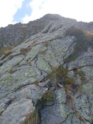 Si effettua prima un traverso su un terrazzino erboso, poi si riprende a salire per un pendio abbastanza ripido tra pietre e arbusti, prima di tornare sul crinale sud con il bivacco ormai ben visibile sopra le nostre teste.