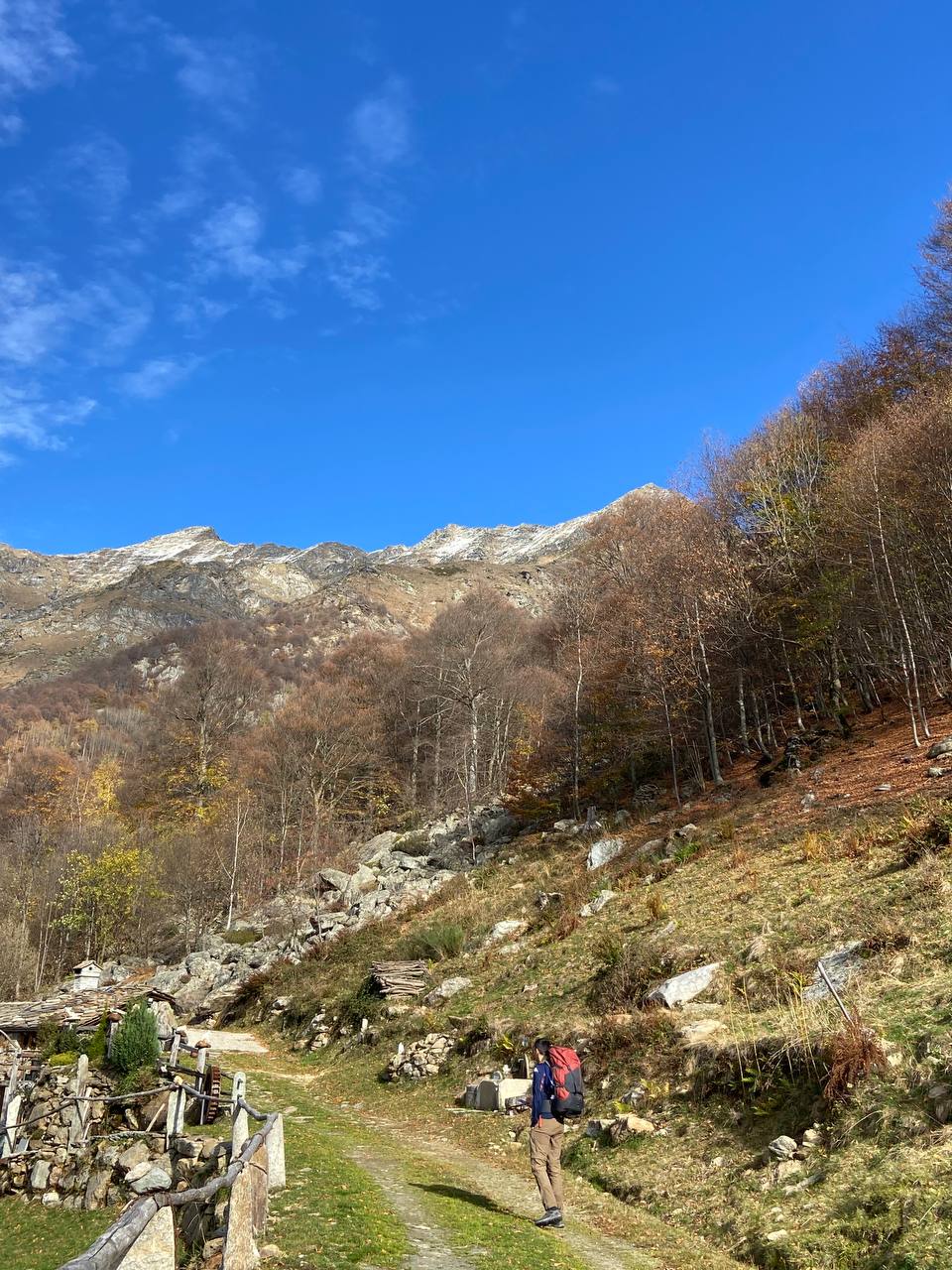 Da dove si lascia l’auto, salire a destra lungo la strada in parte cementata, in parte sterrata che porta all’Alpe Losa dove si incontra una fontana (si può anche partire da qui posteggiando in alcuni spiazzi poco prima della sbarra). Proseguire oltre la bella baita seguendo il sentiero n 8, ben segnato, che si addentra dolcemente nel bosco; ignorare il successivo bivio con il sentiero per i Laghi di Chiono. Usciti dal bosco si arriva alla radura con l’Alpe Piani 1500 m (ruscello, possibilità di rifornimento acqua).
