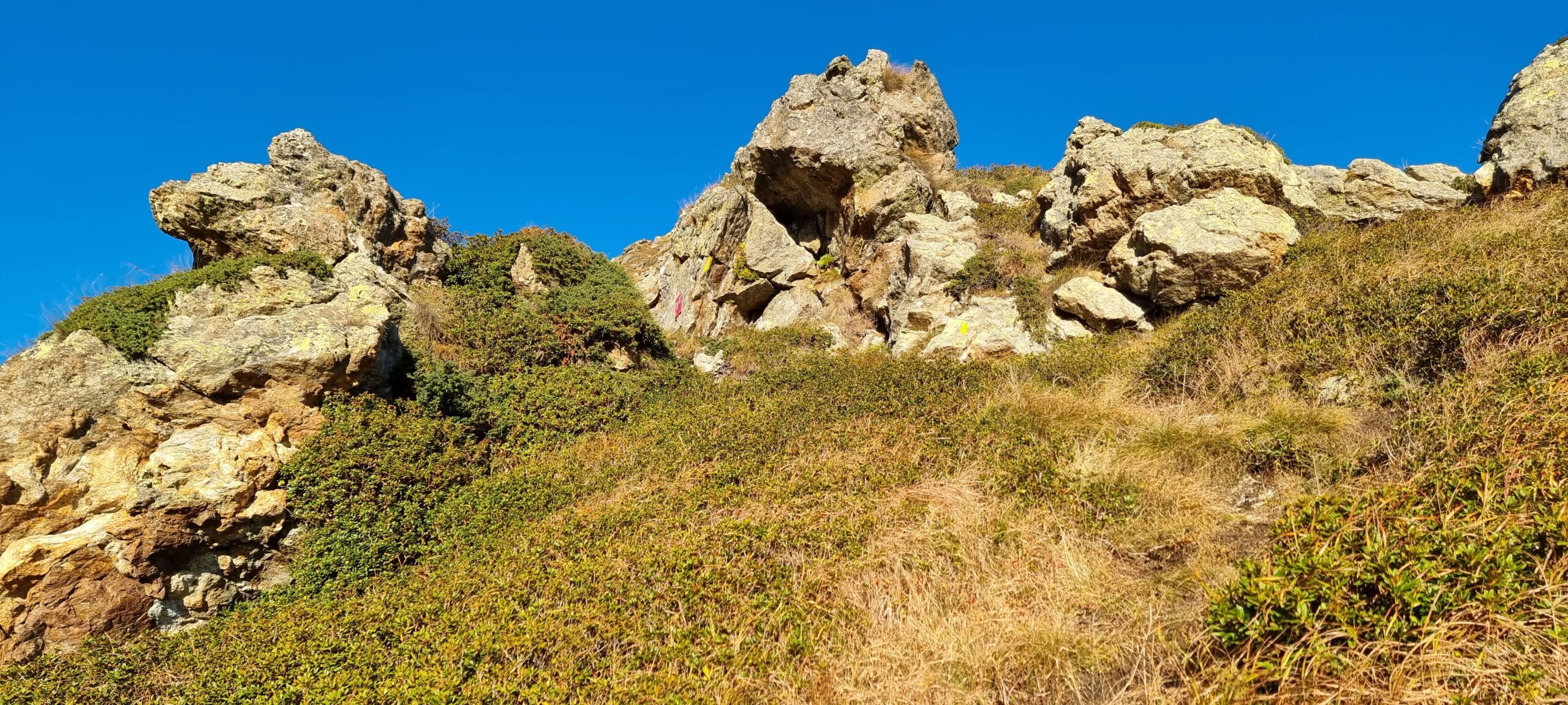 Attraversato il ruscello si continua fino a raggiungere il costone erboso di Punta Rama, si devia a sinistra iniziando a salire in diagonale per intercettare la dorsale sud. A circa 1600 m si incontra l’ultima fonte d’acqua (è presente un tubo bianco che spunta dal terreno, possibile che in estate sia asciutta).