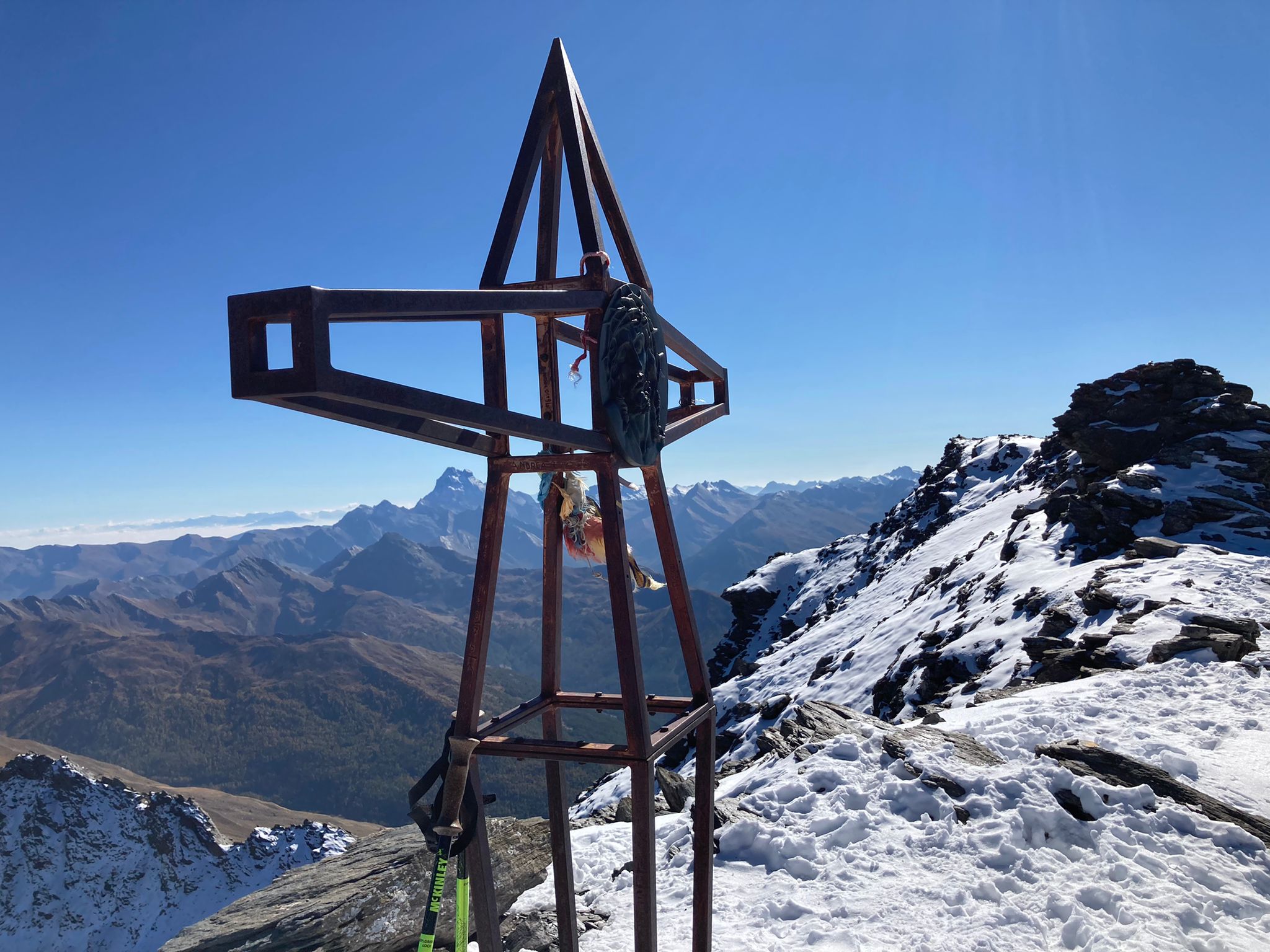 Tornati ancora alla Ramiere per la val Thuras., Giornata spettacolare con gli intensi colori dell’autunno. Il tratto dal parcheggio prima del ponte al bivacco Tornior è molto lungo, circa due ore, che pesano soprattutto al ritorno. Il bivacco è in una bella posizione, molto accogliente, ma non si arriva mai…. Appena sopra il colle della Ramiere abbiamo trovato neve, a tratti abbondante, anche con crosta. Questa volta avendo portato i ramponi, abbiamo proseguito fino alla vetta, con grandiosi panorami. Al mattino triste incontro alle grange Thuras superiori: tre cacciatori con un bel camoscio appena ucciso. Poi nessuno sul percorso.