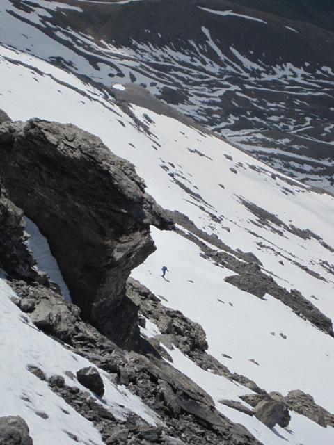 Saliti venerdi con pernottamento nell’accoglientissimo e confortevole bivacco Torhior a quota 2500n circa. Marcia di avvicinamento nel lunghissimo vallone con “portage” di quasi 1,45 ore!!! Salita alla punta sbagliando itinerario!! Abbiamo preso il vallone verso il colle Thuras che ci ha poi obbligato a salire i ripidissimi e non allettanti pendi del versante sud (lato Queyras), interrotti da una fascia rocciosa, che ci ha fatto perdere parecchio tempo obbligandoci poi a scendere (questa volta per il versante giusto!!) quando la neve cominciava ad essere già sfondosa. Eterno e faticoso traverso (tipo Dahu!!) dal bivacco in giù sul versante sin orografico per sfruttare il più possibile i conoidi delle valanghe cosi che al ritorno abbiamo ridotto il “portage” a solo un ora!!!