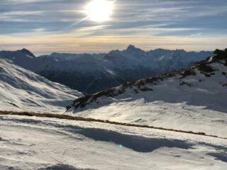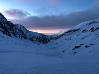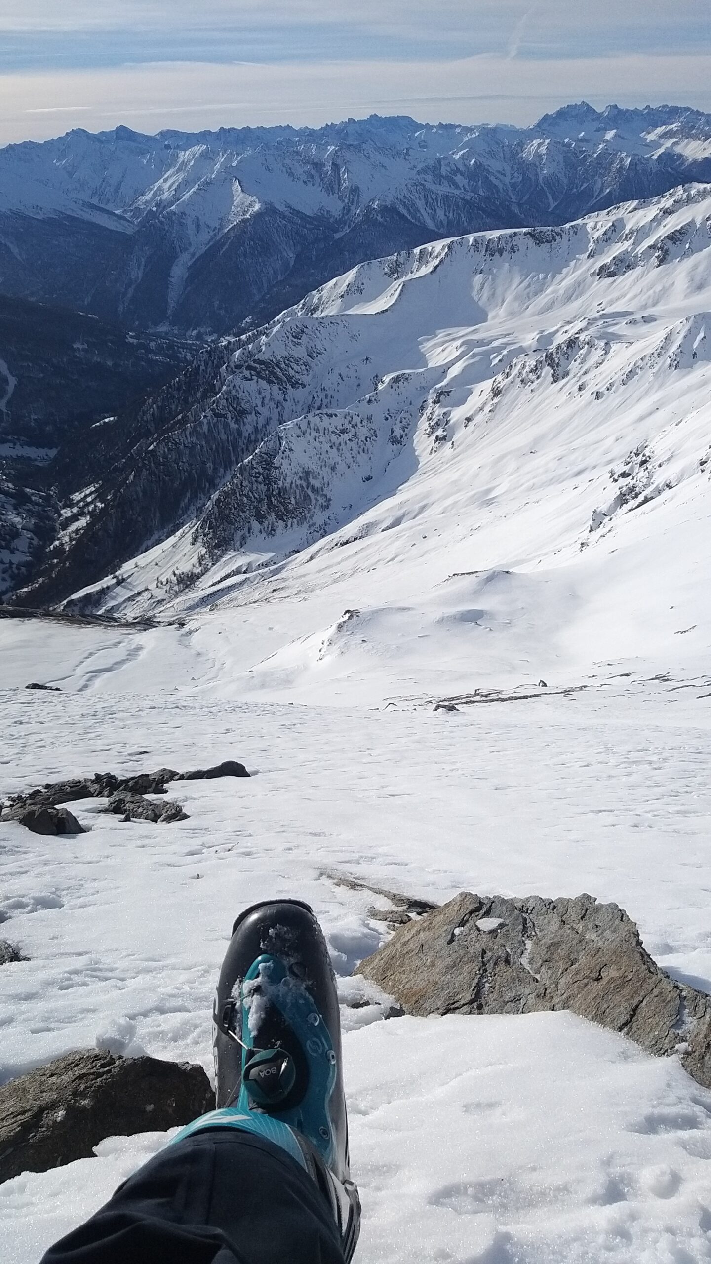 La neve a sud era trasformata, ma in cima non c’era neve, per gli ultimi 50 m, siamo scesi un pezzo con gli sci a spalle. La discesa l’abbiamo poi effettuata sulla valle argentera dal colle.