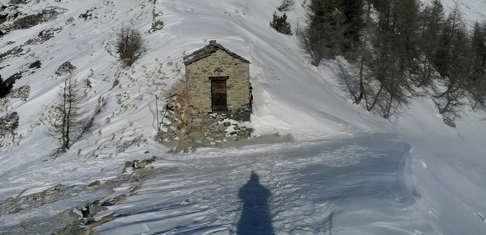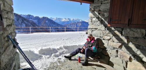 Dal piazzale di Estoul proseguito lungo la strada, pulita per un tratto. Poi bella traccia portante, anche se il vento aveva trasportato un po’ di neve. Arrivati alla baita, abbiamo deciso, nonostante il vento forte di proseguire per il Colle. In questo tratto si trova neve riportata dal vento dove si sprofonda (ciaspole in auto) e nell’ultimo tratto neve dura e ghiaccio (ma si passa tranquillamente. Arrivati al colle veloce dietrofront per il vento patagonico…