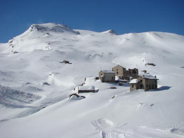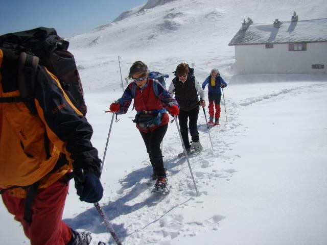 Neve ventata e ormai scarsa da poco sopra il rifugio Dondena (non più adatta allo skialp), ma ideale per la progressione con le racchette; prima sulla poderale pistone battuto dalla motoslitta e dai numerosi passaggi.